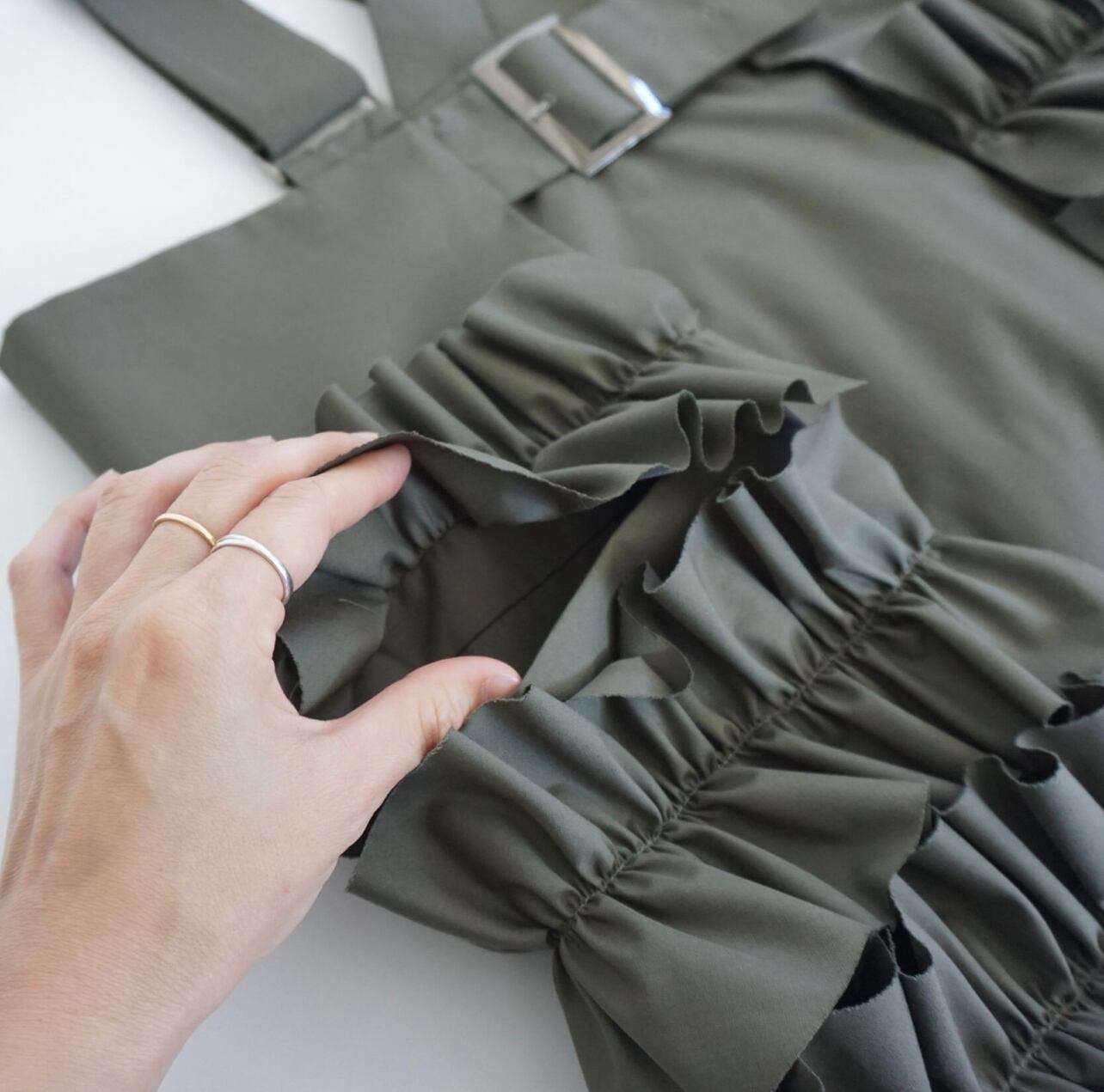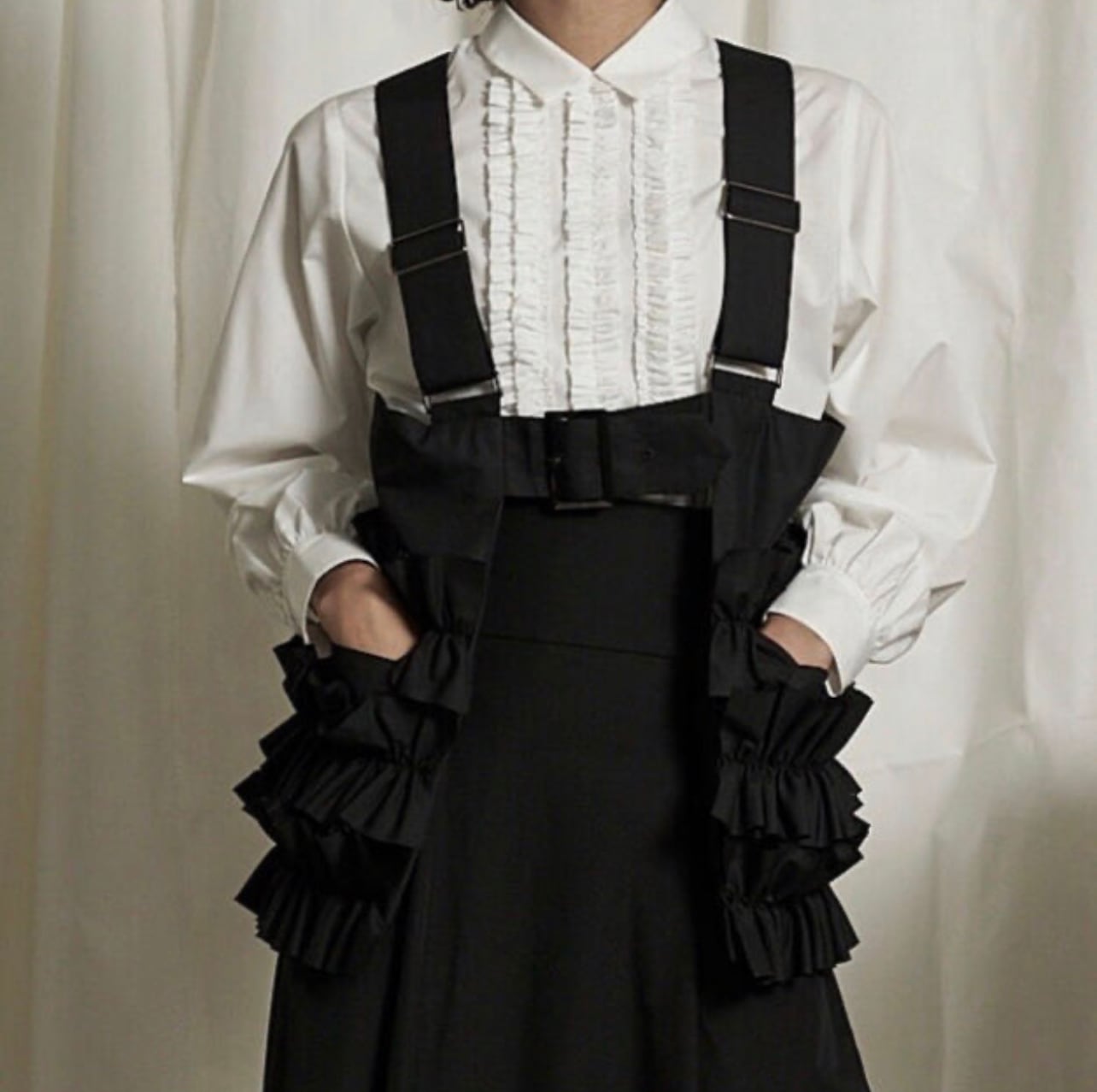 シンプルなシャツやTシャツなどなんでもないお洋服に加えると変化ができ、楽しめる1枚になると思います。フリル部分に隠しポケットが付いています。なのでポケットのないワンピースやスカートに合わせて着ると、ポケットとしても便利に使うことが出来るようにしました。白いTシャツとロングスカートなどに合わせてみてください。コーディネートに華やぎが出ると思います。普通のお洋服の着方に飽きてきたという方にぜひ。