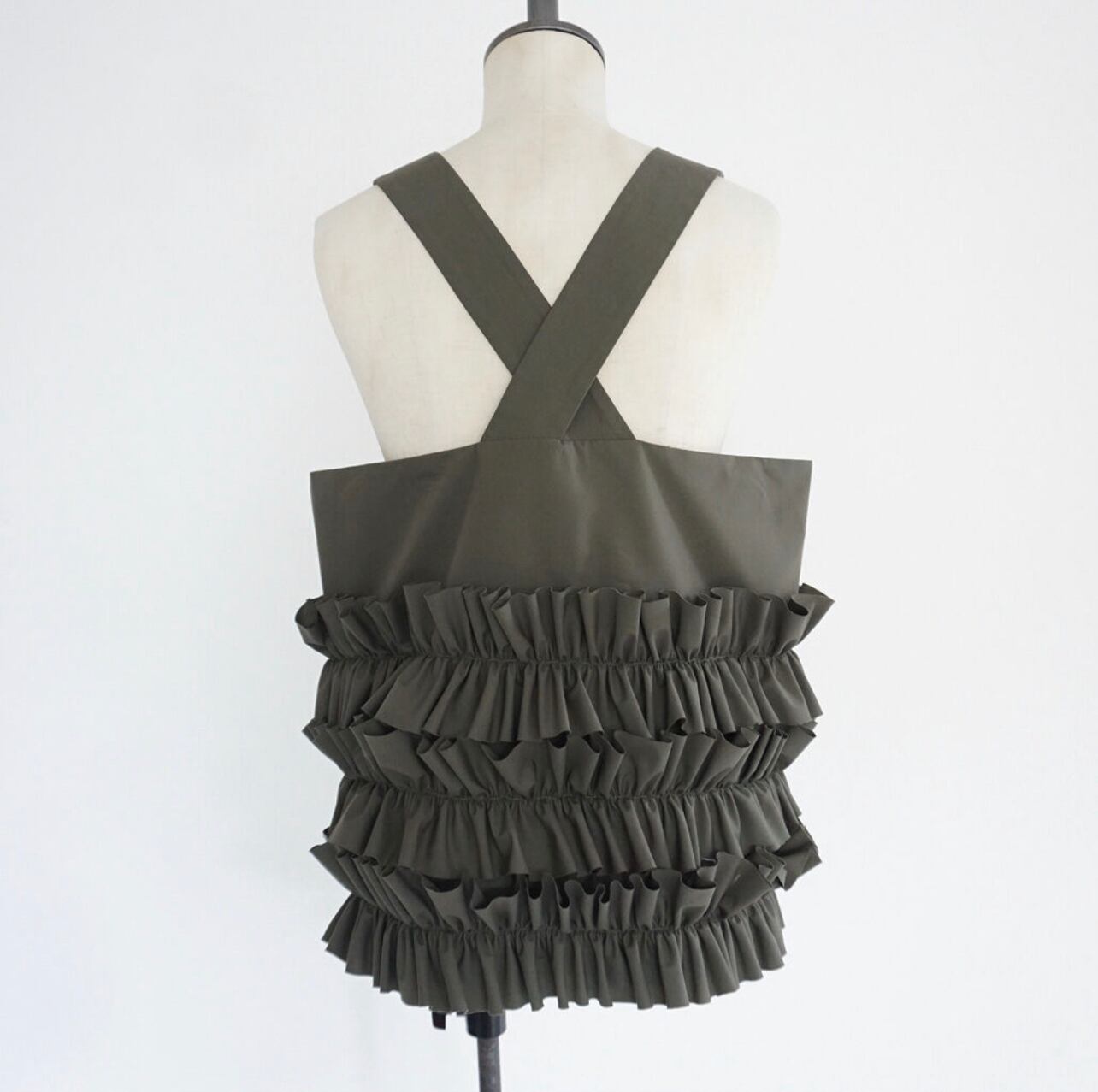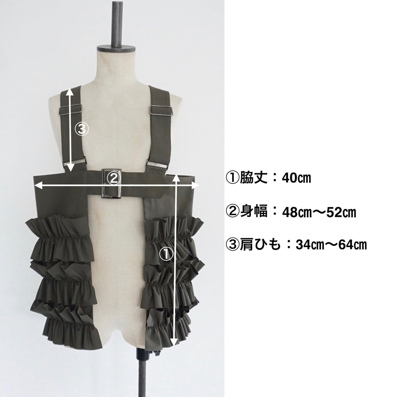 このフリルベストはAライン気味に少し修正できないか検討中です。(未決定)長さはベルトで調整が可能。また胸のベルトでサイズも調節ができます。