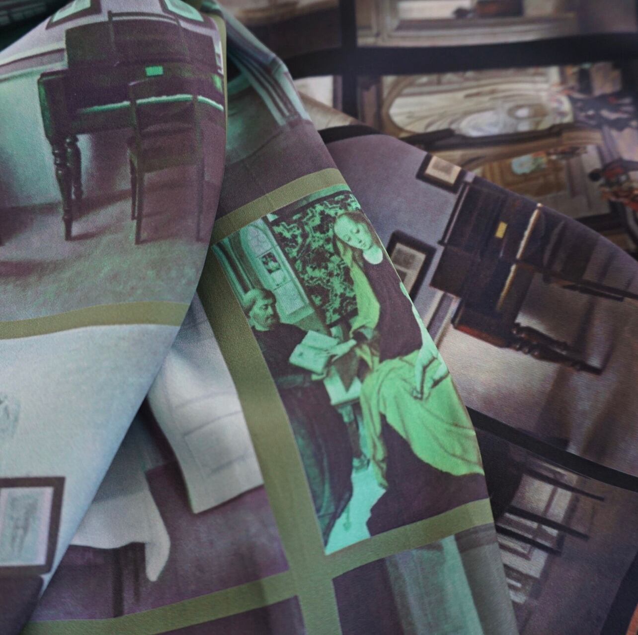 プリントはヴィルヘルム・ハマスホイの絵画プリントにしました。1800年代後半のデンマーク画家で最近特に好きな画家です。静かなドアのある室内、グレイッシュな色使いがとても好みです。規則的にハマスホイの絵画を並べてテキスタイルを作りました。
