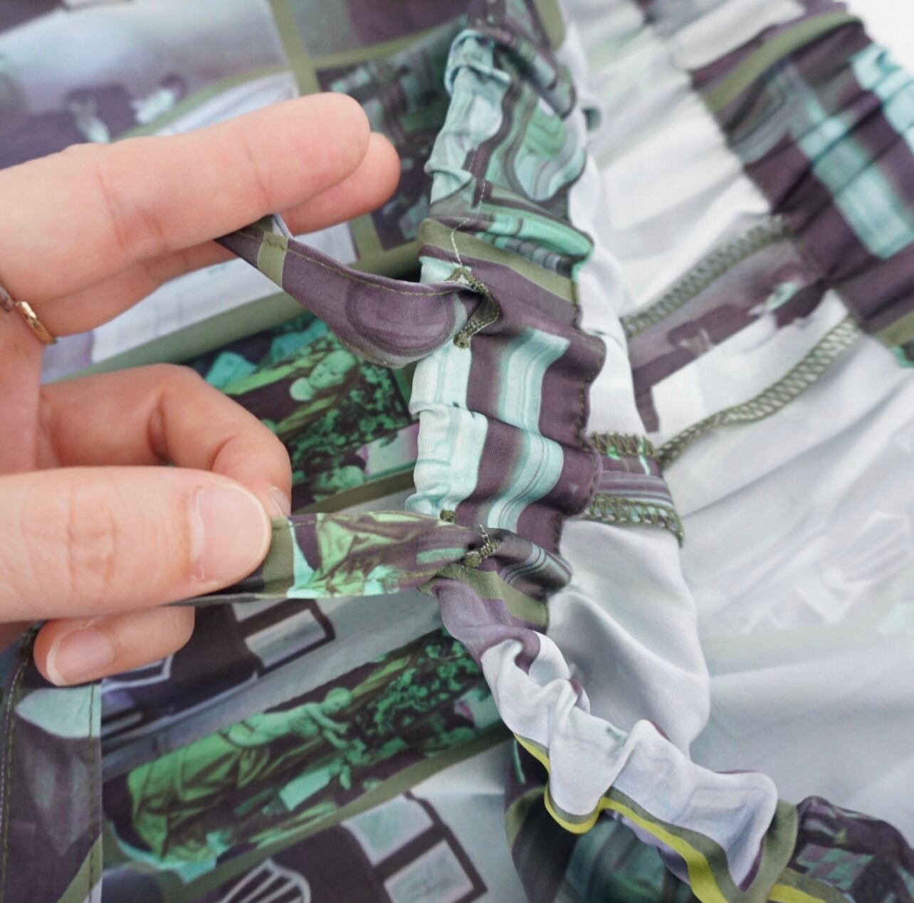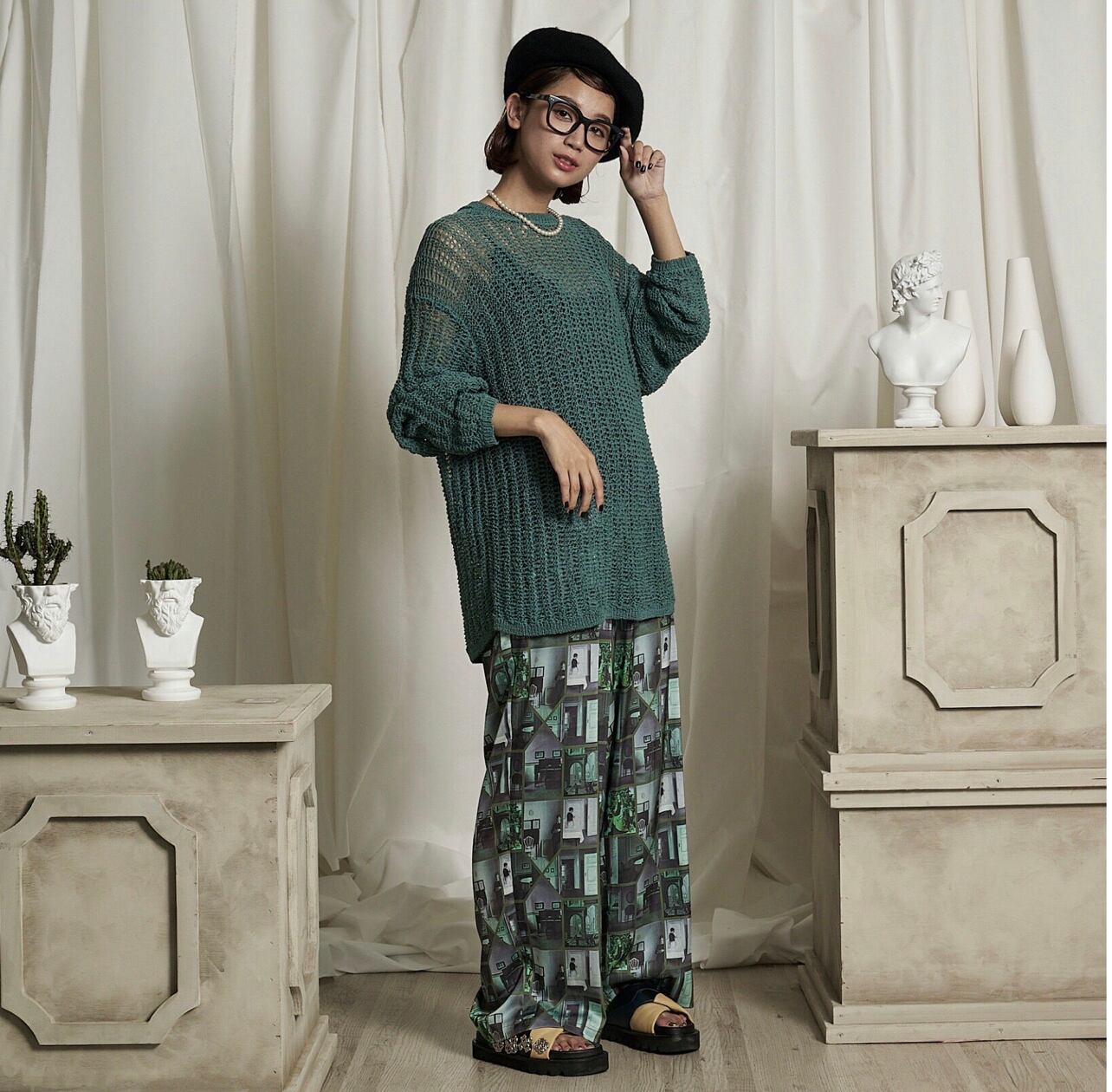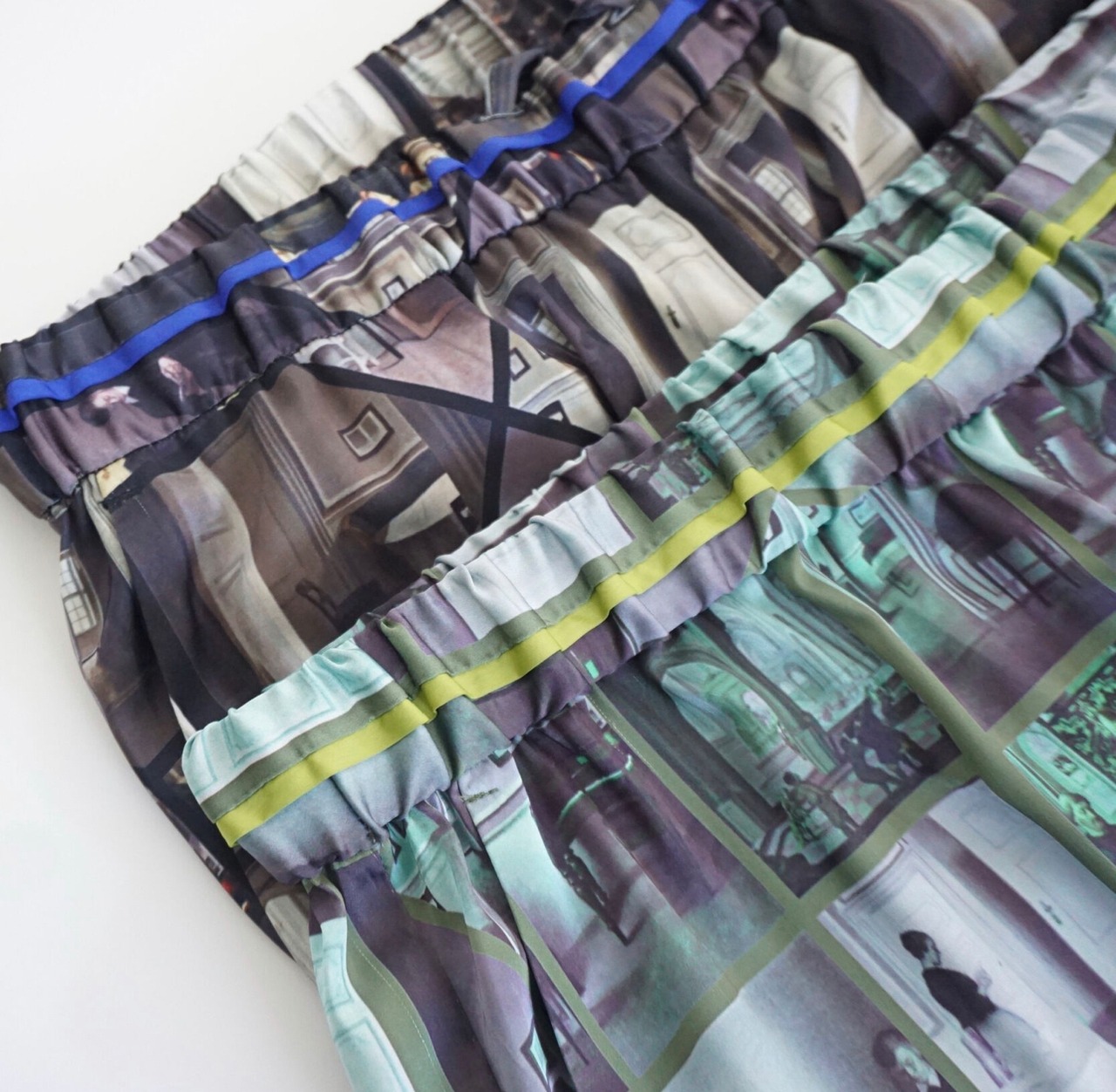 いつものイージータイプのパンツをオリジナルプリントで作っています。ポリエステル100%で洗濯可能です。サイズはゆったりでウエストはゴム、細い方でも着ていただけるようにウエストにリボンをつけて絞れるようにしています。体型を選ばずとても着やすく肌触りも良くすべすべの素材になっています。今回は素材に重みがあり落ち感があるのでほっそりと見えます。ウエストにはポイントにラインを入れています。トップスをインしてもウエストマークがはっきりするようにラインを入れてカジュアル過ぎないデザインにしました。