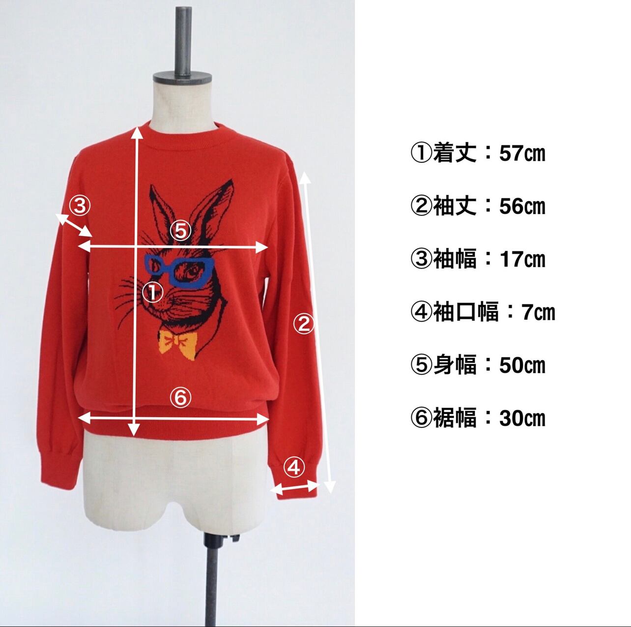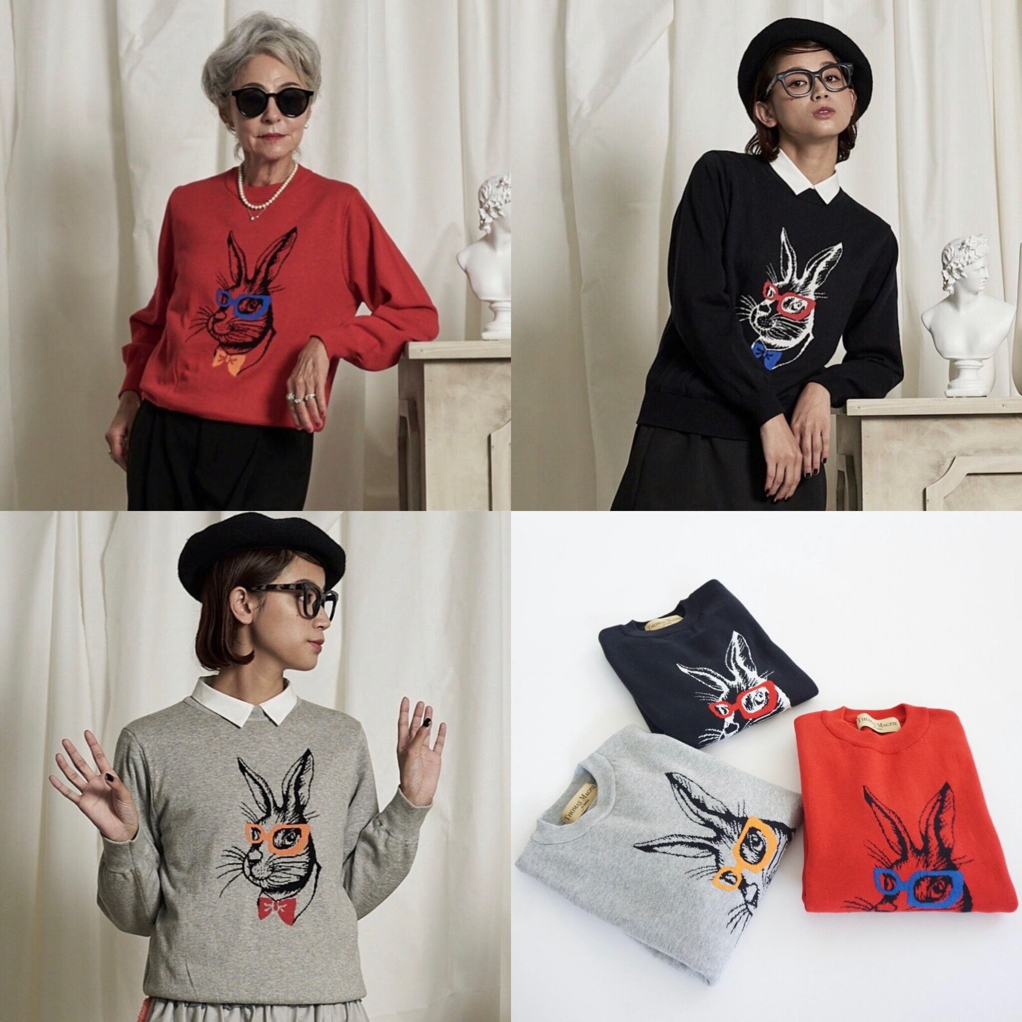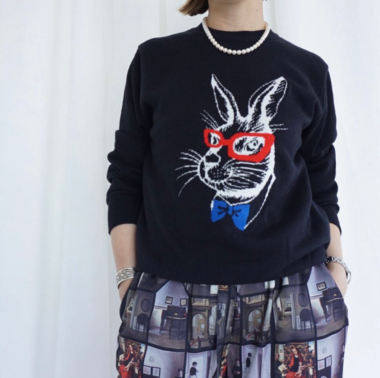 カシミヤ混のコットンニットで優しい肌触りです。柔らかでふんわりとした糸です。前身頃はジャガード織りでウサギの絵を編み込んで作っています。今回は擬人化したアニマルモチーフにしてみたいと思いました。手描きでウサギを描いたものを織り込んでもらいました。私の手書きなので少し下手な絵もご愛嬌。メガネをかけてポップなデザインにしてみました。また蝶ネクタイをしていています。