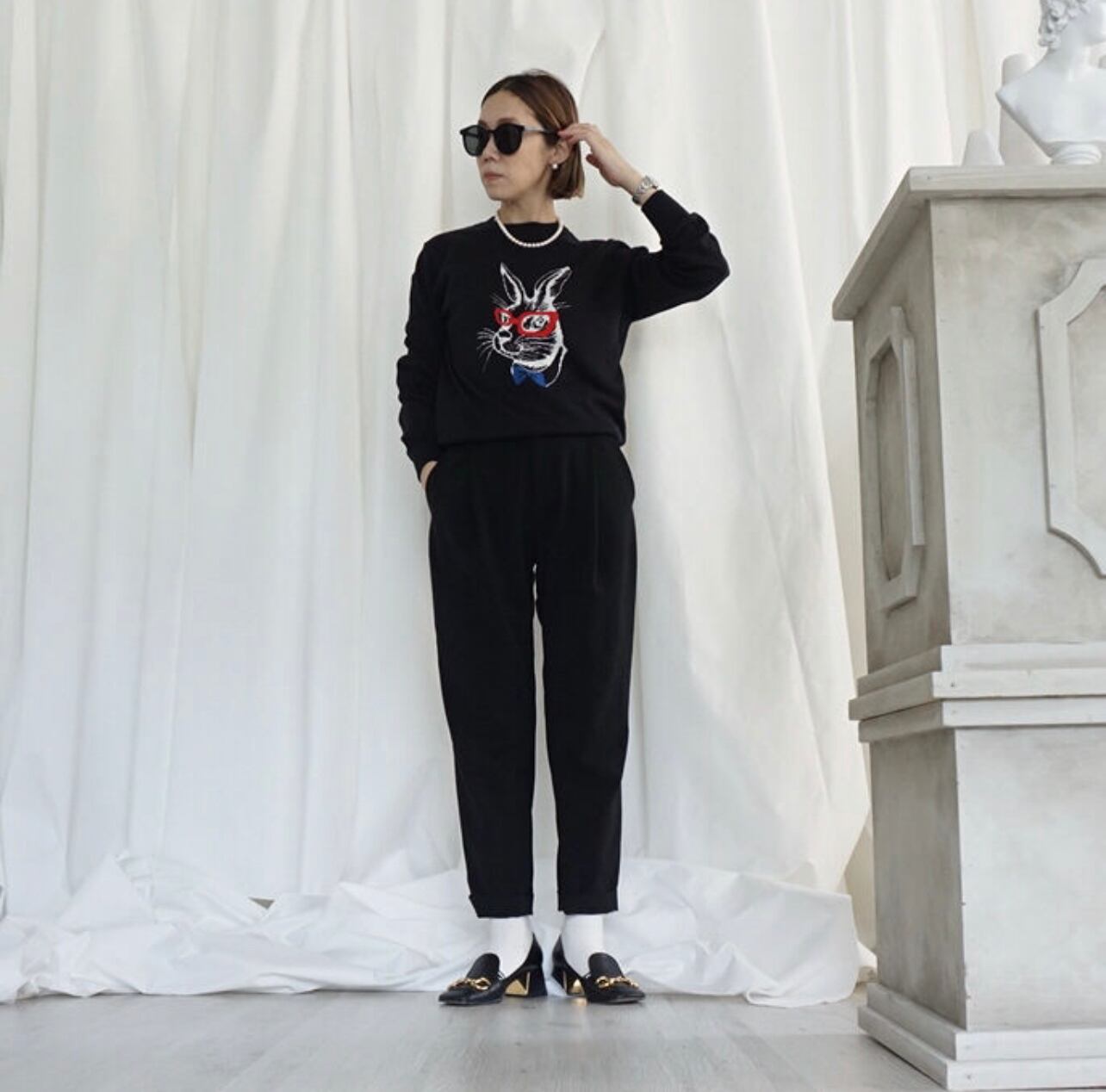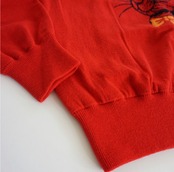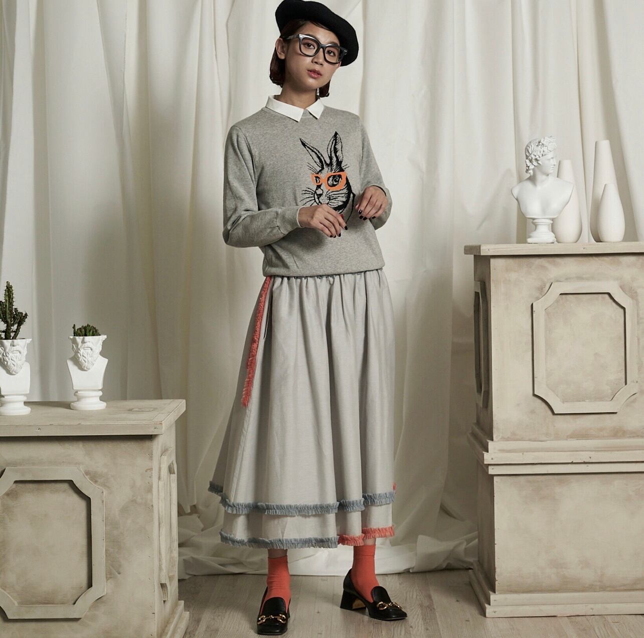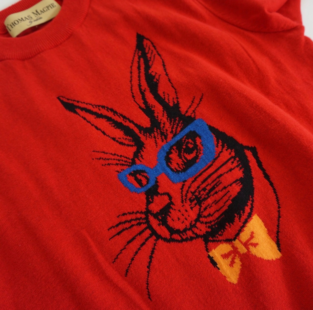 カシミヤ混のコットンニットで優しい肌触りです。柔らかでふんわりとした糸です。前身頃はジャガード織りでウサギの絵を編み込んで作っています。今回は擬人化したアニマルモチーフにしてみたいと思いました。手描きでウサギを描いたものを織り込んでもらいました。私の手書きなので少し下手な絵もご愛嬌。メガネをかけてポップなデザインにしてみました。また蝶ネクタイをしていています。
