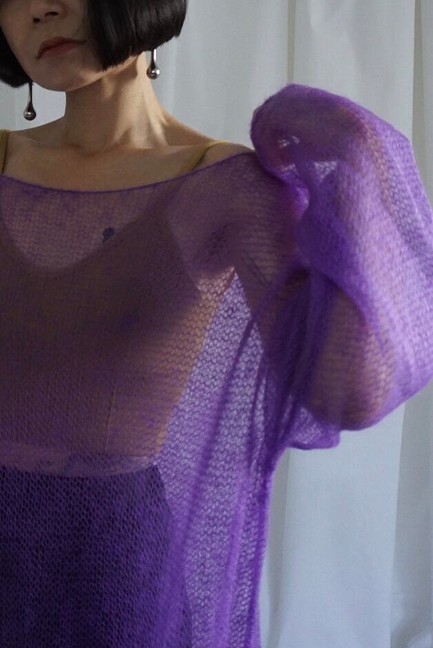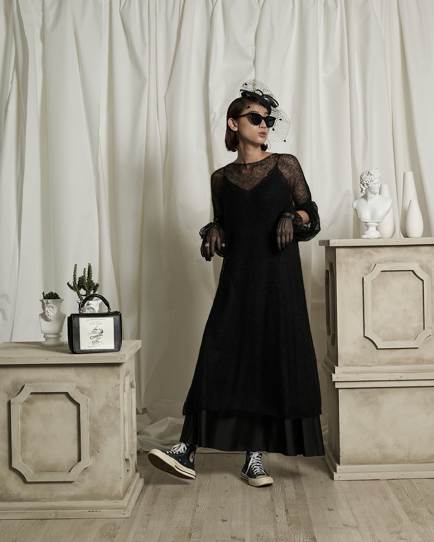 モヘアは昨年から人気の素材ですが、今年は更に甘編み、薄く緩く編んだものにしています。今回の提案は、モヘアを秋冬だけではなく、春先までのお勧めとして3本取の糸を2本取にして薄く透け感をアップさせてみました。そしてセーターならば沢山世に出回っていますが、今回は長めの重ね着のワンピースとして提案したいなと思いデザインしました。モヘアでの機械編みの限界まで緩くしています。素材はキッドモヘアで柔らかな肌触りです。春は中にタンクトップやノースリーブなどでオーガンジーやチュール素材のようなイメージで合わせてもらいたいなと思っています。ポサポサとしたモヘアの柔らかな毛がチュールなどの透ける素材とは一線を画し、少しお洒落なアイテムになりそうな気がします。かなりのオーバーサイズになっていて着る人の体型は選びません。重ね着に楽しめるものは何か?と考えた時に昨年はロゴTシャツなどとよく合わせてセーターを着ていましたが、今回はワンピースの重ね着ででアップデートして着たいなと考えます。