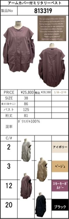 予約販売【 ayane 】アームカバー付ミリタリーベスト(813319)