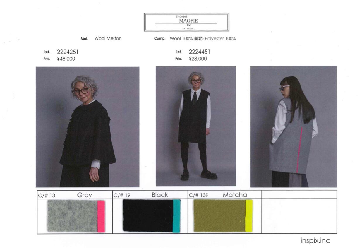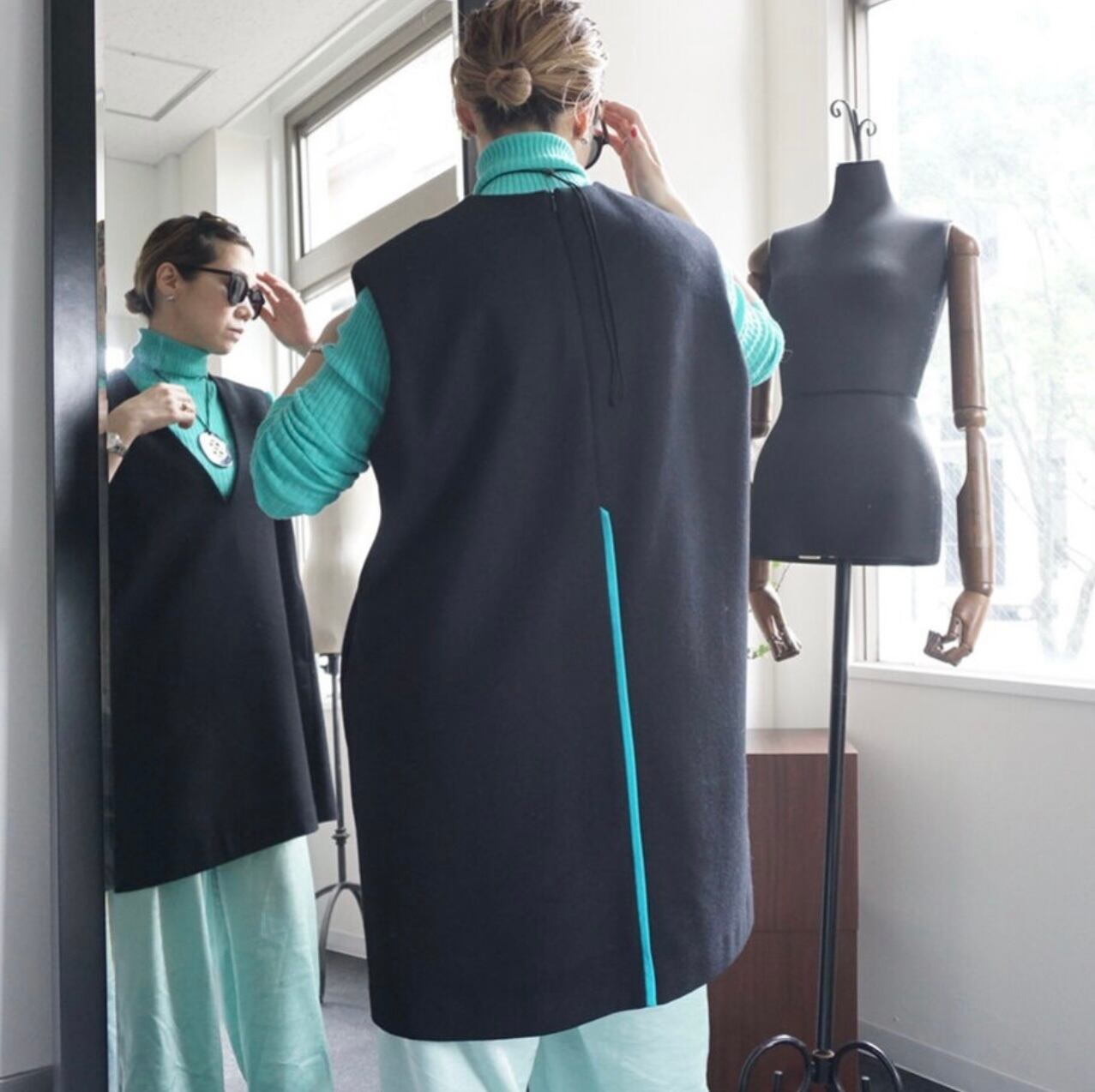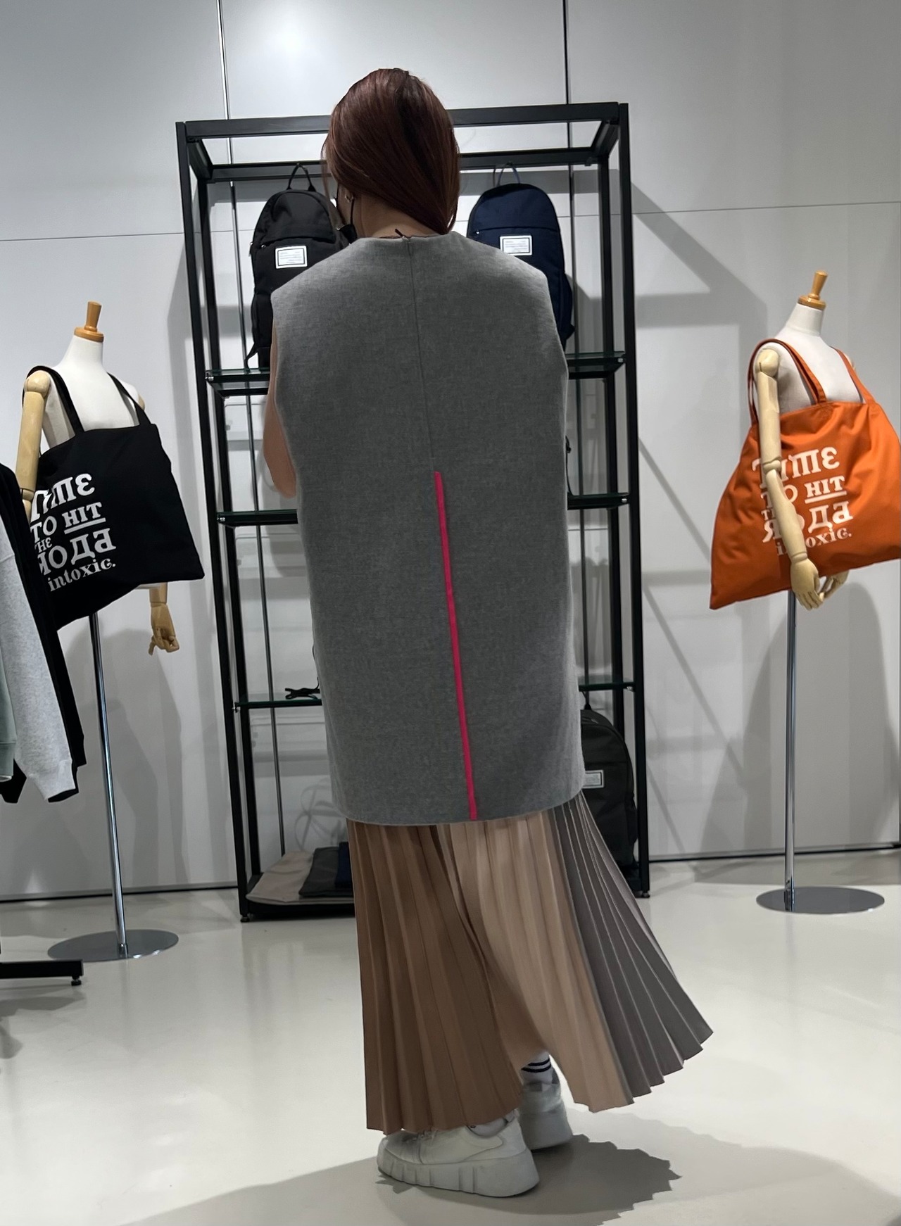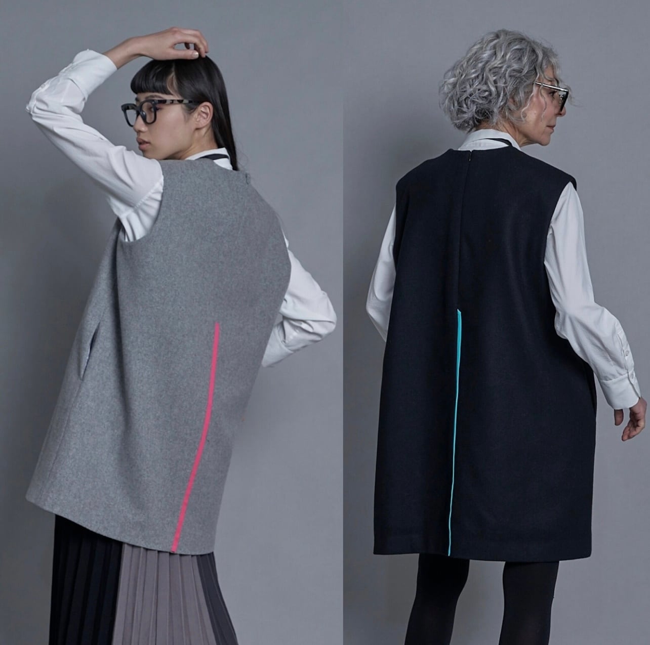 後ろ身頃の接ぎの中央にラインを入れています。グレーにはトキシックピンクのライン、ブラックにはターコイズブルーのラインを入れました。前から見るとシンプル、後ろから見るとちょっと変わった蛍光色のラインとぽってりとしたメルトンとの組み合わせが意表をつく新鮮なカラーリングになっているところが気に入っています。お勧めはブラック。中に同じく予約販売中のタートルニットやニットプリーツスカートを入れて着るとコーディネートが完成します。