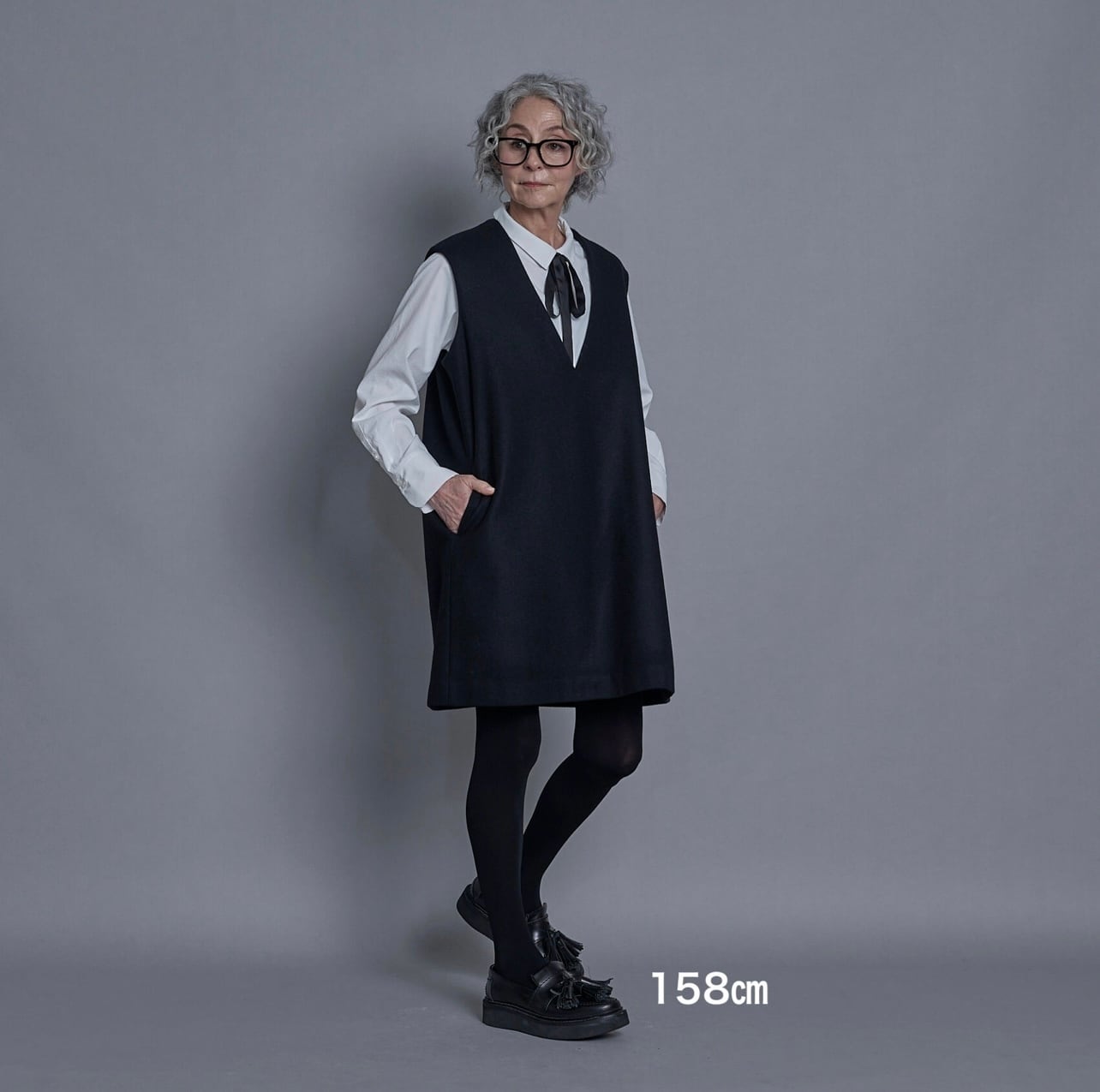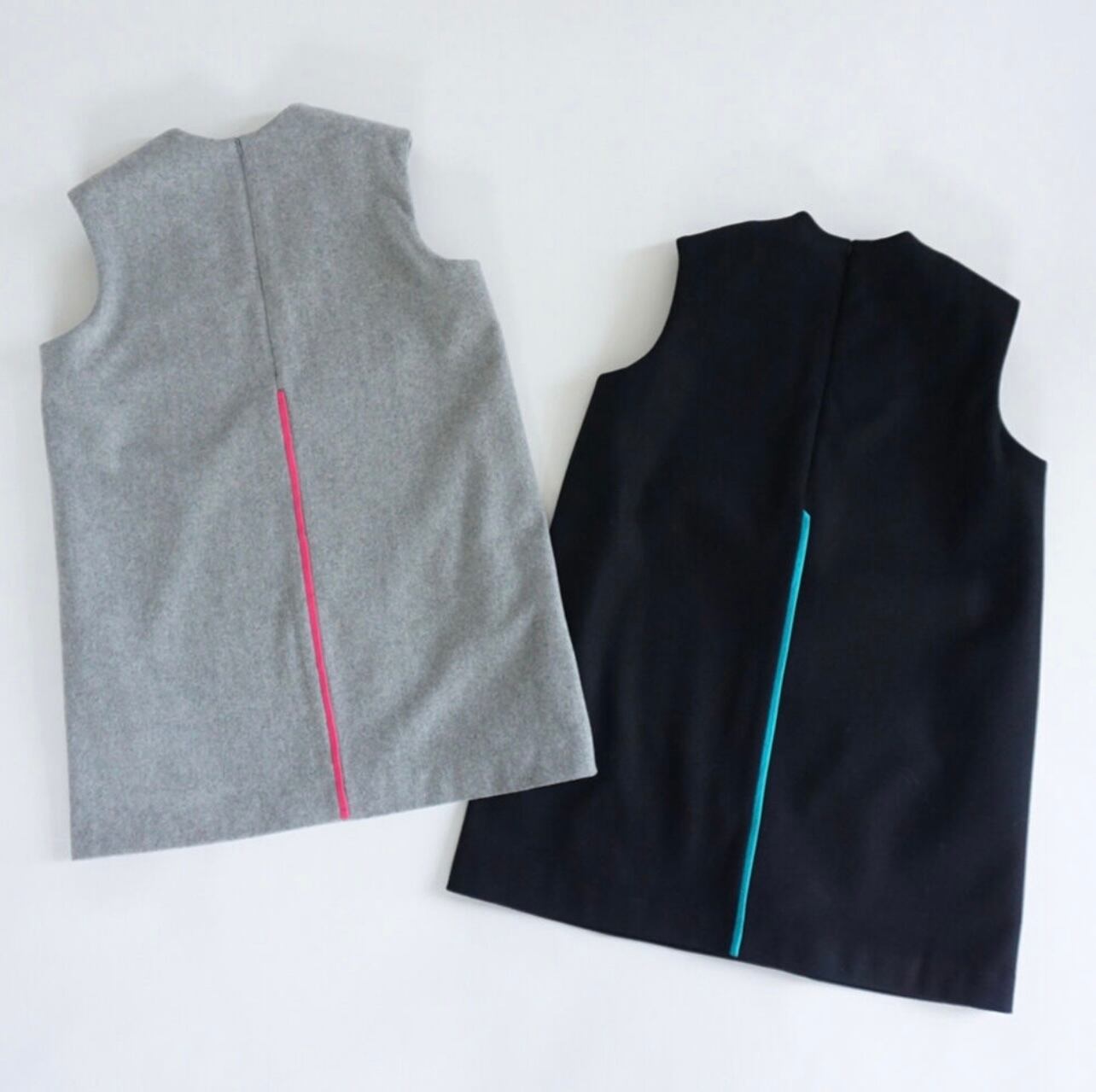 Vネックのシンプルなワンピース。ベストとしても着用可能です。やや薄手のメルトンに裏地をつけ滑りを良くしています。