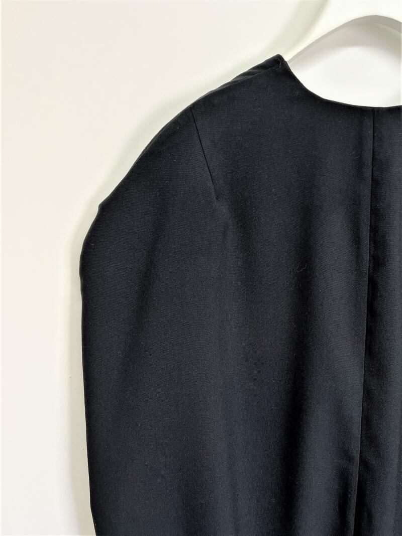 体を包み込むようなコクーンシルエットで、二の腕をカバーしつつ、ケープを纏っているようなデザインになっています。裾のドロストデザインも今年らしいトレンド感をプラスしています。