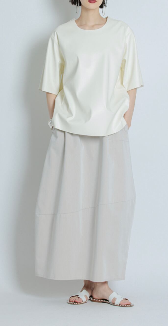 落ち感のある麻ライクの素材はシワになりにくいポリエステル混の生地で、柔らかくてごわつかない、少しきれいめな印象になります。