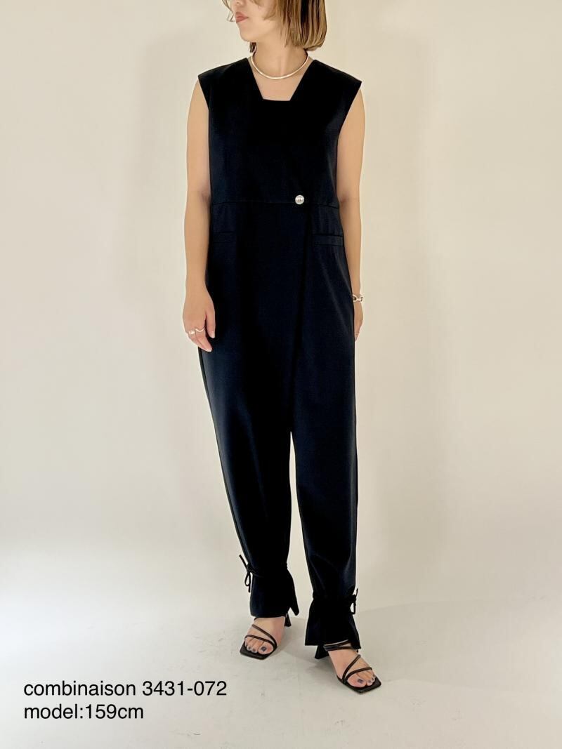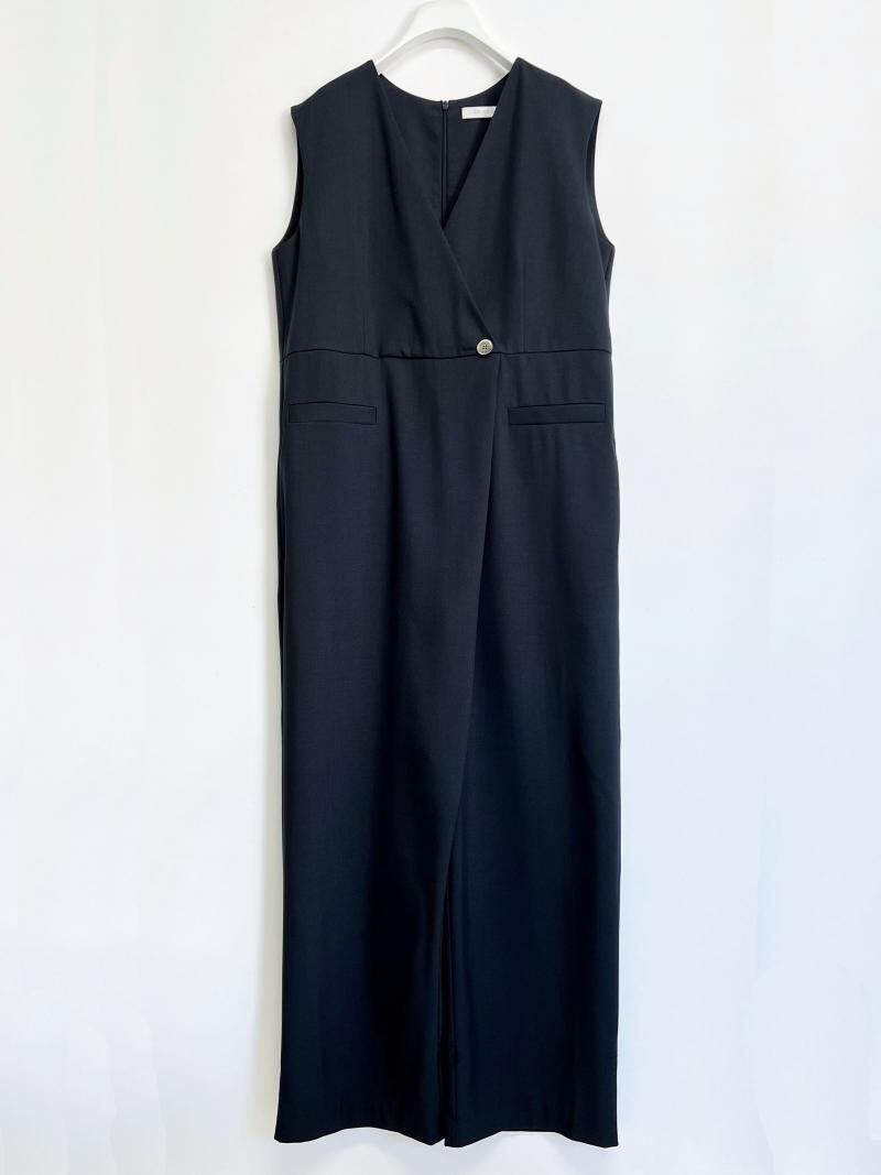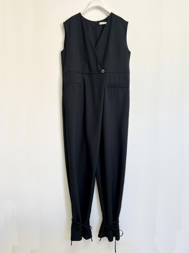 軽くシャープな印象のスーツ地を使用し、ベストのようなフロント合わせのデザインで上品で大人っぽいコンビネゾンに仕上げました。