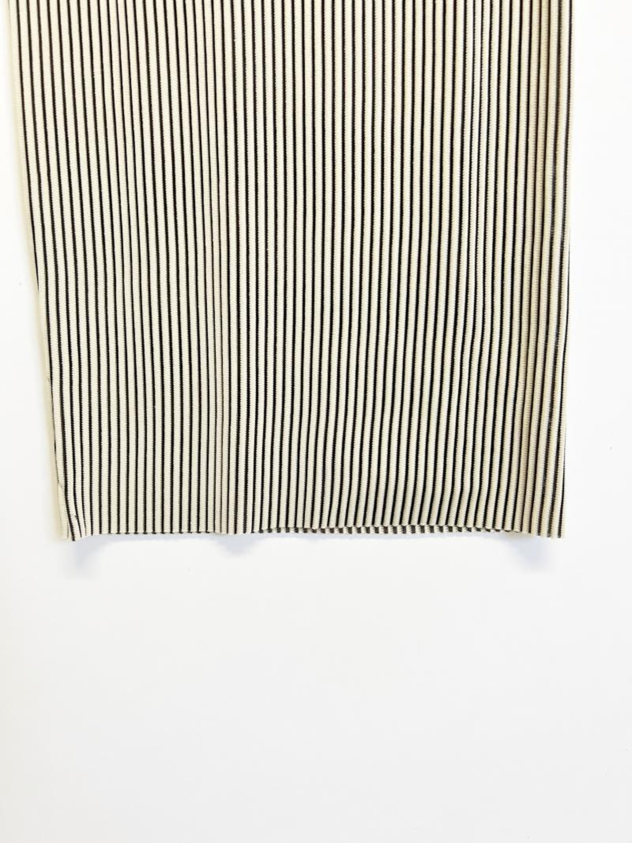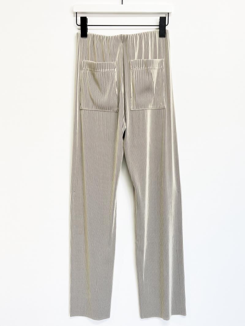 ウエストはオールゴムで、ベルト接ぎの無いミニマムな仕上げになっています。シルエットは少し余裕のあるストレートで、さらっとした落ち感と縦畝が足長効果を作るデザインになっています。