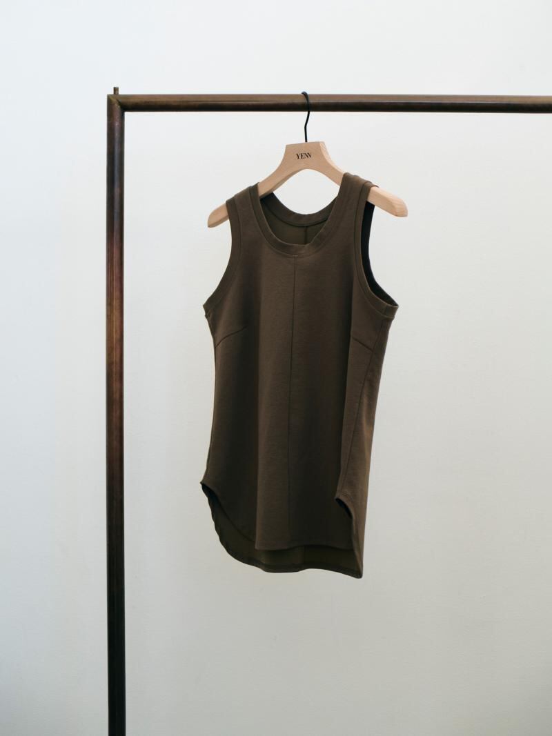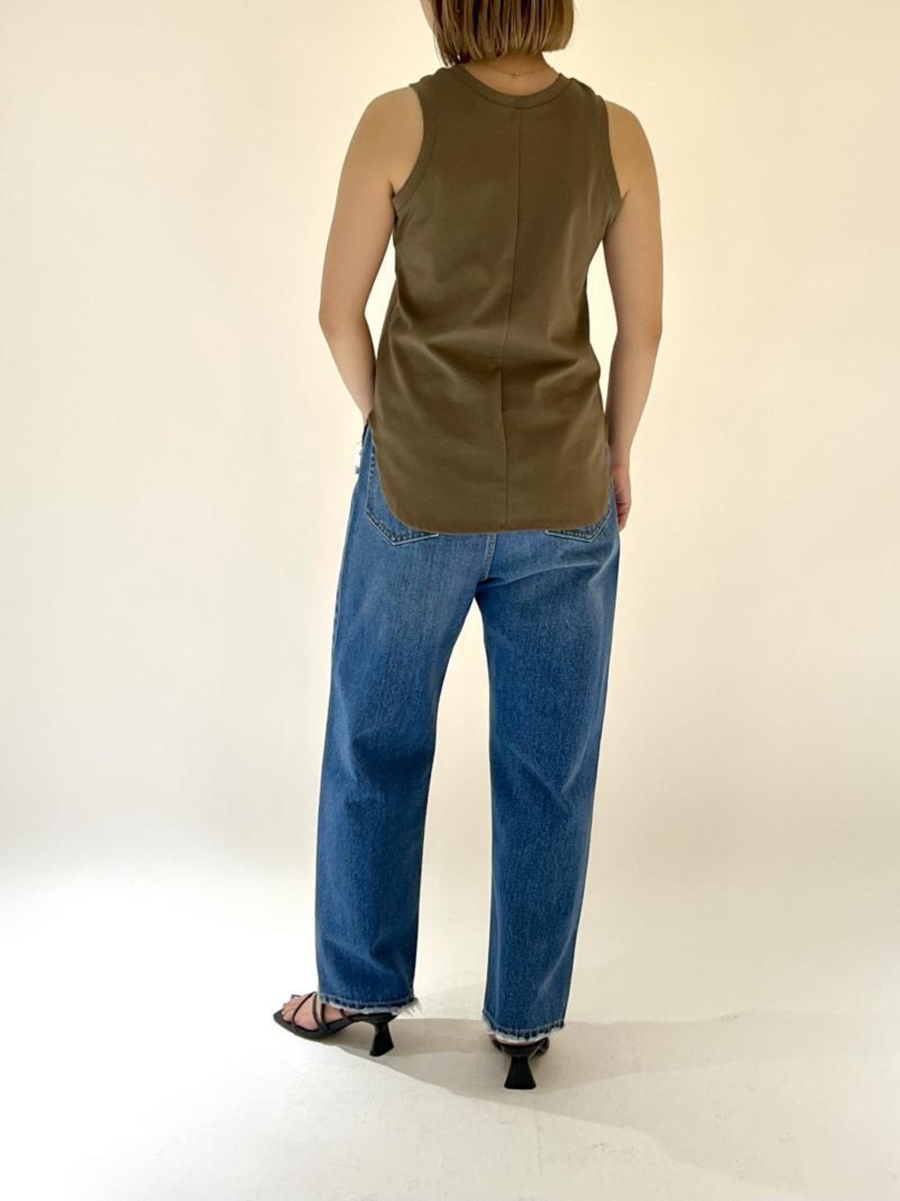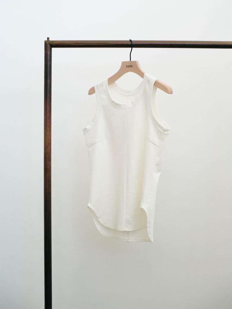 センターに入れた接ぎもさりげないポイントです。ありそうでなかった素材感のタンクトップでおすすめの1枚です。
