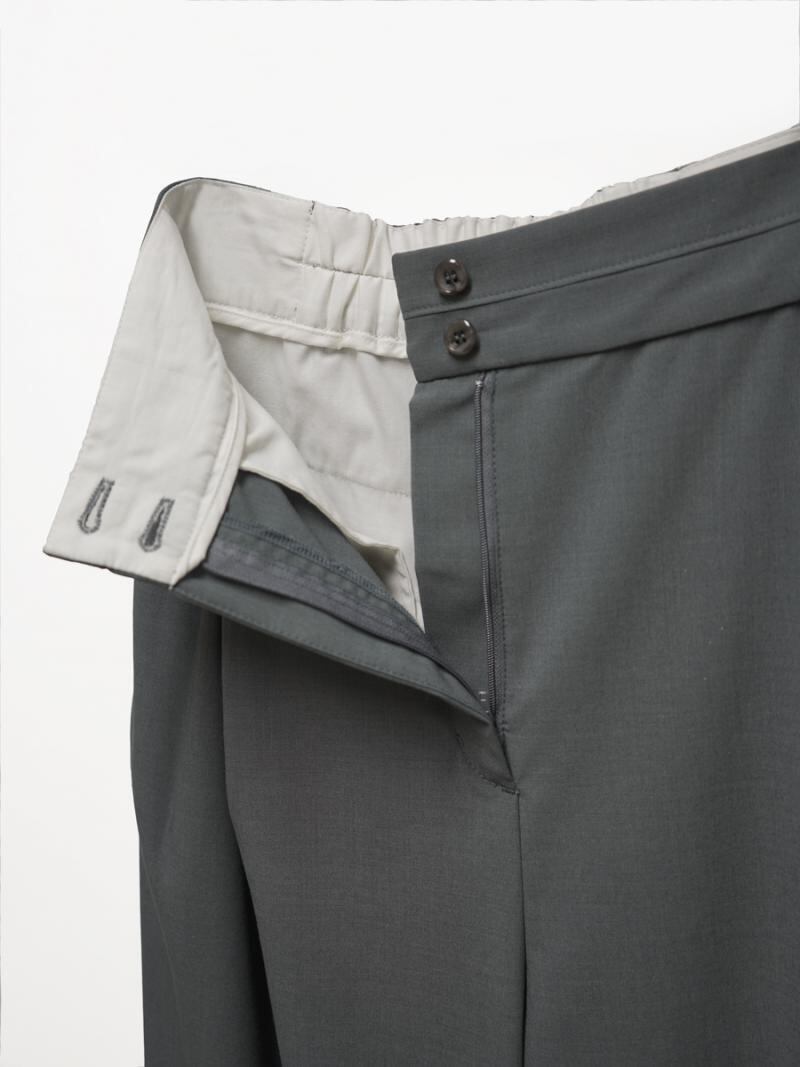 ハイウエストでベルトは太めに作っているので、ウエストのタックインが生きるデザインになっています。