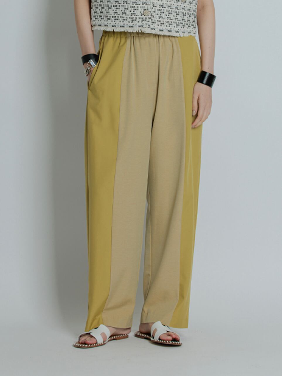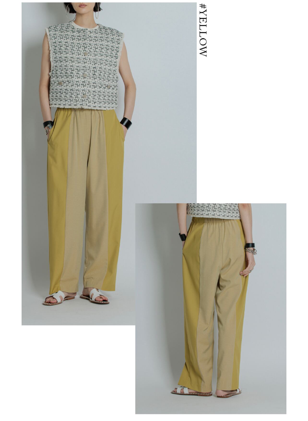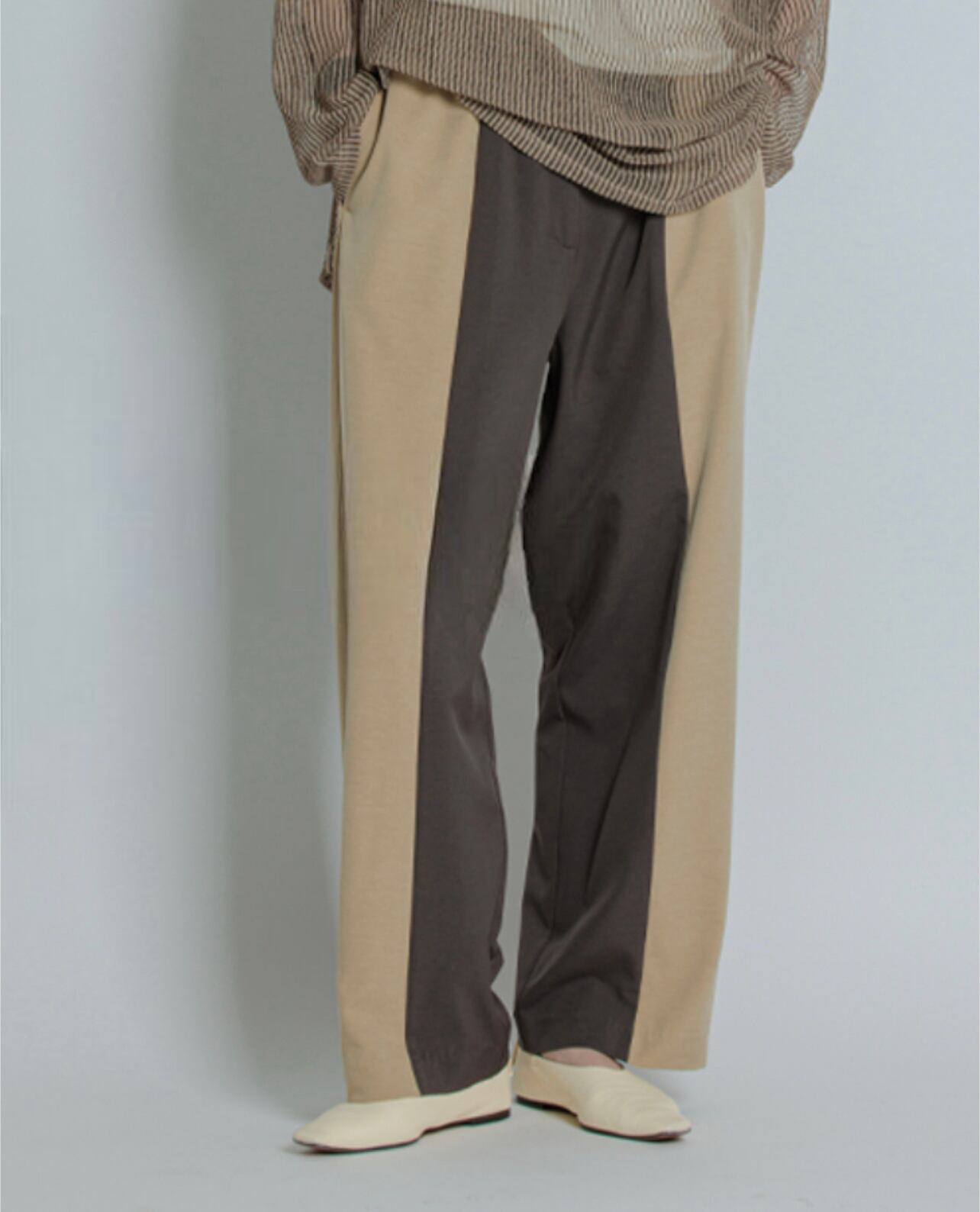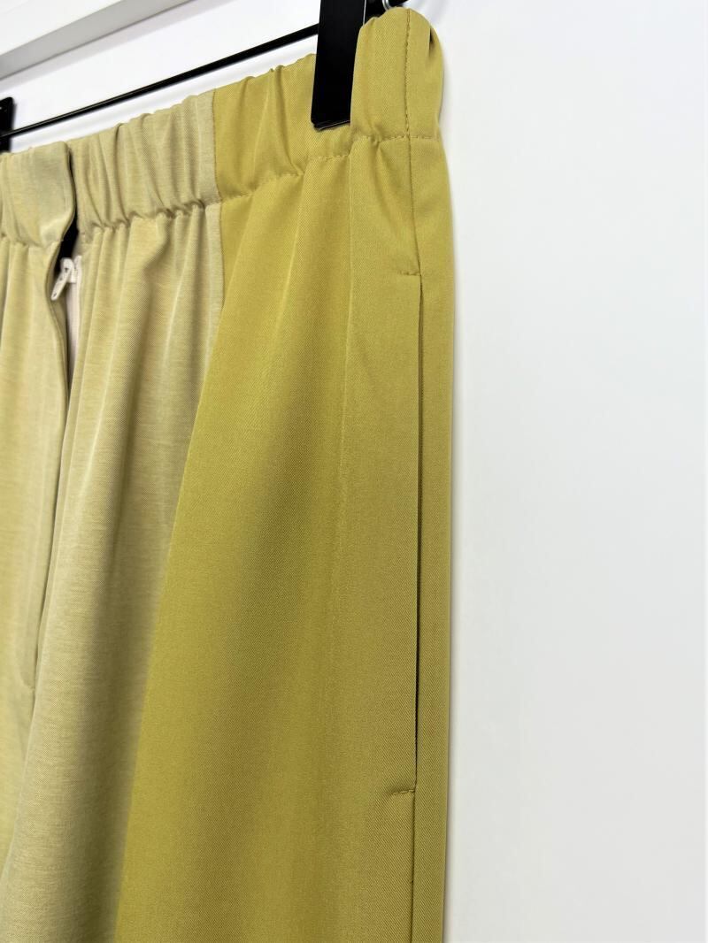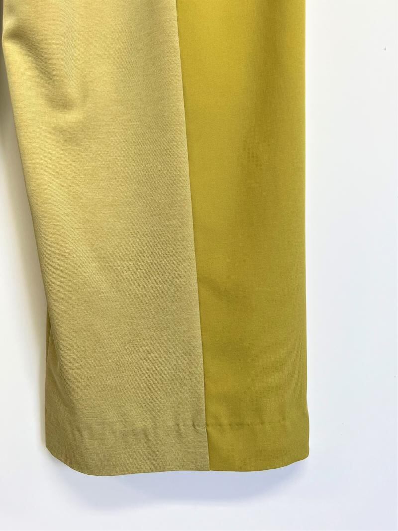 大胆な切り替えを入れコントラストを楽しめるデザインパンツ。