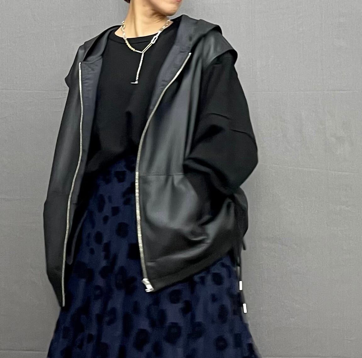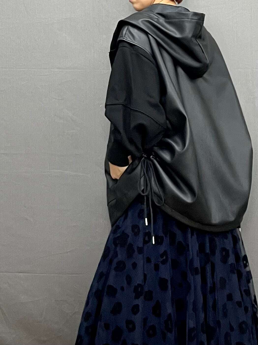 両サイドのドロスト紐を絞って♪ふんわりしたシルエットも作れます。ハードになり過ぎずレザーの風合いをお楽しみいただけるベストです。