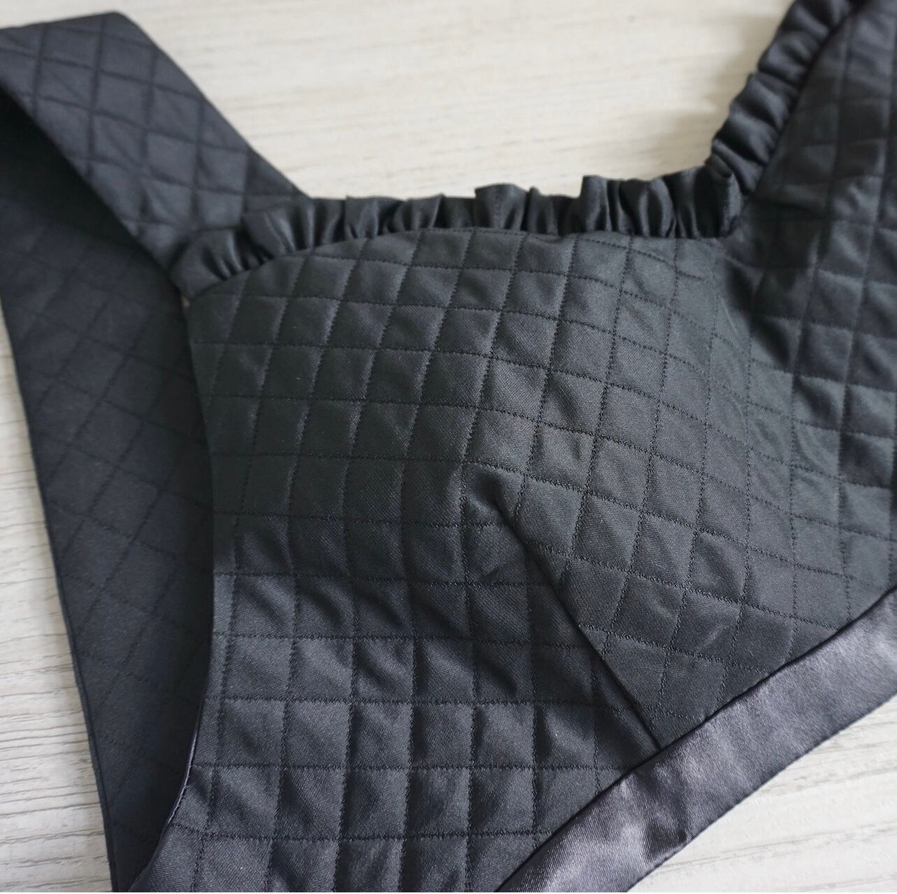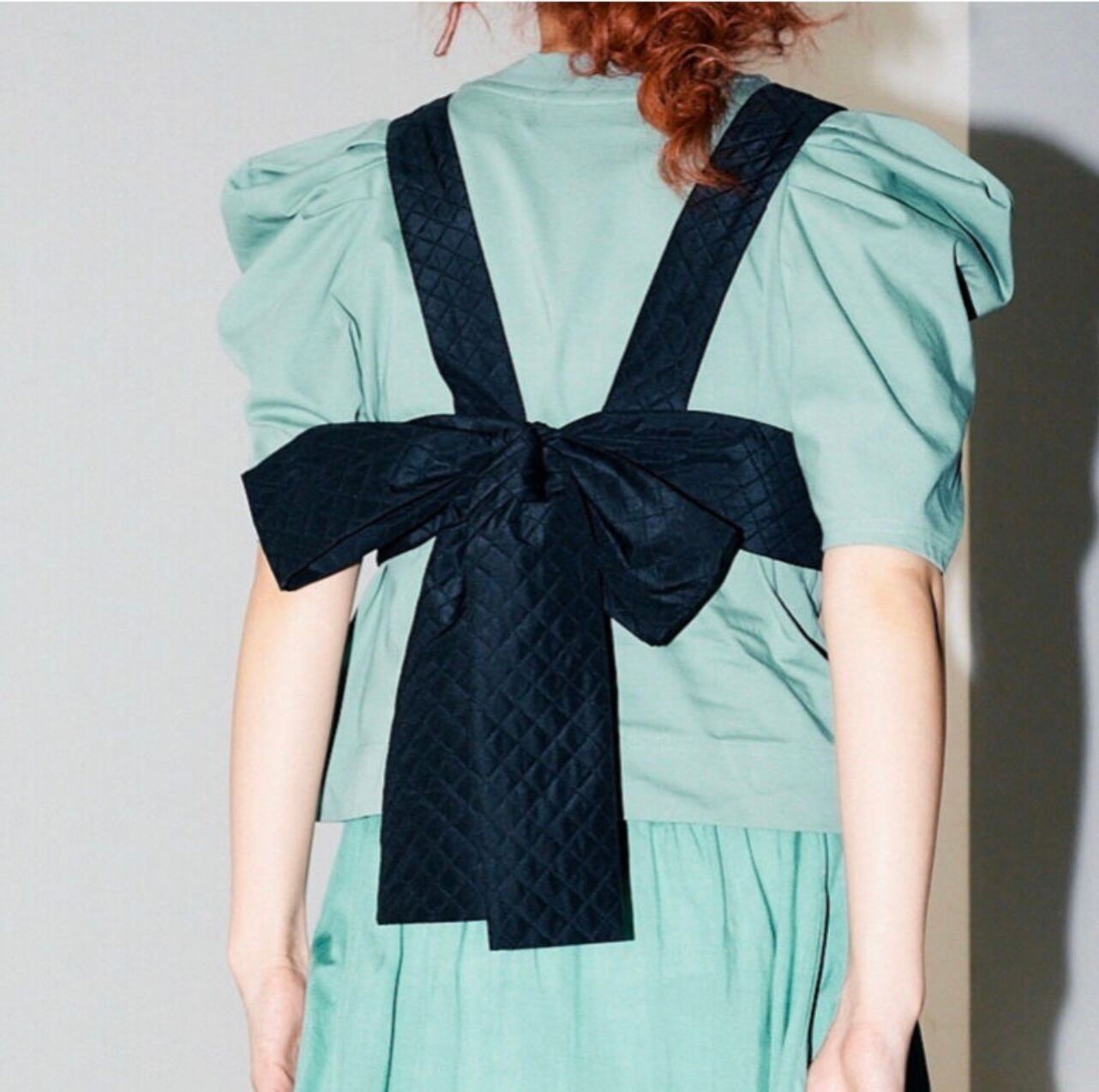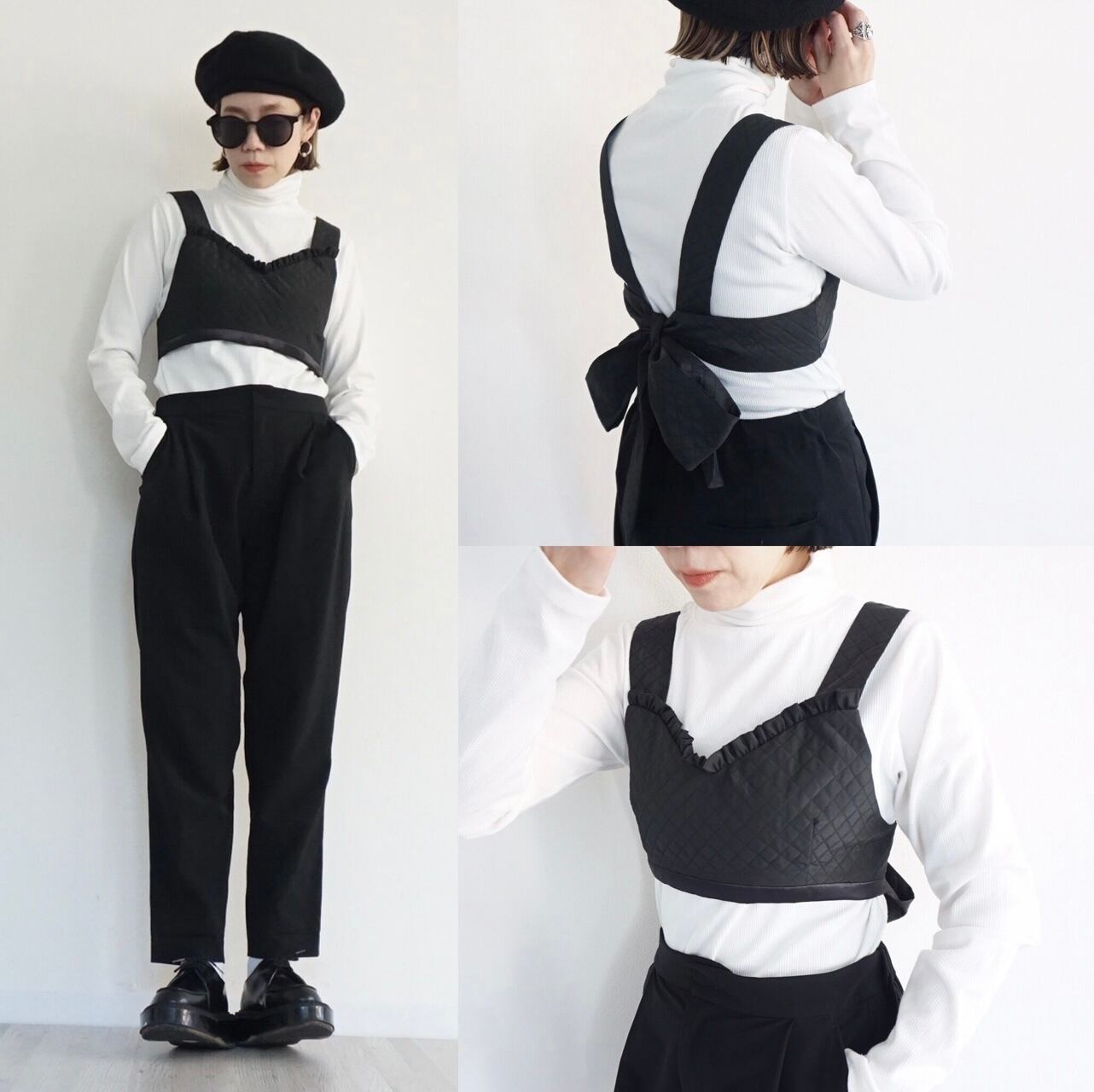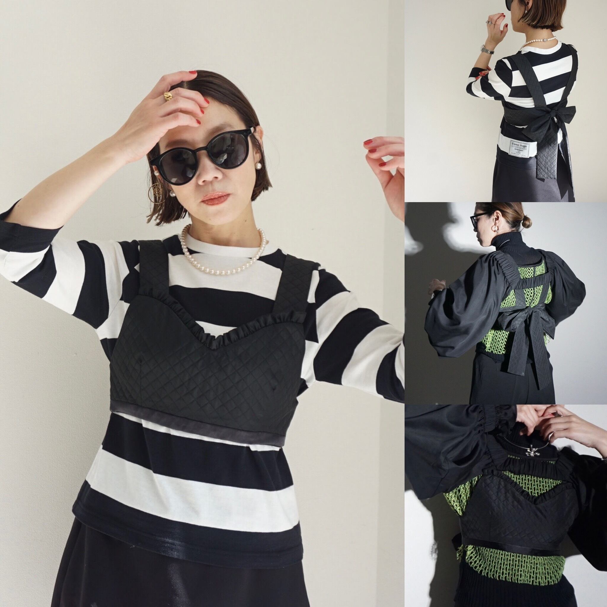 コットンポリエステルのキルティングで後ろがリボンになるビスチェを作ってみました。最近はトップス周りのハーネス、ベルト、ベストなどが気になります。今回はシンプルなお洋服の彩りになるものは何かないか?真夏はシンプルになりがちでファッションを楽しむアイテムに欠けるということを考え、いろいろなアイディアを出して検討してみました。今回のお勧めの付け袖アタッチドスリーブやこのビスチェもそのひとつで、着こなしの彩り、その人なりのセンスで合わせて欲しいアイテムになっています。このビスチェはシーズン問わず、サイズを問わず、なんにでも合わせられるのが良いところ。厚手のジャケットにも合わせてみました。後ろはリボン結び。ハリと絶妙な厚みで立ち上がりがあり、美しいリボンが簡単に作れます。後ろに手を回して簡単に結べますが、不安な方は結び目を前で作ってからクルッと回して着用も可能なので一人でも着ることができます。基本はお手元のTシャツや、襟付きのオーバーシャツなどにスカートで合わせると素敵だと思います。キルティングの凹凸が上質感を感じられる素材です。いろいろなアイディアで楽しめます。