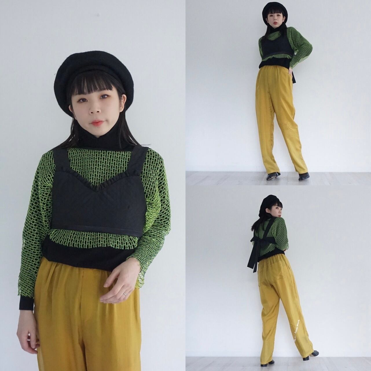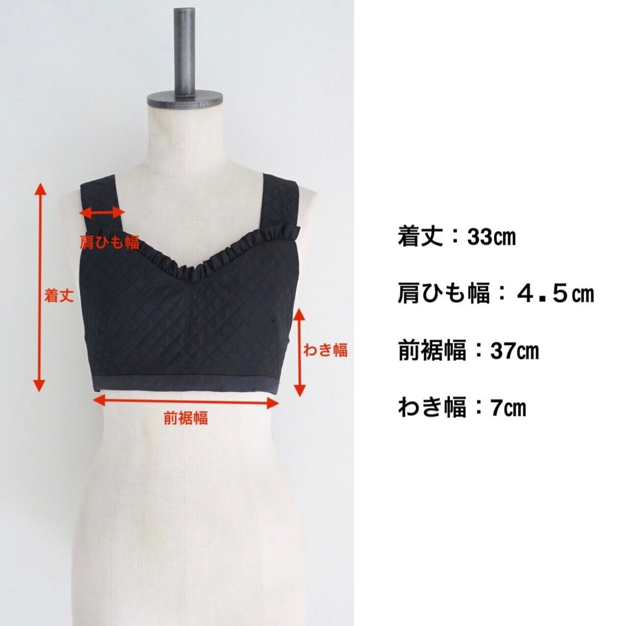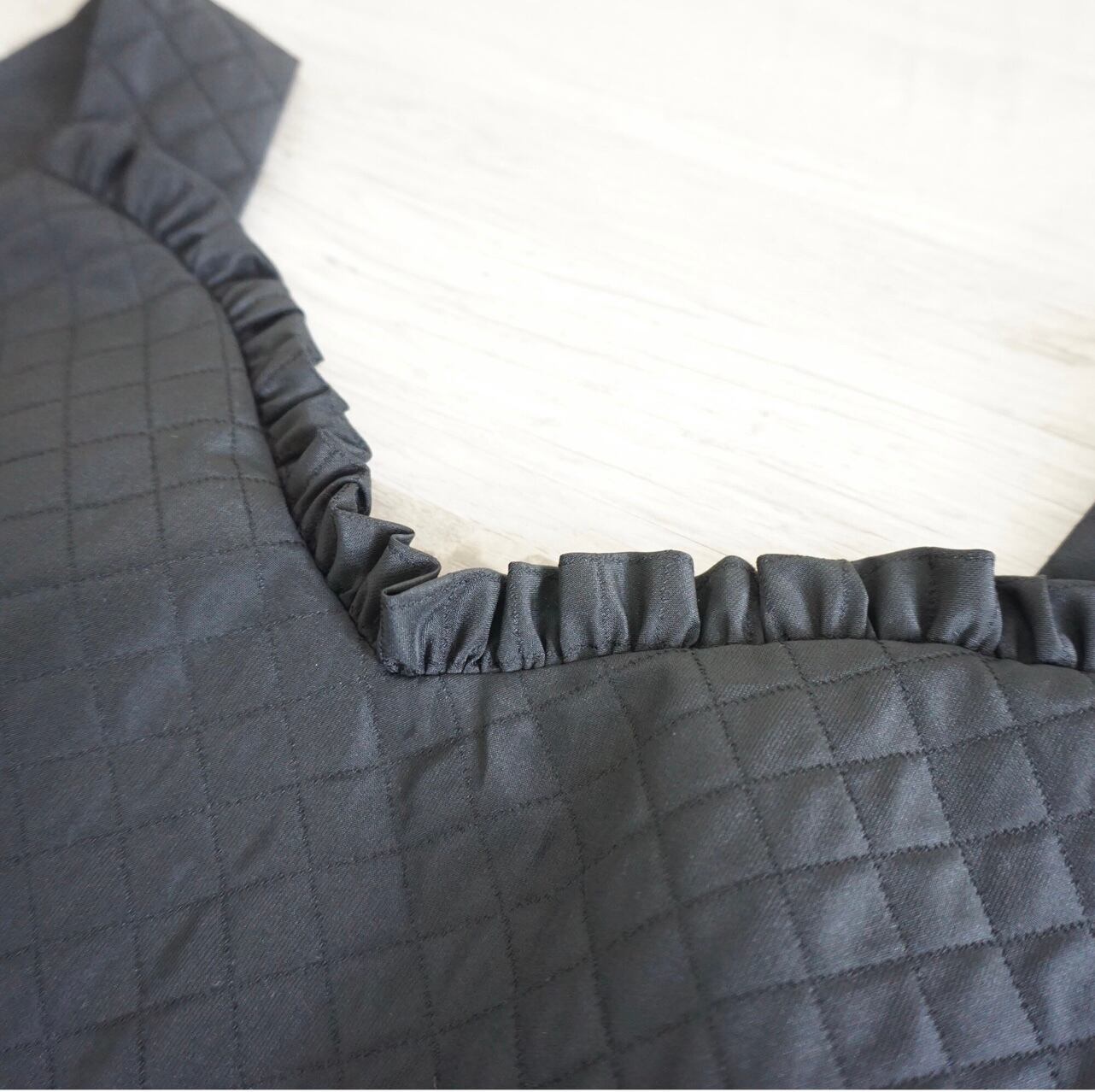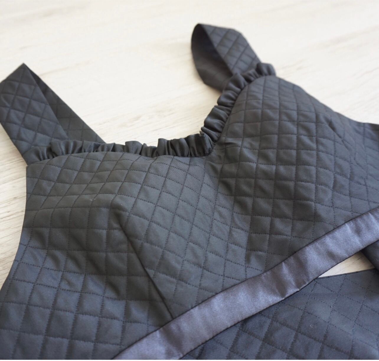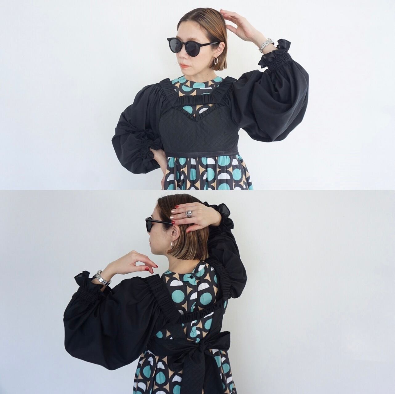 コットンポリエステルのキルティングで後ろがリボンになるビスチェを作ってみました。最近はトップス周りのハーネス、ベルト、ベストなどが気になります。今回はシンプルなお洋服の彩りになるものは何かないか?真夏はシンプルになりがちでファッションを楽しむアイテムに欠けるということを考え、いろいろなアイディアを出して検討してみました。今回のお勧めの付け袖アタッチドスリーブやこのビスチェもそのひとつで、着こなしの彩り、その人なりのセンスで合わせて欲しいアイテムになっています。このビスチェはシーズン問わず、サイズを問わず、なんにでも合わせられるのが良いところ。厚手のジャケットにも合わせてみました。後ろはリボン結び。ハリと絶妙な厚みで立ち上がりがあり、美しいリボンが簡単に作れます。後ろに手を回して簡単に結べますが、不安な方は結び目を前で作ってからクルッと回して着用も可能なので一人でも着ることができます。基本はお手元のTシャツや、襟付きのオーバーシャツなどにスカートで合わせると素敵だと思います。キルティングの凹凸が上質感を感じられる素材です。いろいろなアイディアで楽しめます。