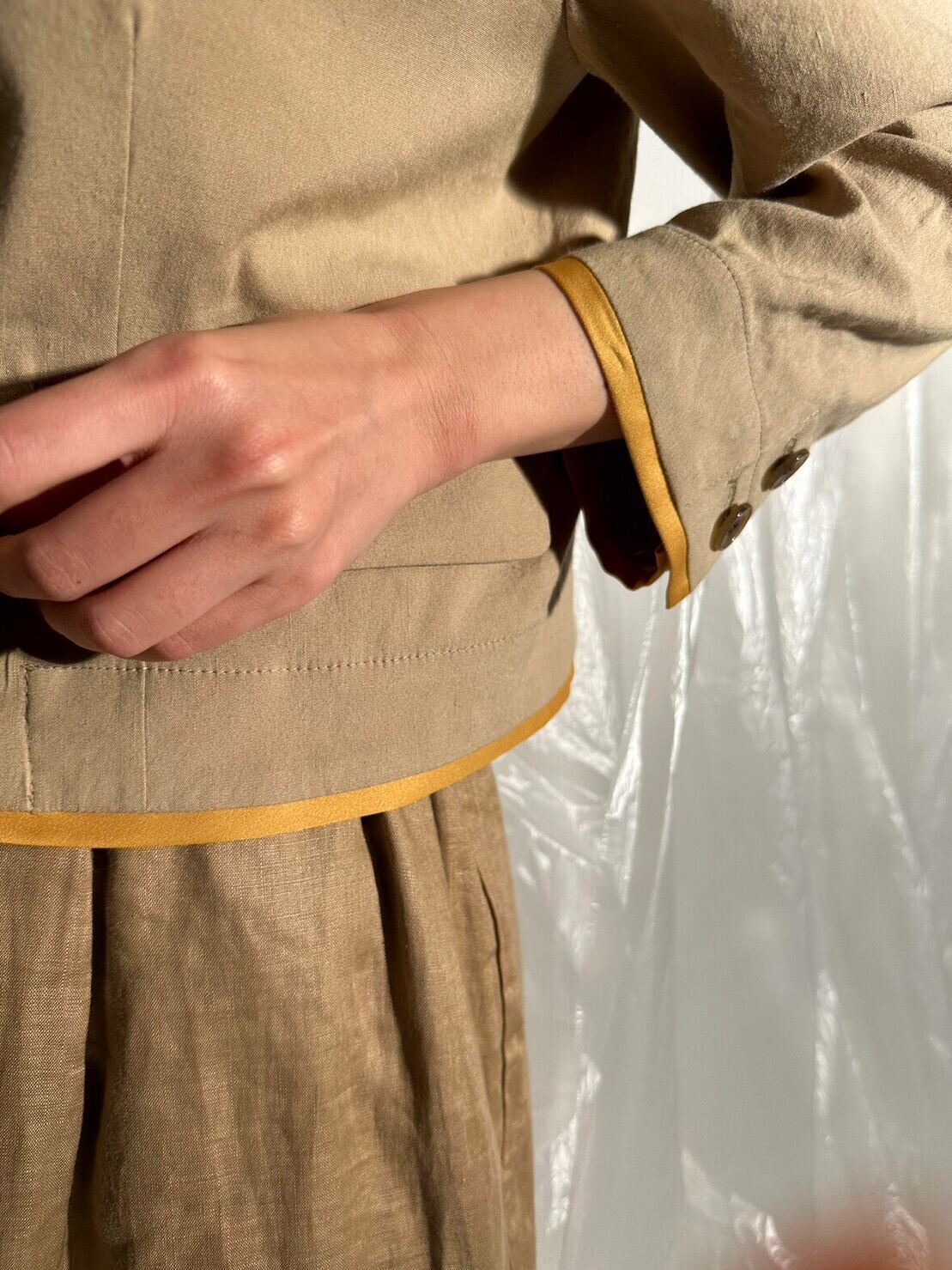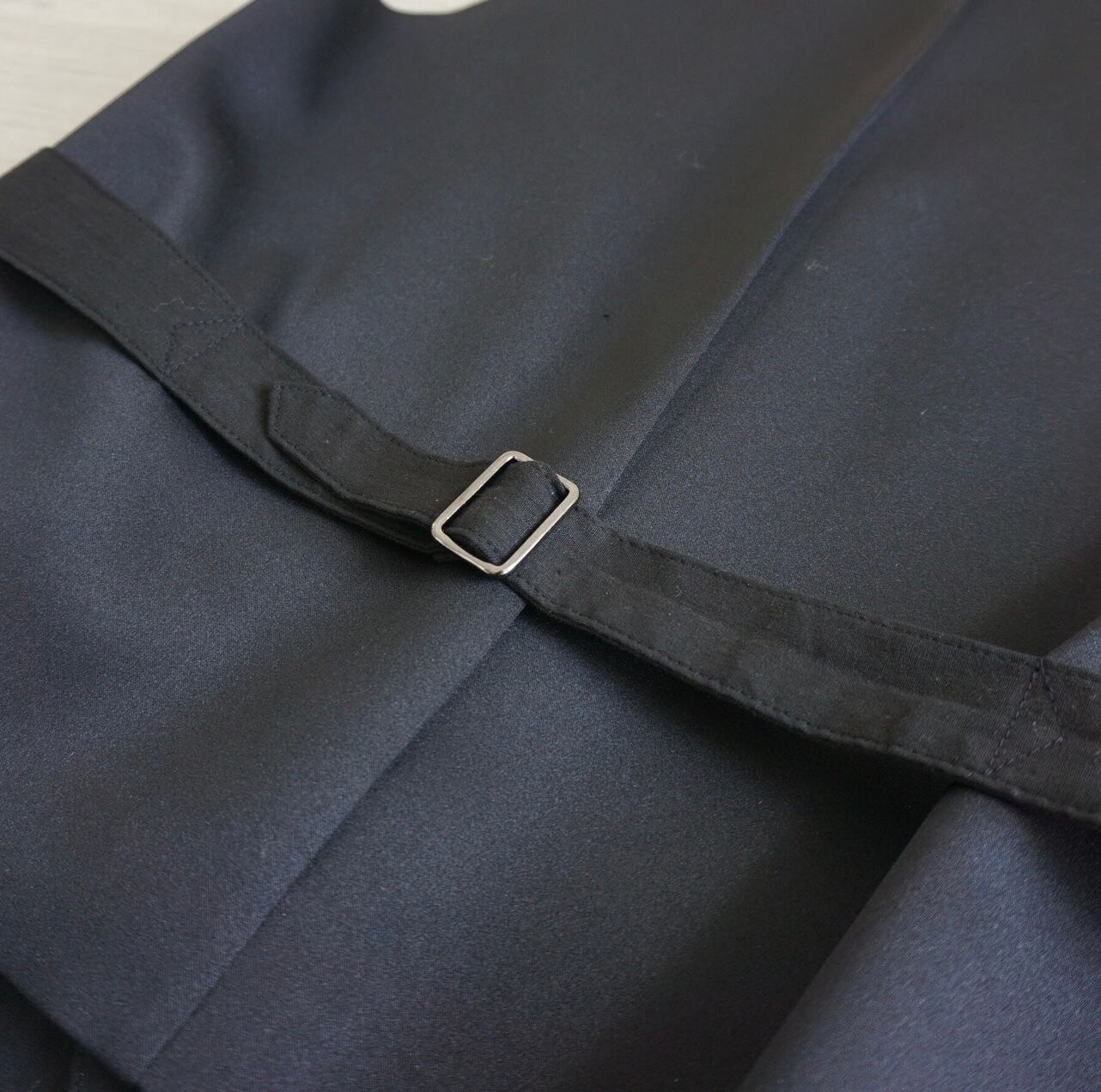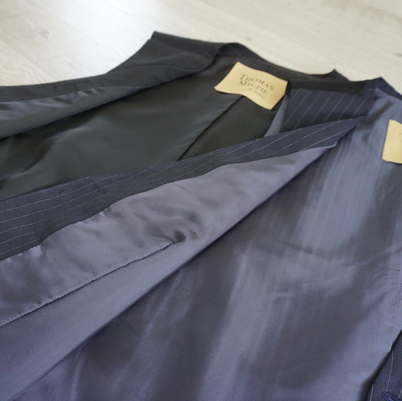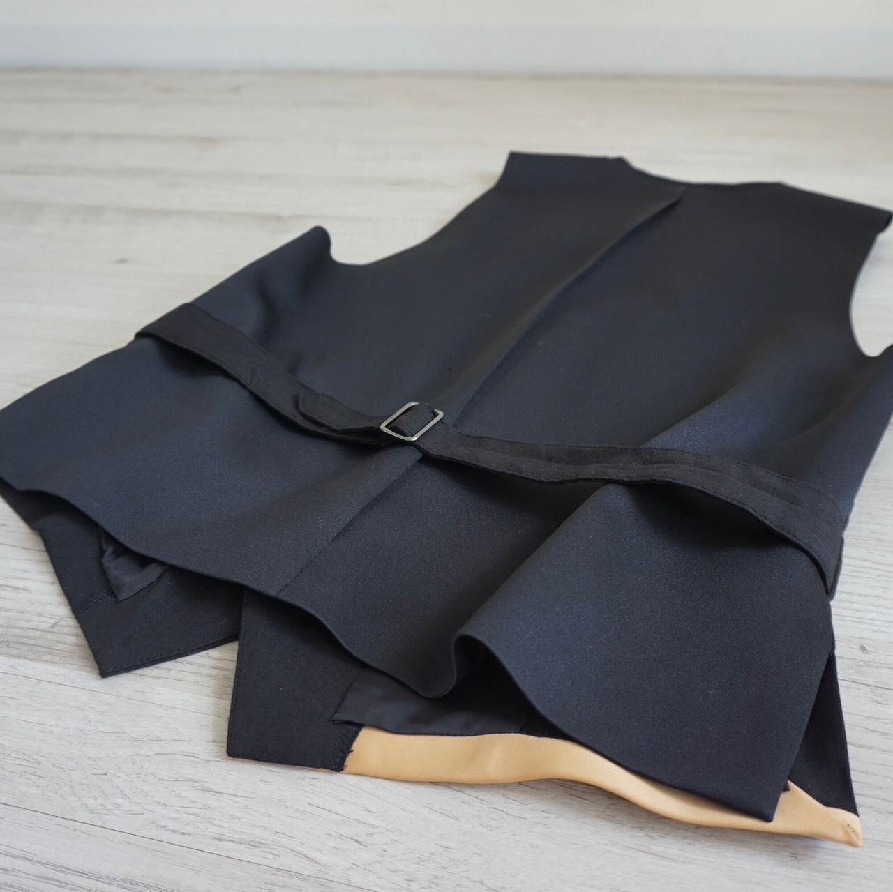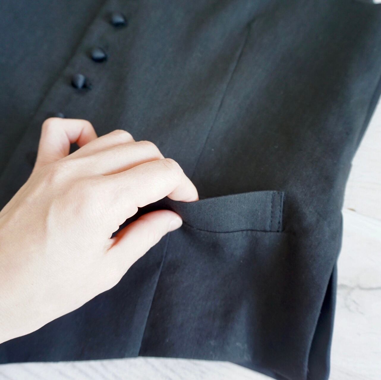 真夏に一枚で素肌に着てみたいと思いベストを作ってみました。ピンストライプとブラックの2つのカラーで提案します。日本製のリネンビスコース。後ろ身頃は本来のメンズテーラー風でポリエステルサテン生地を使用しています。マグパイらしさを出すために、片側にはカラーのラインを別布で入れています。ピンストライプにはグリーンのライン。ブラックにはイエローのラインを入れています。タイトすぎないシルエットで、縦のラインを強調しコーディネートをスタイリッシュに仕上げます。サテンの共布のくるみボタンをズラリと並べています。閉めても、開けたままでもサマになる素材と縫製の良さが特徴で、フロント部分にミニポケット付き。仕立ての良さで一線を画す今までの中で一番上品なベストです。
