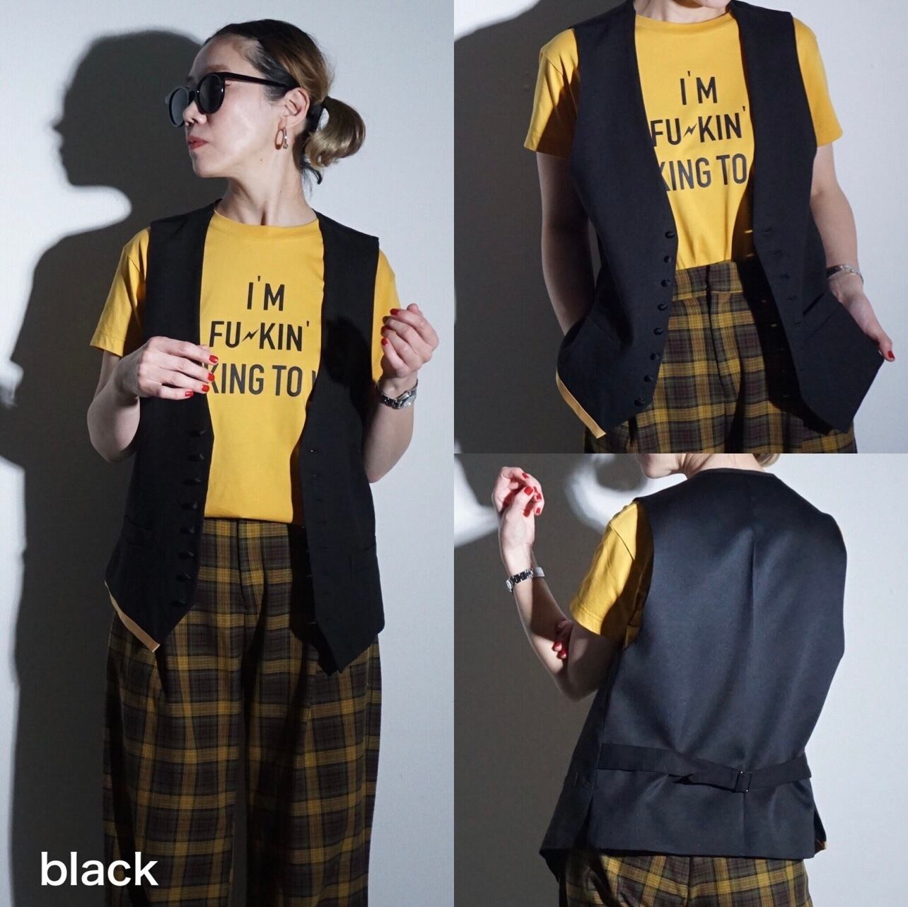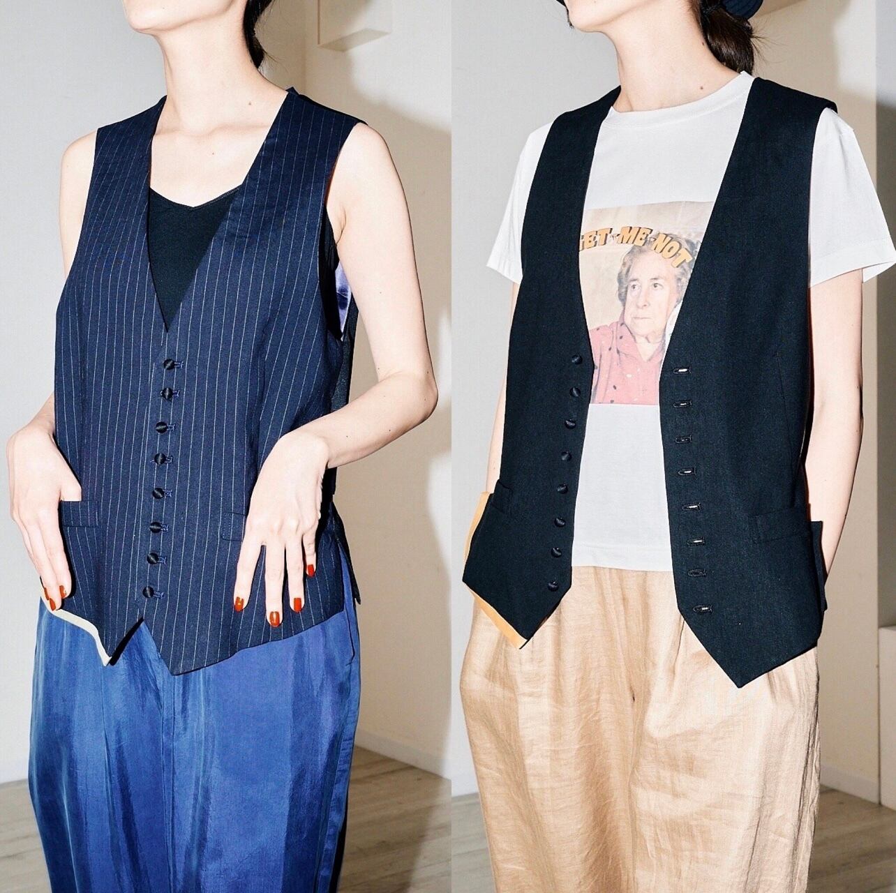 カジュアルな白Tシャツにデニムパンツでベスト×ローテクのスニーカーという普通の組み合わせでも良いのではないかな?と思います。また今年ならメンズライクなパンツに一枚で素肌に着る、またお出掛けなら白シャツにボウタイなどできちんとしたスタイルも良いかなと思います。ワンピースの上に、古着のロックTの上から、など色々と楽しめて長く着用できるベストです。合わせやすいのは単色のブラックです。ピンストライプはよりテーラード色が強く、こなれた本格感があります。よりモードに着用したい方はピンストライプをお勧めします。