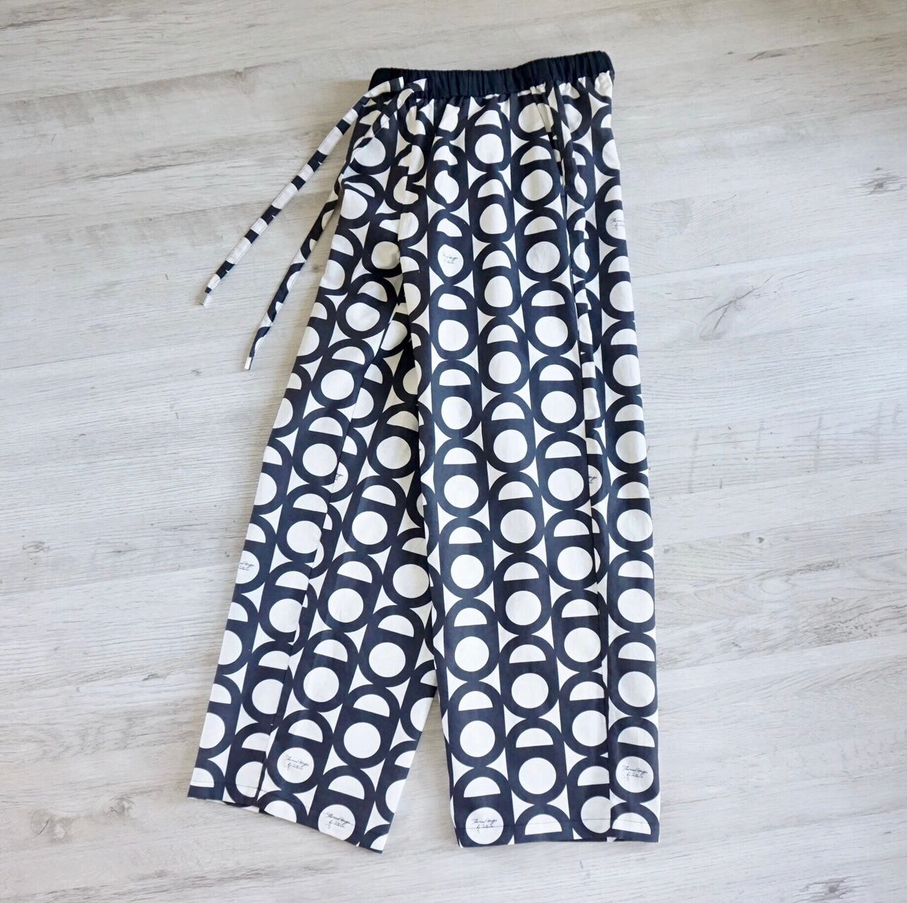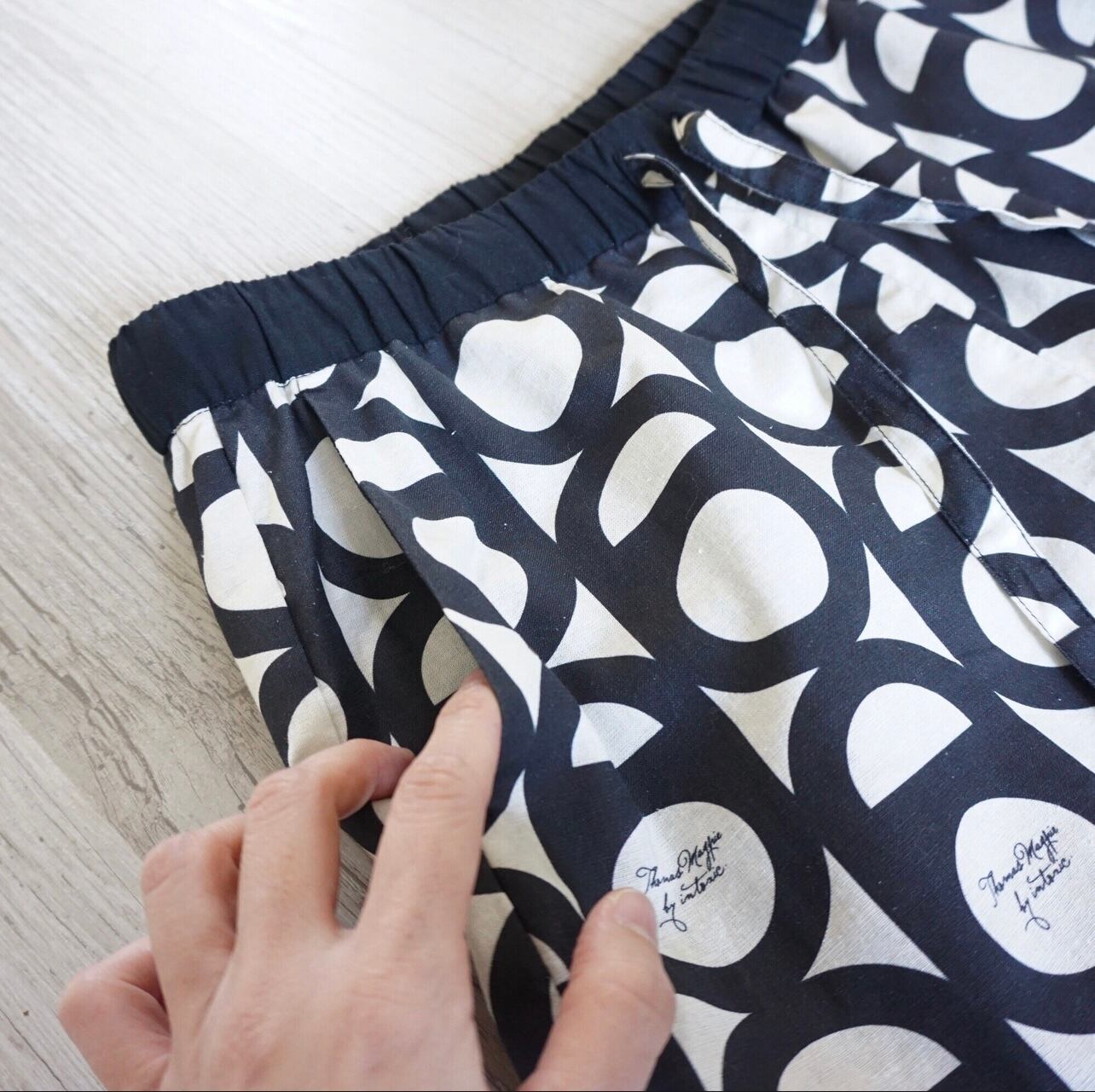 麻の中でも少し高級感のあるラミー素材にオリジナルの柄でプリントをのせて作ったプリントイージーパンツです。太めのストレートワイドパンツで、体型を選ばずどなたでも着ていただけるサイズ感にしています。わたりも大きめで、ヒップやお腹が気になる方にとてもお勧めです。細い方はウエストがゴム+ドローストリングで絞る事ができ、とても履きやすいパンツです。身長の高い方にもとてもお勧め。着丈を少し短めにしてレザーシューズなどと合わせて、靴下を見せても、とても可愛いと思います。幾何学的な大きめの柄に、THOMAS MAGPIEの筆記体のロゴを入れています。毎回、オリジナルのテキスタイルを作り提案していますが、今回は、ポリエステルではなく、少しリッチ感のある適度な厚みのラミーで初夏から秋まで長く着ることができます。真夏は非常に涼しくて便利アイテムではないかと思います。ボトムで派手な色柄は取り入れやすくて、着やすいと思います。スカートはあまり履かないという方へお勧めします。170センチ以下の男性にもお勧めします。