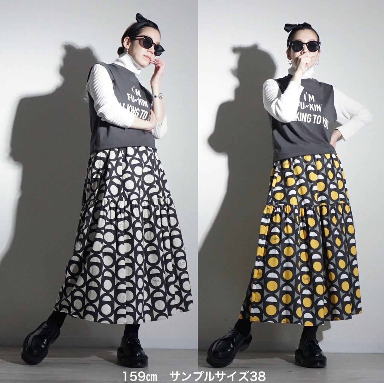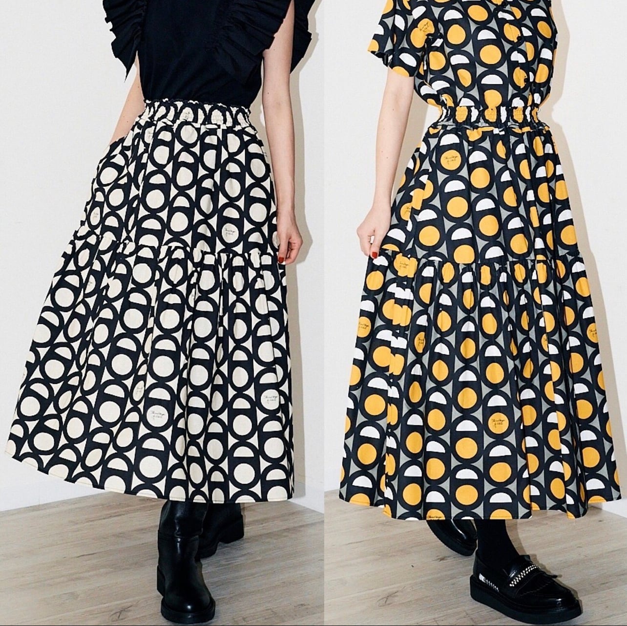 麻の中でも少し高級感のあるラミー素材にオリジナルの柄でプリントをのせて作ったギャザースカート。幾何学的な大きめの柄に、THOMAS MAGPIEの筆記体のロゴを入れています。毎回、オリジナルのテキスタイルを作り提案していますが、今回は、ポリエステルではなく、少しリッチ感のある適度な厚みのラミーでオールシーズン着用可能です。ウエストはゴムでシャーリング。ゴムギャザーですが、見た目がスマートで、トップをインしてきても悪くないルックスです。太ももの辺りから、ティアードになっています。ヒップ周りは、ややギャザーでほっそりと見えて太ももの辺りから一気に広がっていくギャザーの分量のバランスがよく計算されているシルエットです。生地の厚みとギャザーのバランスが非常に良く、シルエットがとてもキレイです。また体型もウエスト(ゴム)サイズも選ばず、どなたでも楽に着る事ができます。太いゴムではなく、細めのゴムを数本通すことにより、圧迫感がなく、しかし、しっかりとした安定感です。着丈も長めにしています。ウエストよりも、着丈で選んでいただくのがお勧めです。