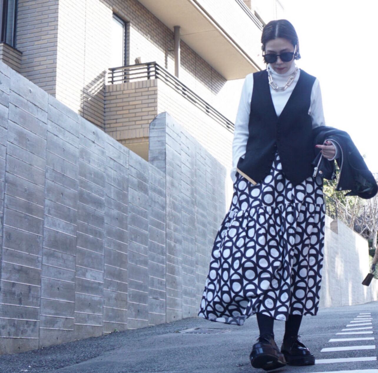 靴下、また靴を見せて履いていただきたいと思い最近はスカートはマキシより短めが好みです。靴はレザーシューズを合わせてきちんと感を出して着て欲しいと思います。少しだけスニーカーの流行に飽きています。合わせるならハイテクのスニーカーではない方が個人的には理想だなと思っています。現在、レザーのシューズもサンプル制作に入っていて、最近はシューズの見え方も視野に入れてボトムデザインに入るようになりました。