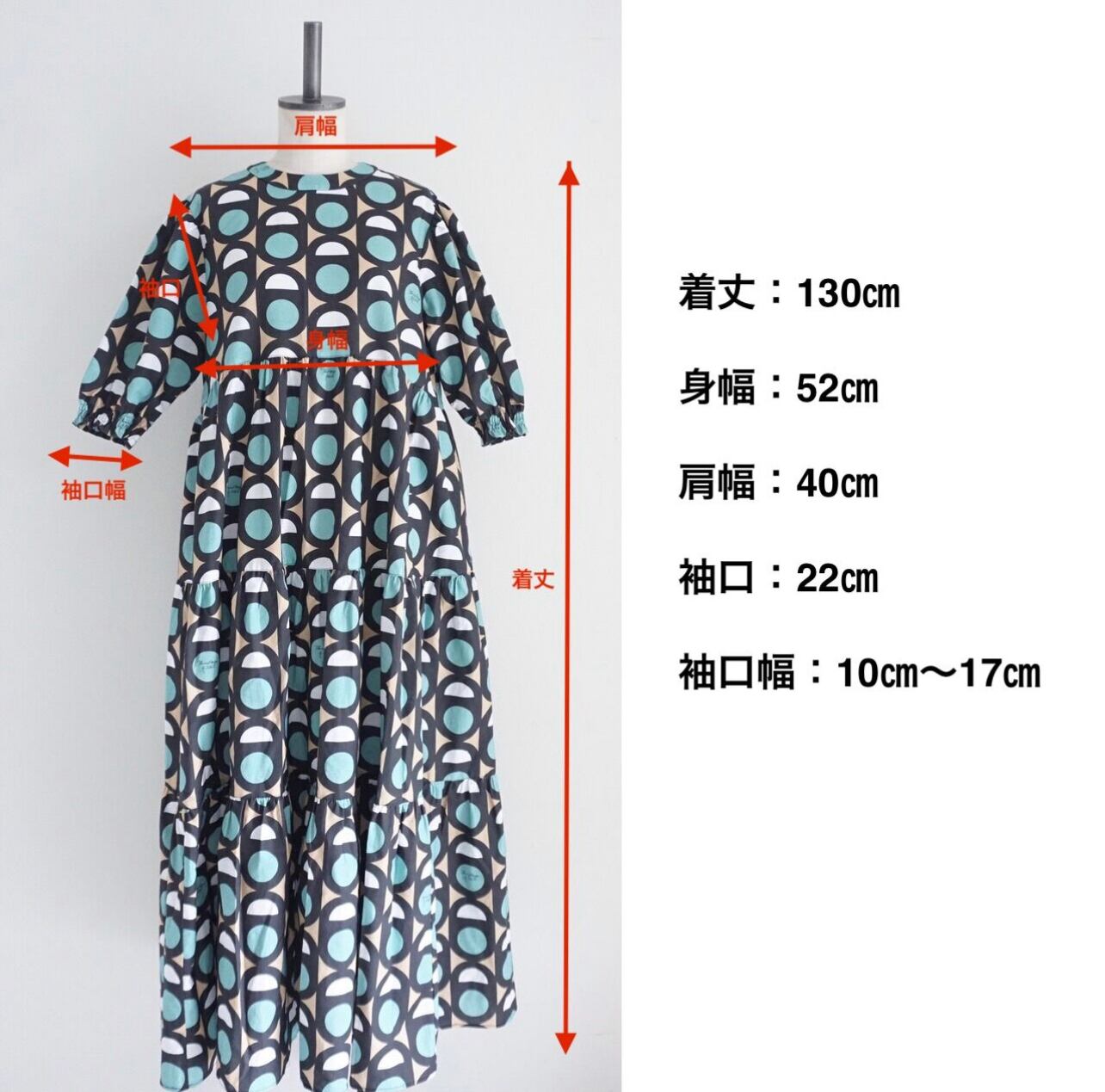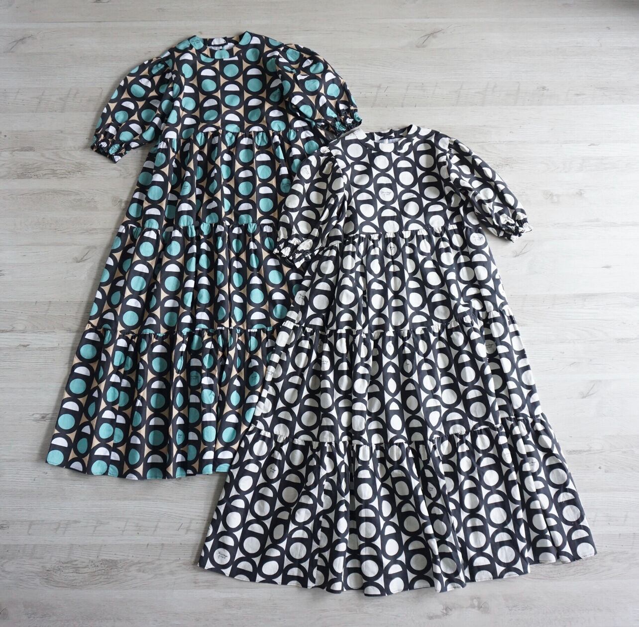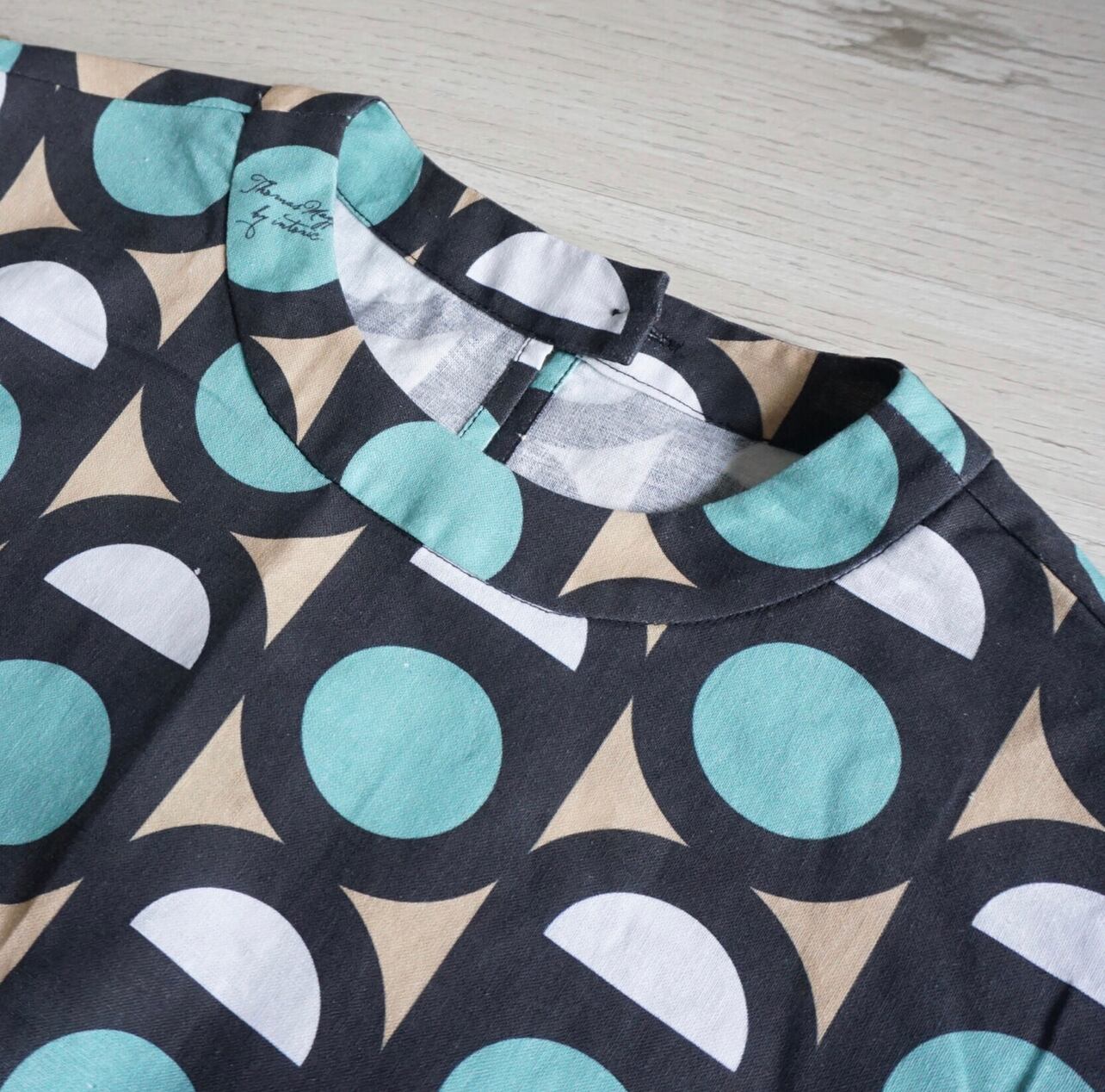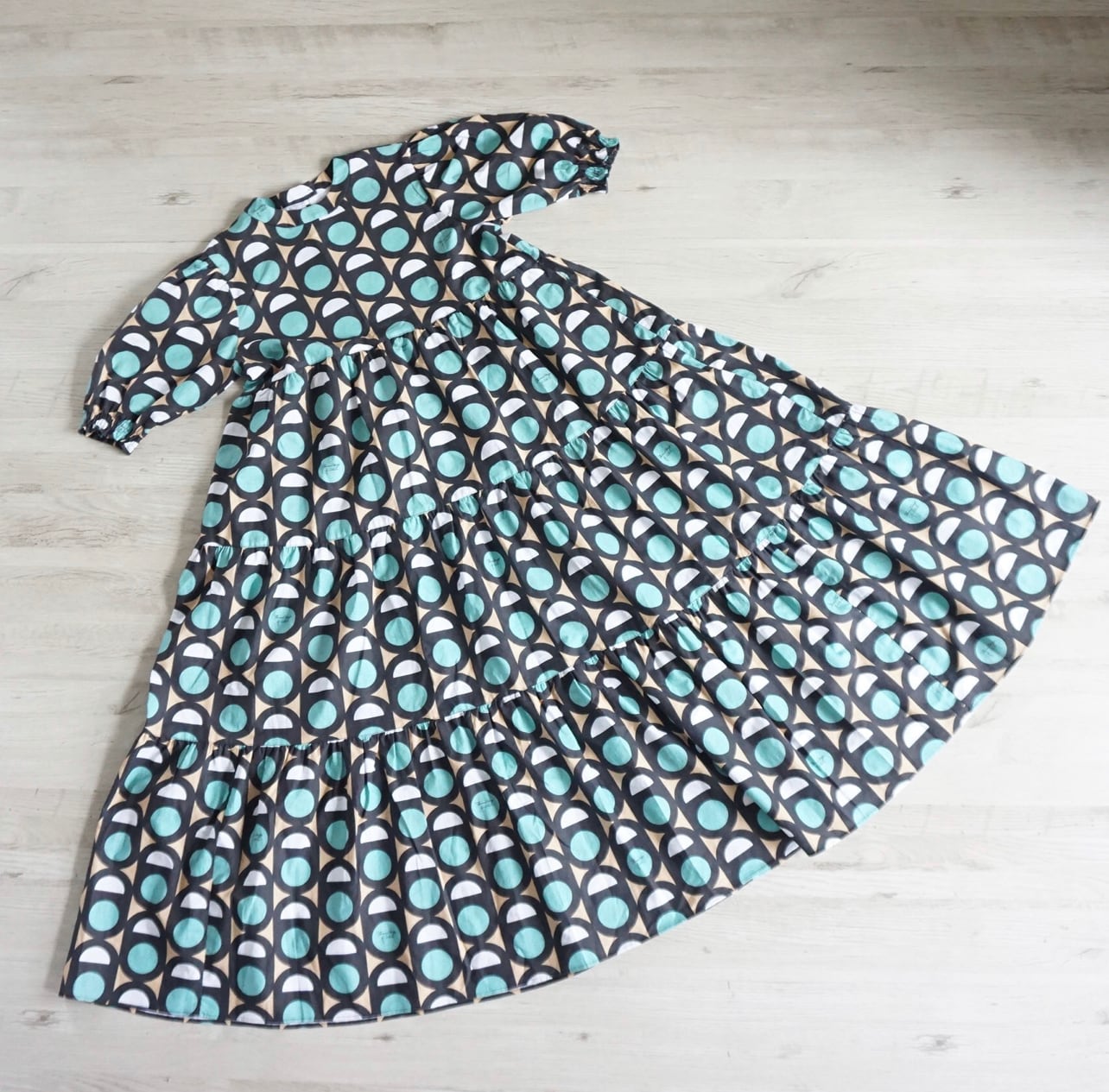 大きな広がりのあるティアードドレス。2段回の切り替えのギャザーで広がりのあるドレスをデザインしました。このドレスのシルエット、テキスタイルの厚み、ギャザー分量、首回り、袖口の膨らみとデザイン、全てとても気に入っています。今までいろいろなオリジナルテキスタイルに挑戦してみましたが、なかなかイメージ通りにはいかず、毎回学びもありました。今回のオリジナルテキスタイルはどれもイメージ通りでよく出来ているように感じています。これまではポリエステルで艶感の高い素材を選んできましたが、麻素材は初めてです。麻素材はややザラつきがあります。当然ネップが見られ、プリントが載っていない部分がありますが、そこは不良とはしていません。(麻素材に見られる特徴ですのでご理解ください。)麻素材、ラミーの上に幾何学的なグラフィックを作り載せています。ナチュラルではなく都会的な幾何学模様を載せてカラーを強めに入れてみました。あまりないデザインだと思います。何度か試作を行いテキスタイルデザインを試みましたが、早めに取り掛かったので、時間的に余裕があり、完成まで数回の作り直しができました。特にこちらのワンピースもよくできていると思います。ハリ感のある素材でのたっぷりとしたギャザー。ふくらみがありとても女性らしく、リッチでエレガントな雰囲気が感じられます。素材自体も高級感があるので高見えして見えるドレスです。