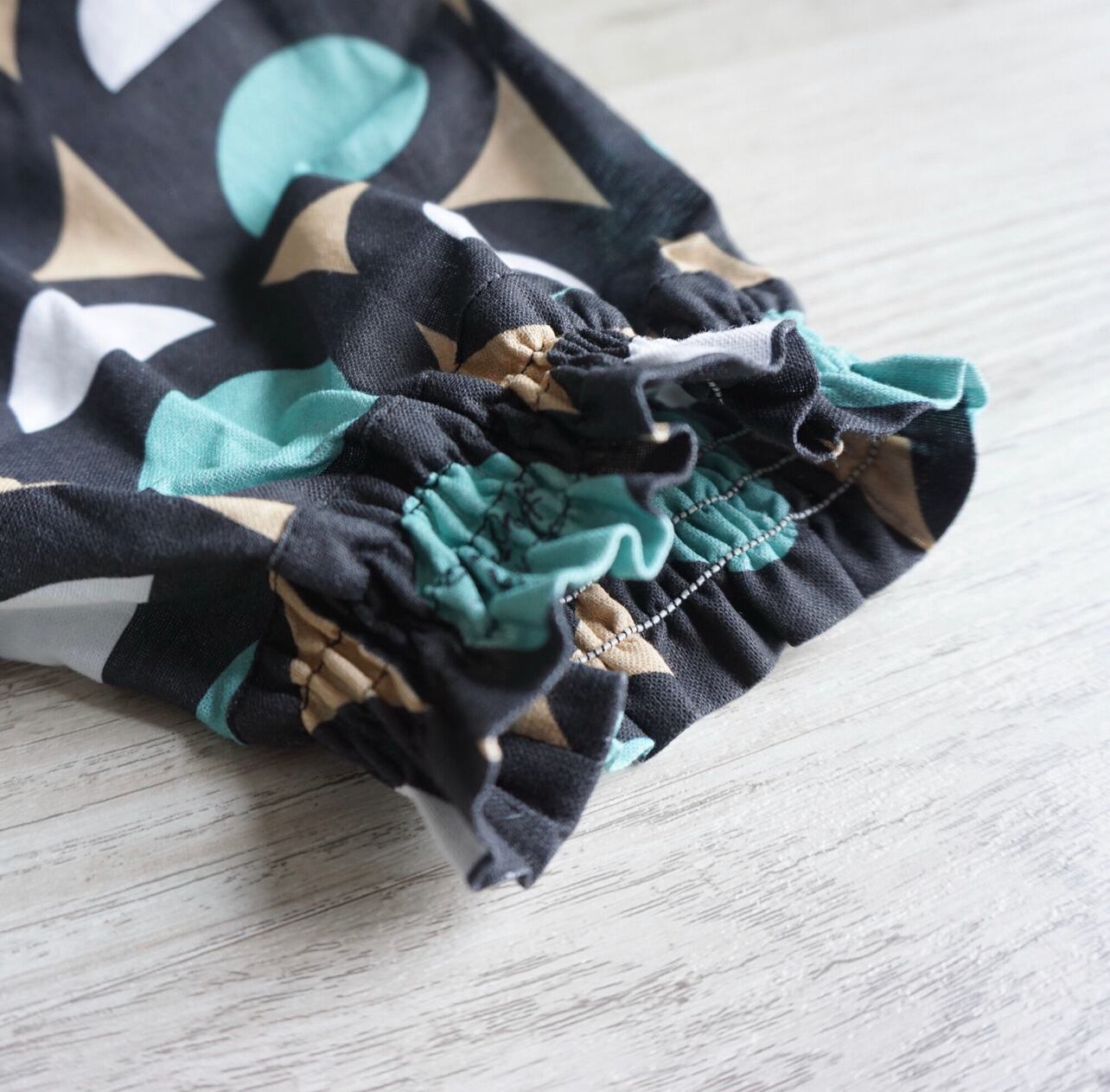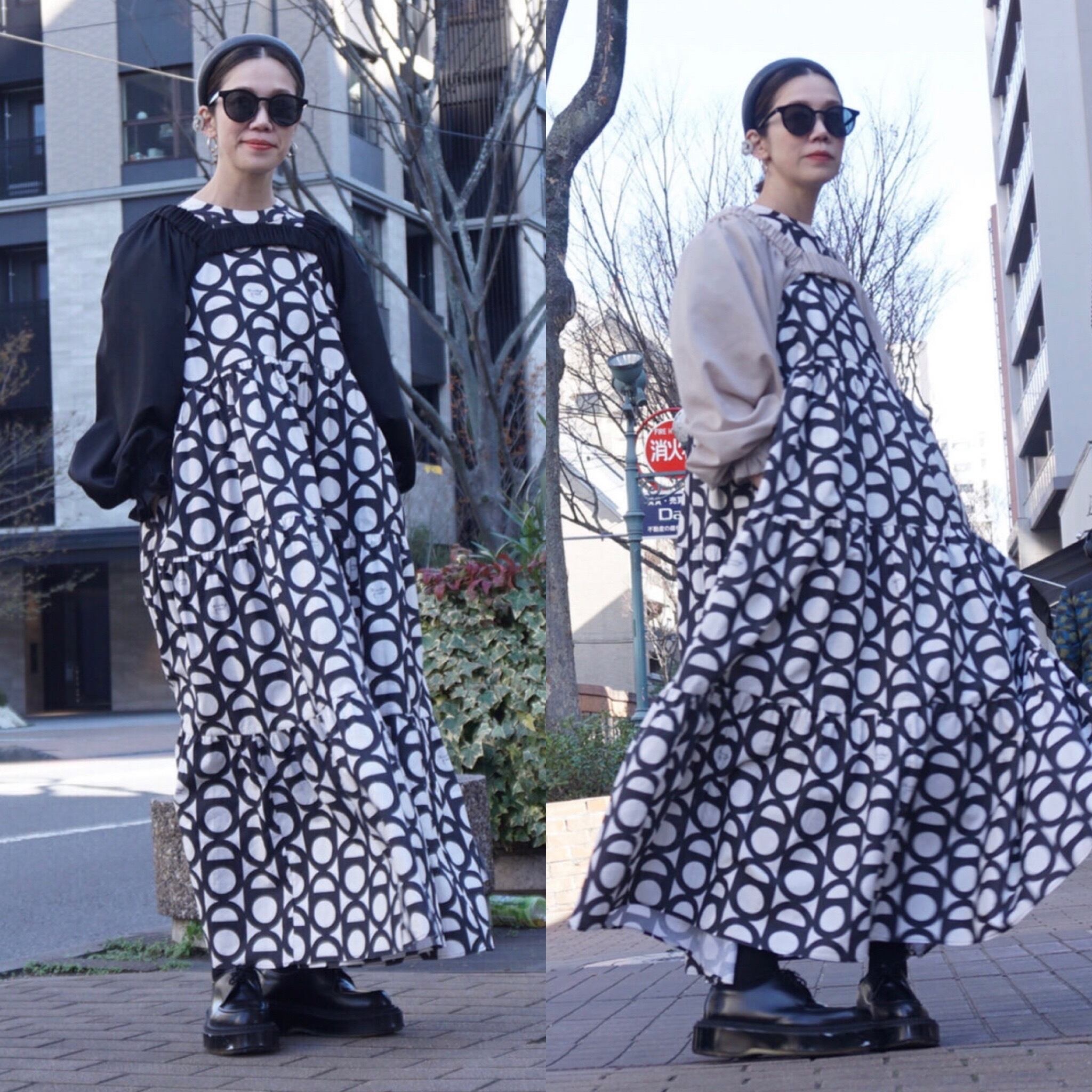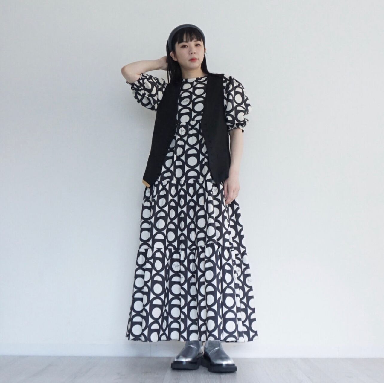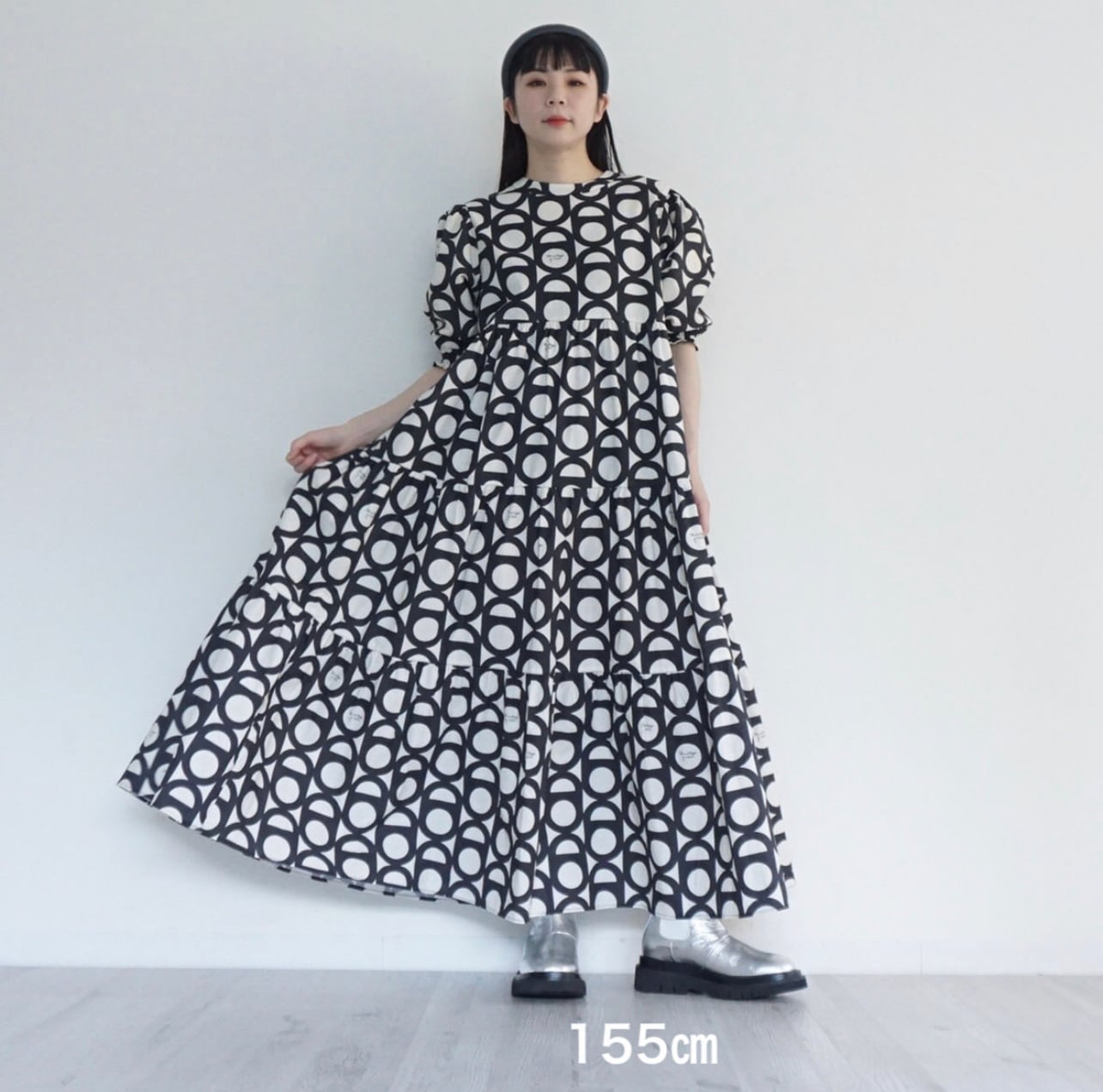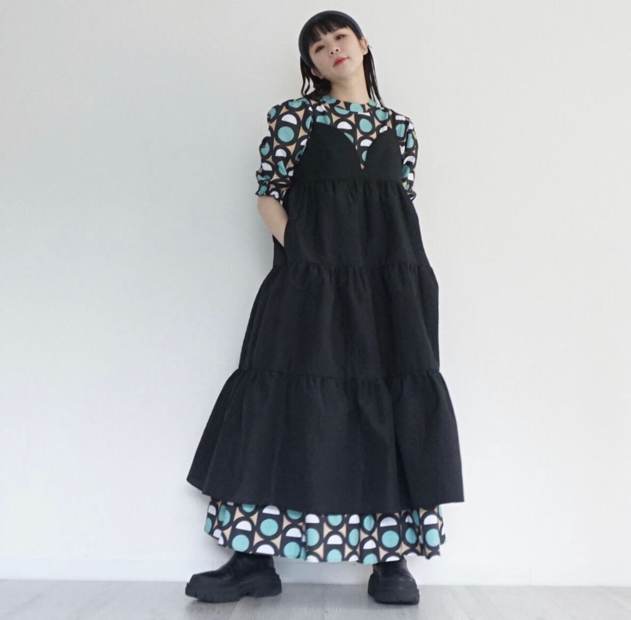 大きな広がりのあるティアードドレス。2段回の切り替えのギャザーで広がりのあるドレスをデザインしました。このドレスのシルエット、テキスタイルの厚み、ギャザー分量、首回り、袖口の膨らみとデザイン、全てとても気に入っています。今までいろいろなオリジナルテキスタイルに挑戦してみましたが、なかなかイメージ通りにはいかず、毎回学びもありました。今回のオリジナルテキスタイルはどれもイメージ通りでよく出来ているように感じています。これまではポリエステルで艶感の高い素材を選んできましたが、麻素材は初めてです。麻素材はややザラつきがあります。当然ネップが見られ、プリントが載っていない部分がありますが、そこは不良とはしていません。(麻素材に見られる特徴ですのでご理解ください。)麻素材、ラミーの上に幾何学的なグラフィックを作り載せています。ナチュラルではなく都会的な幾何学模様を載せてカラーを強めに入れてみました。あまりないデザインだと思います。何度か試作を行いテキスタイルデザインを試みましたが、早めに取り掛かったので、時間的に余裕があり、完成まで数回の作り直しができました。特にこちらのワンピースもよくできていると思います。ハリ感のある素材でのたっぷりとしたギャザー。ふくらみがありとても女性らしく、リッチでエレガントな雰囲気が感じられます。素材自体も高級感があるので高見えして見えるドレスです。