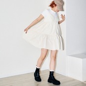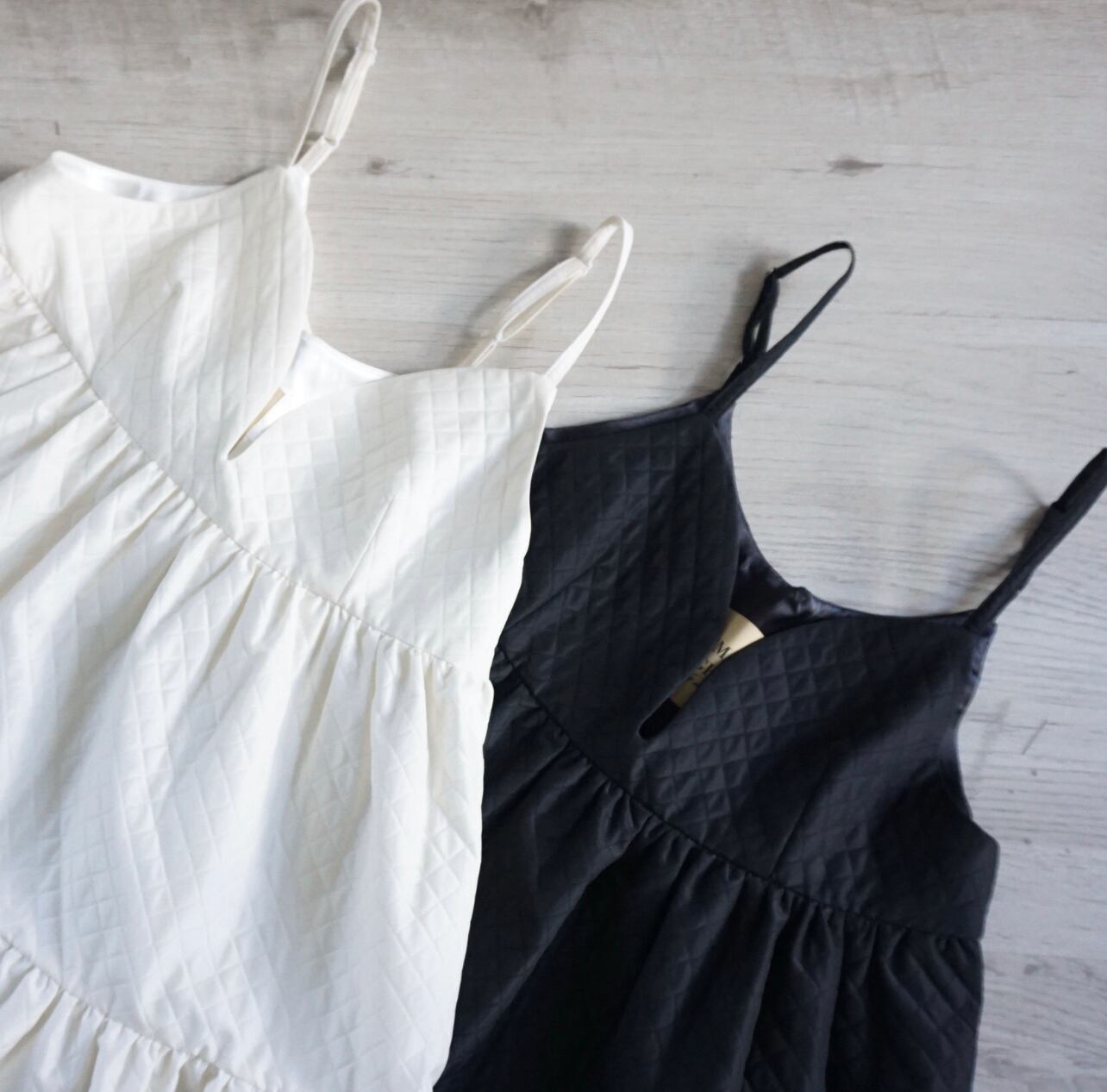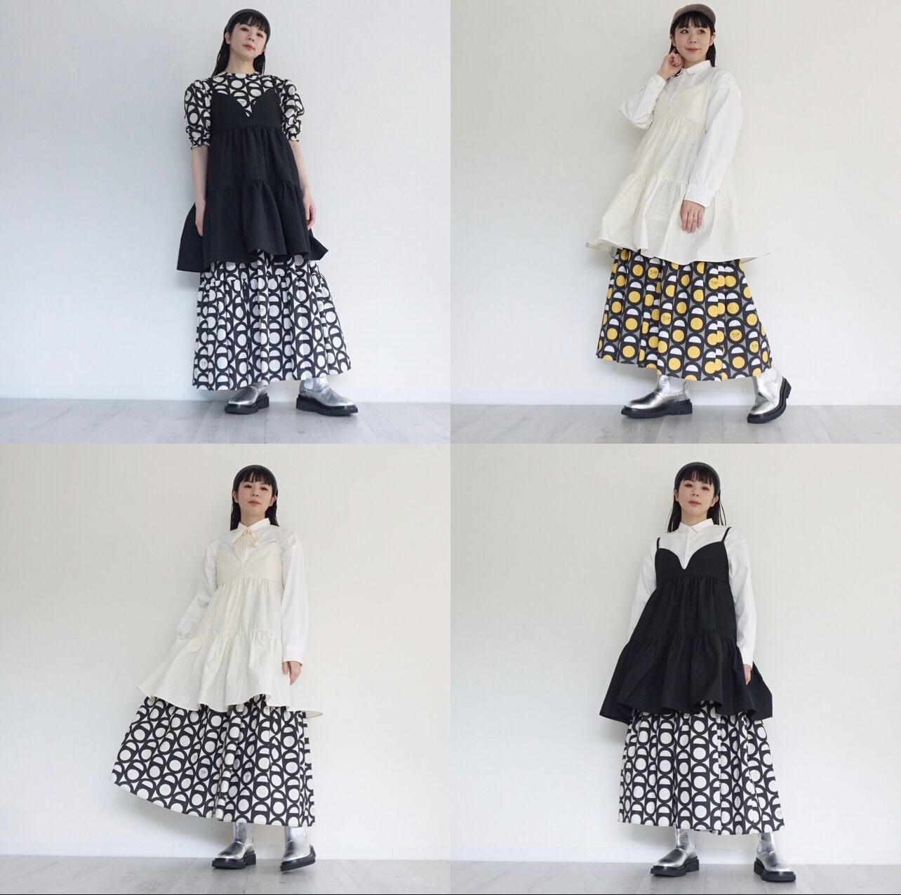 チャレンジしたかったふわっと広がりのあるドレス。これまでにも何度もチャレンジしましたが、素材感が今ひとつで今回のようにふんわりと広がる事ができませんでした。今回はかなりハリのあるキルティングされた薄手のポリエステルコットンを使用し、イメージ通りの広がりを出すことに成功しました。理想のシルエットでかわいいワンピースです。今回ミニ丈とロング丈を作っています。自信のある方は、真夏にキャミと合わせて一枚できて欲しい。夏以外ならタートルネックのニットやTシャツ、襟付きのシャツなど、何にでも合わせて着てもらいたいと思います。サイドジップ付きで使いやすいです。