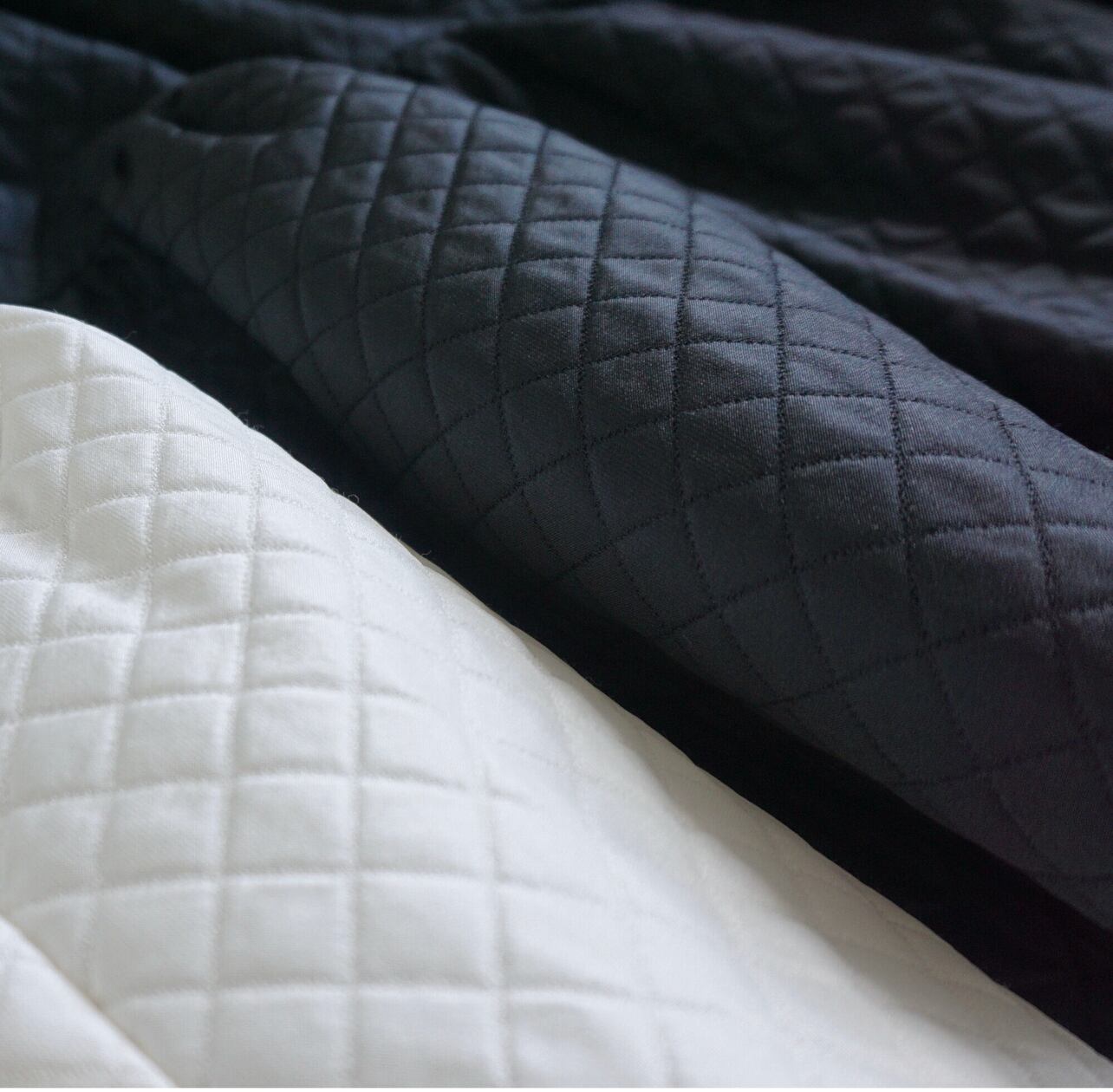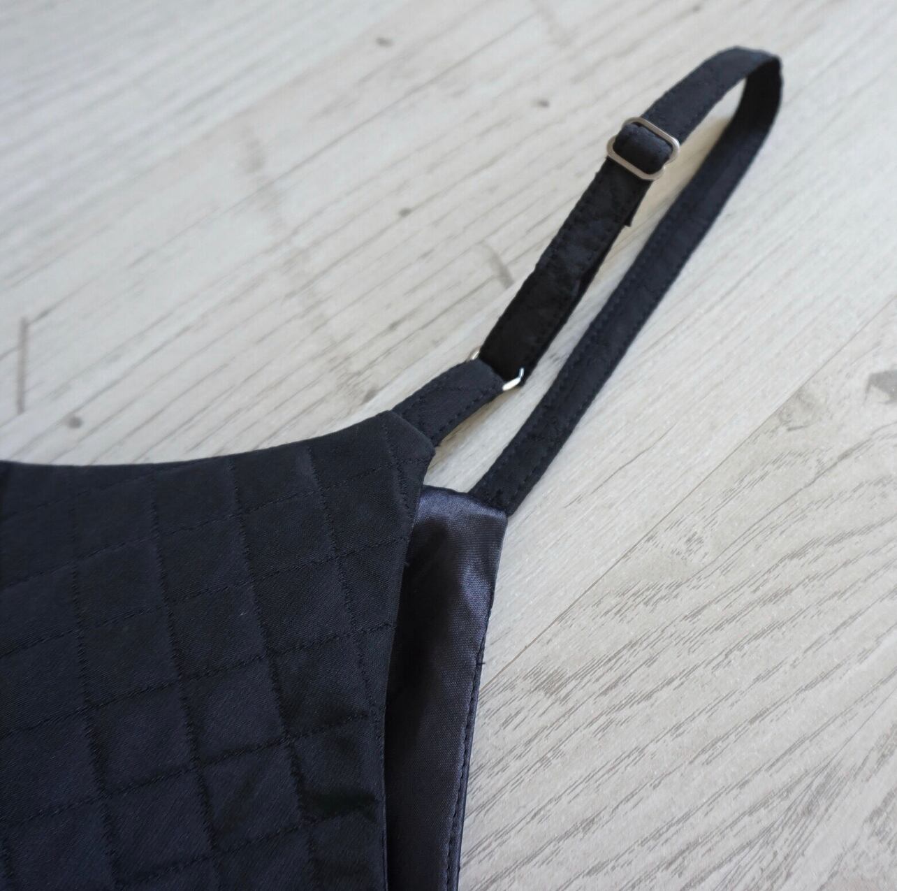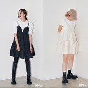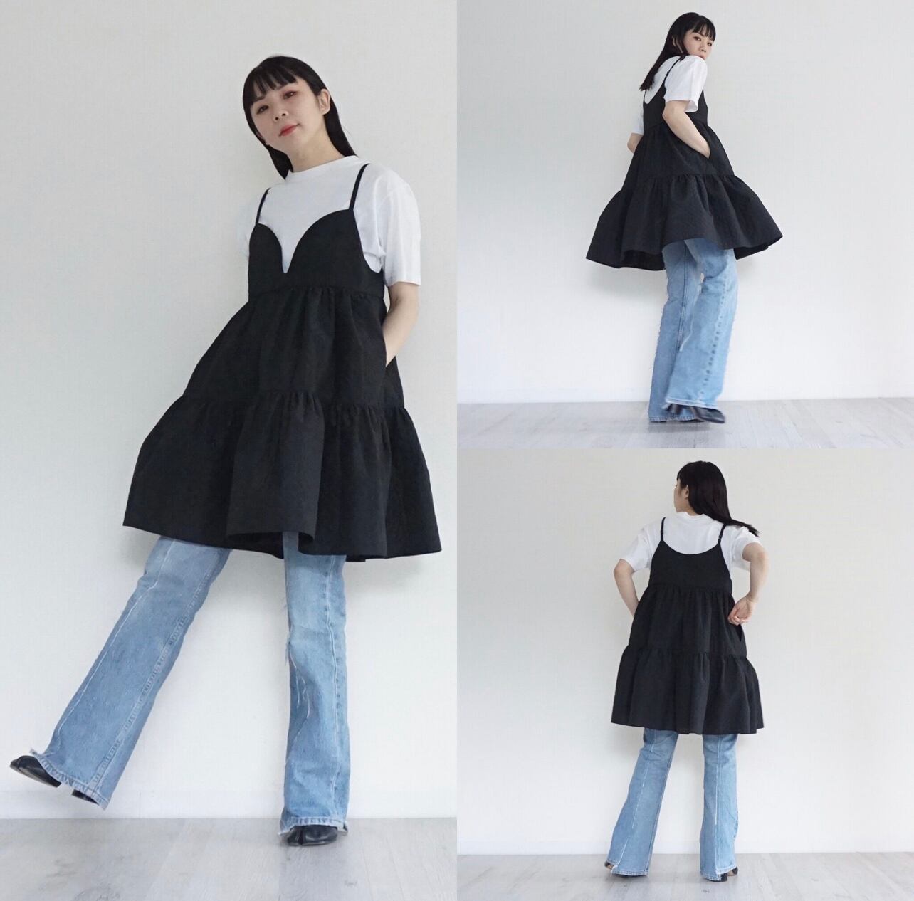 膝上丈なので、スリムパンツや細身のパンツに合わせてもかわいいと思います。デザインする上で気を使ったのは胸のカッティングです。程よい丸みがあってこれまでに作った事のない丸い形状のV部分が特徴的です。また生地は日本製のあらかじめキルティングされた薄手の素材で、今の気分にぴったりで、また高級感も感じられる凹凸のある素材です。今回のこのドレスは付け袖アタッチドスリーブとセットで合わせてみたくて作ってみました。カジュアルダウンするなら中にロゴ入りのTシャツなどで合わせて普段使い。きれいめならホワイトのタートルニットやカットソーなどで合わせてみてください。大の自信作です。