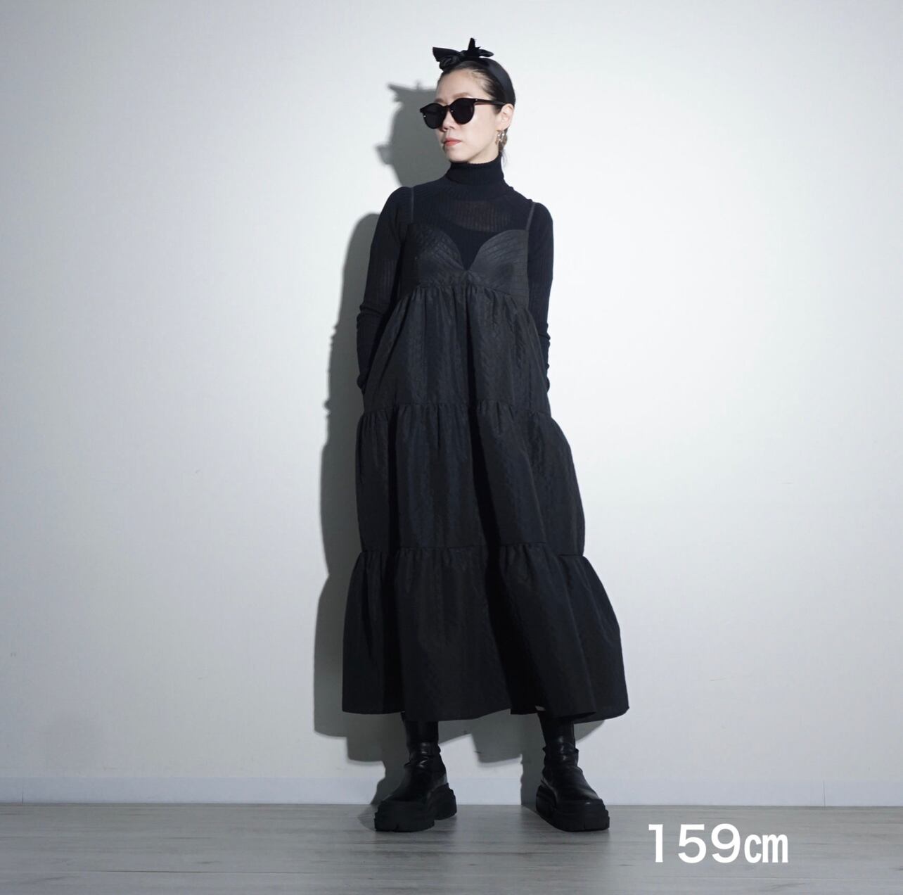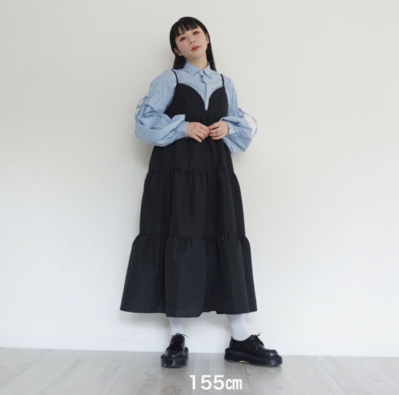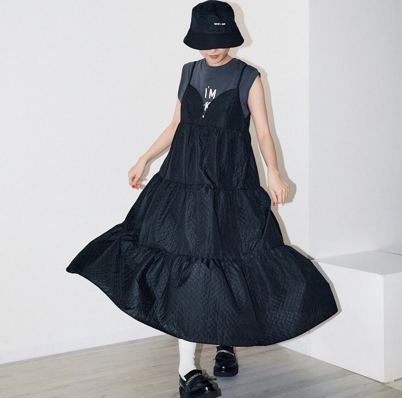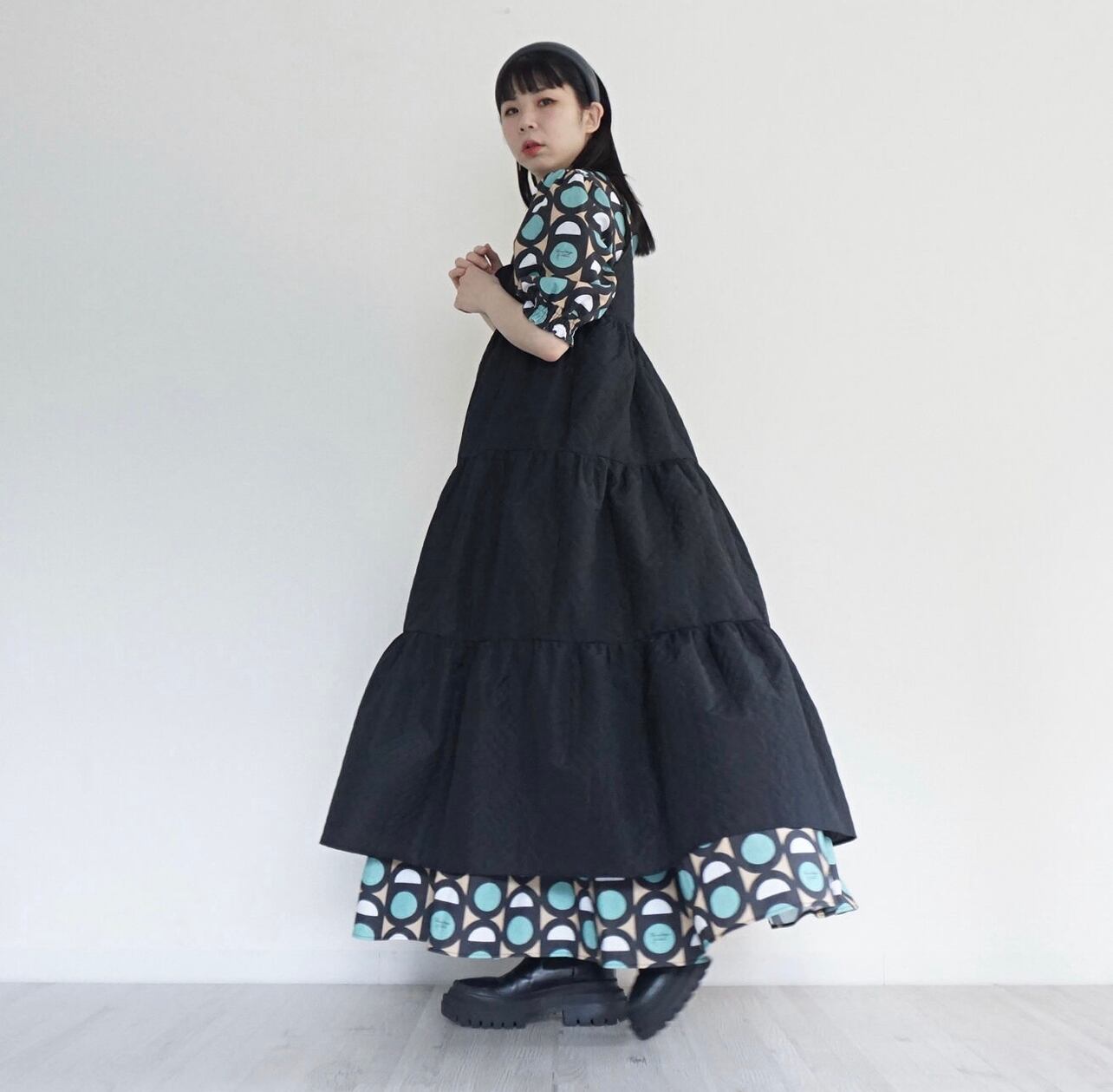 大人も気軽に着れるロング丈を作っています。体型を拾わず、ティアードのスカートの広がりがとてもエレガントです。ミニ丈に抵抗のある方はこちらをお勧め。露出を抑えつつ、美しいスカートの広がりが楽しめて1枚あるとアレンジが楽しくなるドレスです。ボウタイ付きのシャツなどを合わせればきちんとしたお食事の席でも映える1枚だと思います。プレーンなTシャツなどで着崩すのも良いと思います。今回のコレクションの一番のお勧めです。