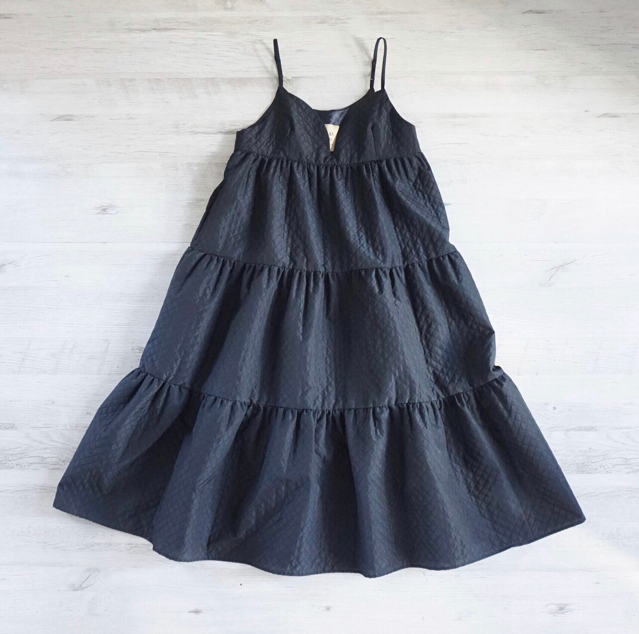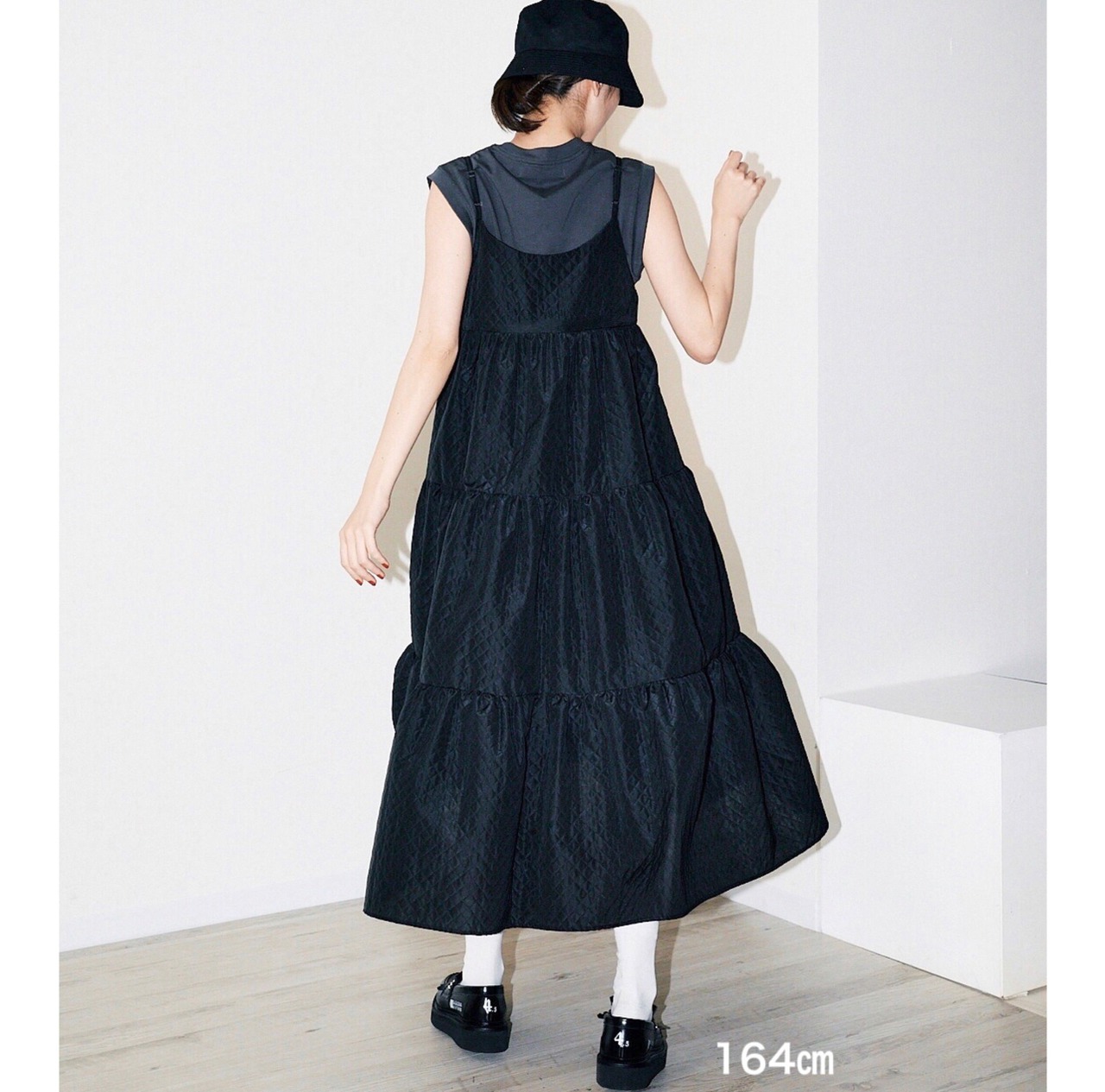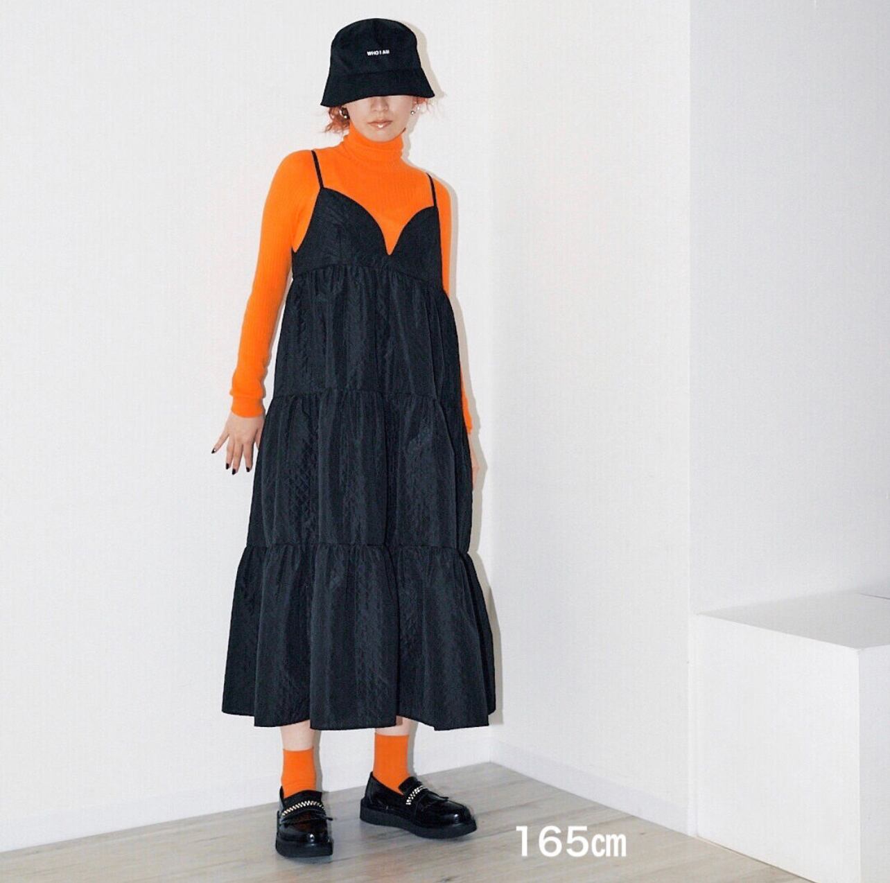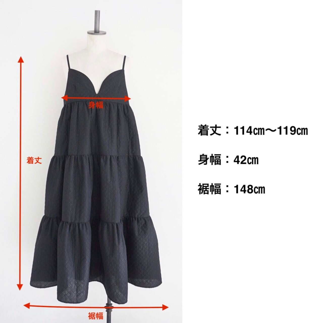 大人も気軽に着れるロング丈を作っています。体型を拾わず、ティアードのスカートの広がりがとてもエレガントです。ミニ丈に抵抗のある方はこちらをお勧め。露出を抑えつつ、美しいスカートの広がりが楽しめて1枚あるとアレンジが楽しくなるドレスです。ボウタイ付きのシャツなどを合わせればきちんとしたお食事の席でも映える1枚だと思います。プレーンなTシャツなどで着崩すのも良いと思います。今回のコレクションの一番のお勧めです。