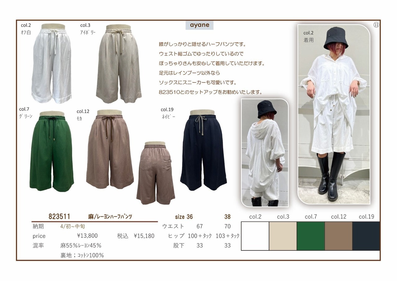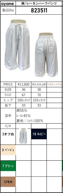 予約販売【 ayane 】麻/レーヨンハーフパンツ (823511)4月お届け