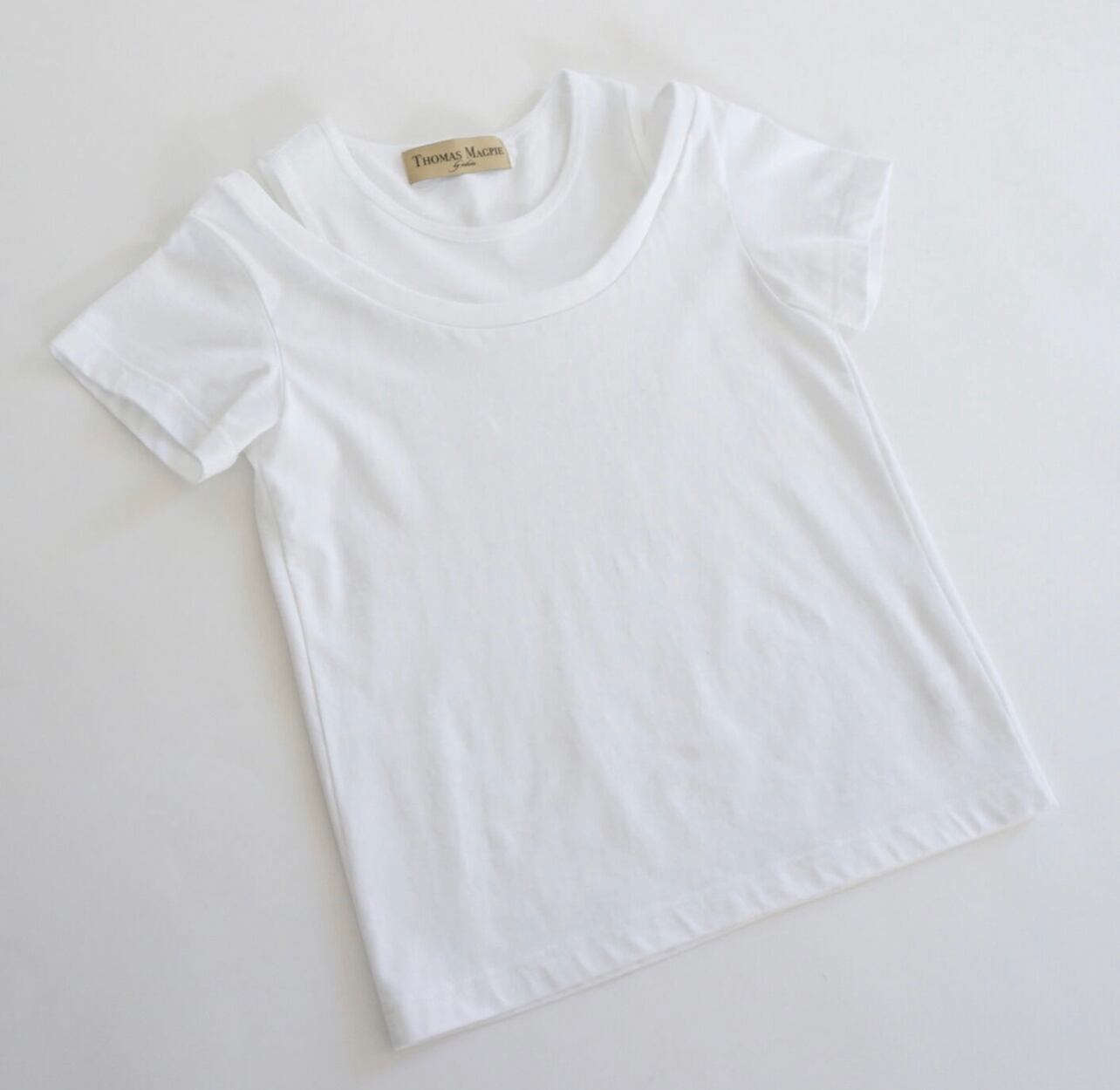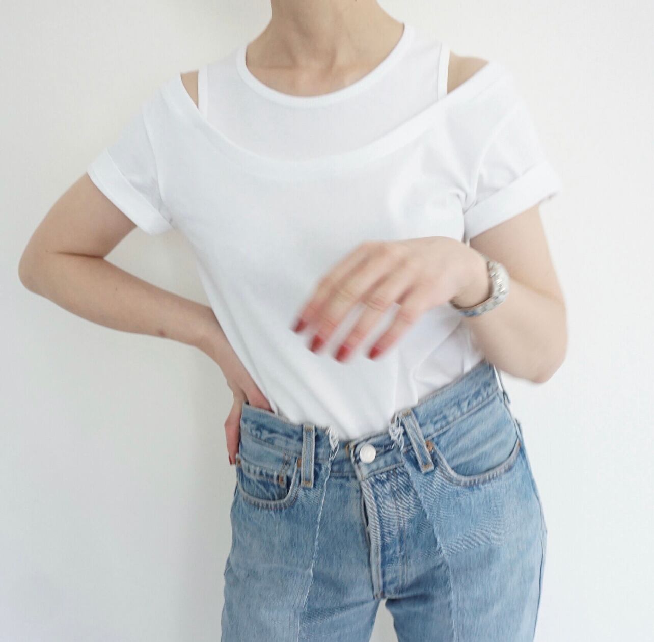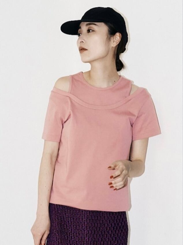 タンクトップに重ね着をした様なデザインのTシャツを作りました。昨年、長袖でストレッチのレイヤードカットソーを出しましたが、何度も研究してサンプルの作り直しをしたにも関わらず、オーダーが少なく素材とのプライスバランスが悪かったため、生産にいたりませんでした。ですが、今回はコットンに替えショートスリーブで大幅に形をかえて再チャレンジのデザインです。前回のよくなかった点を改善して肌触りの良いカットソー素材で非常にバランスよくできました。今回は更に改善する予定で、ブラのストラップがあまり見えないようにパターン修正を行うことにしています。少し前からレイヤード風のTシャツは人気でしたが、セクシーずぎにならずにさらっと大人が切れるデザインにしてみました。