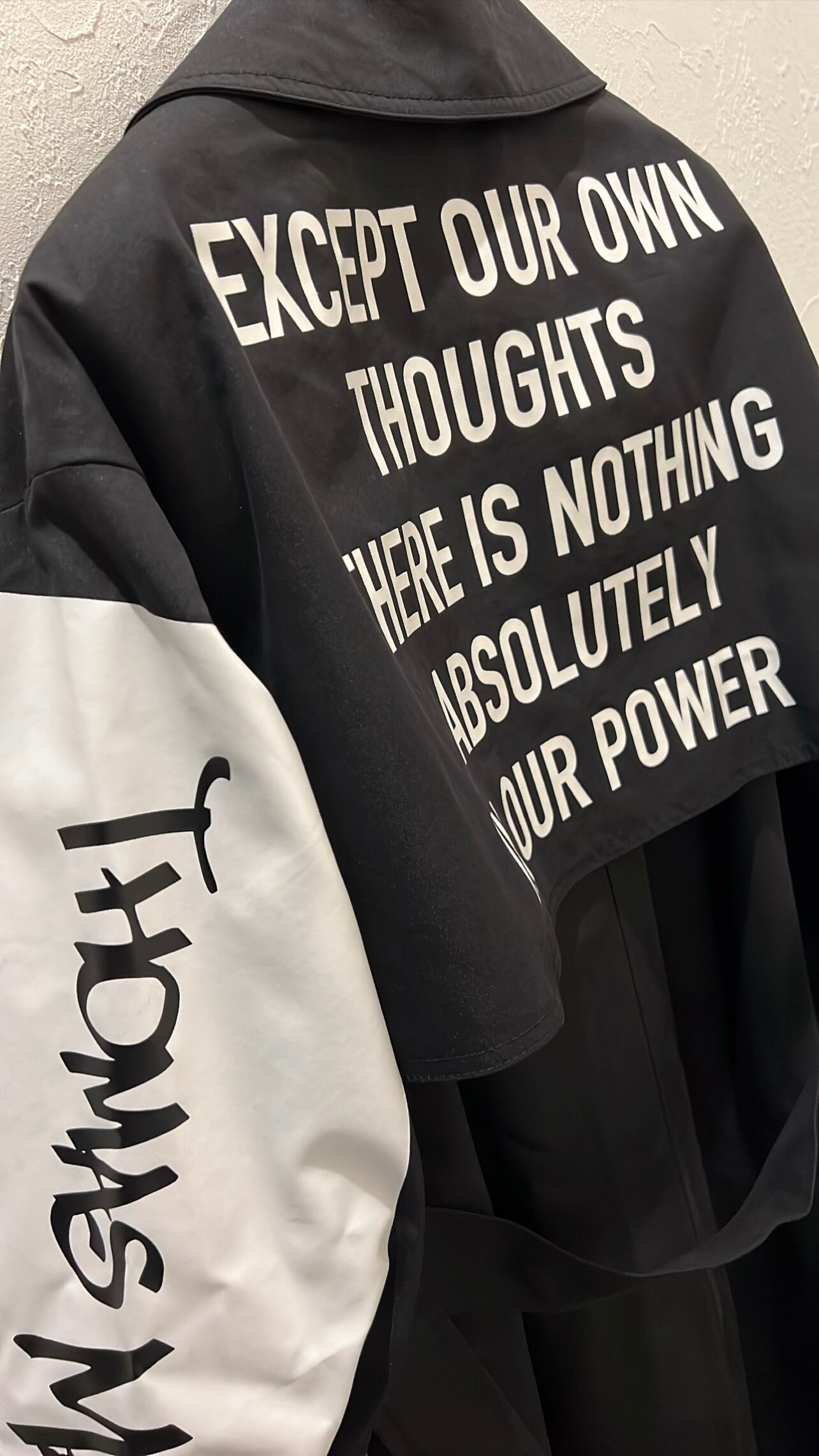 ルネデカルトの言葉を用いてプリントしています。片腕には白塗りにしてブランドネームであるTHOMAS MAGPIE とプリントを入れています。他にあまりないような派手なデザインでしたが思った以上にヒットしました。