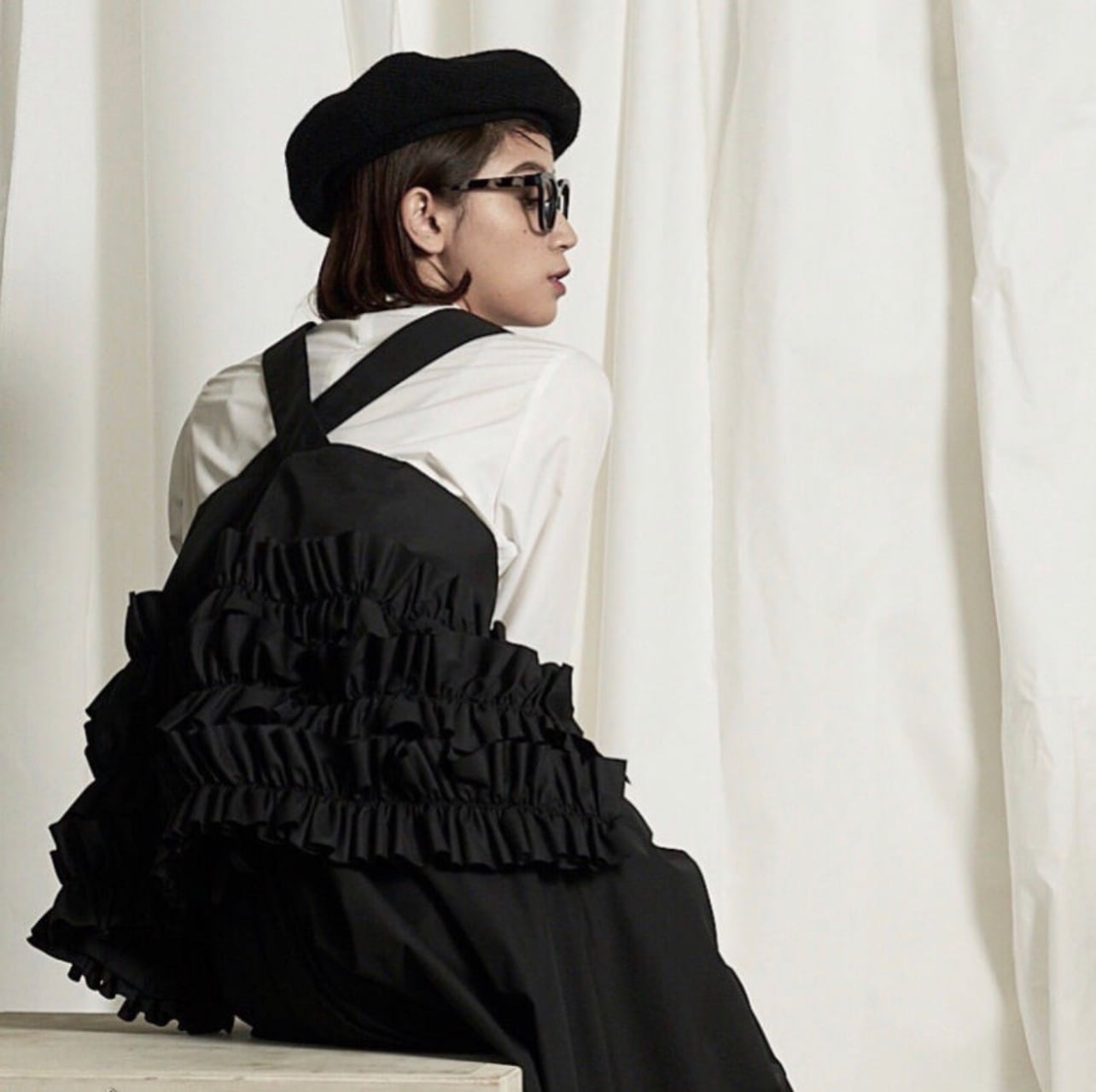 シンプルなシャツやTシャツなどなんでもないお洋服に加えると変化ができ、楽しめる1枚になると思います。フリル部分に隠しポケットが付いています。なのでポケットのないワンピースやスカートに合わせて着ると、ポケットとしても便利に使うことが出来るようにしました。白いTシャツとロングスカートなどに合わせてみてください。コーディネートに華やぎが出ると思います。普通のお洋服の着方に飽きてきたという方にぜひ。