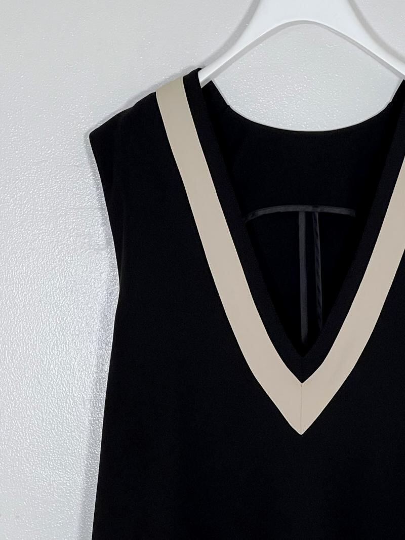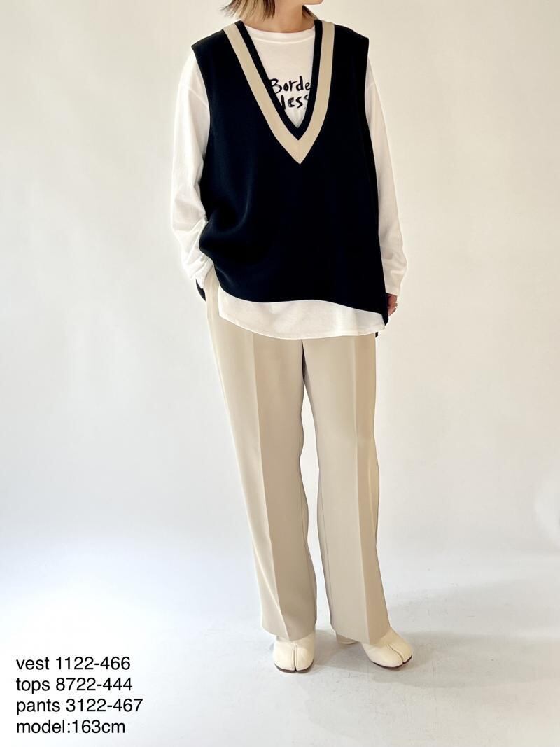 定番人気の肩タックベストプルオーバーの形をベースに、衿ぐりに施した太めの配色ラインがポイントです。