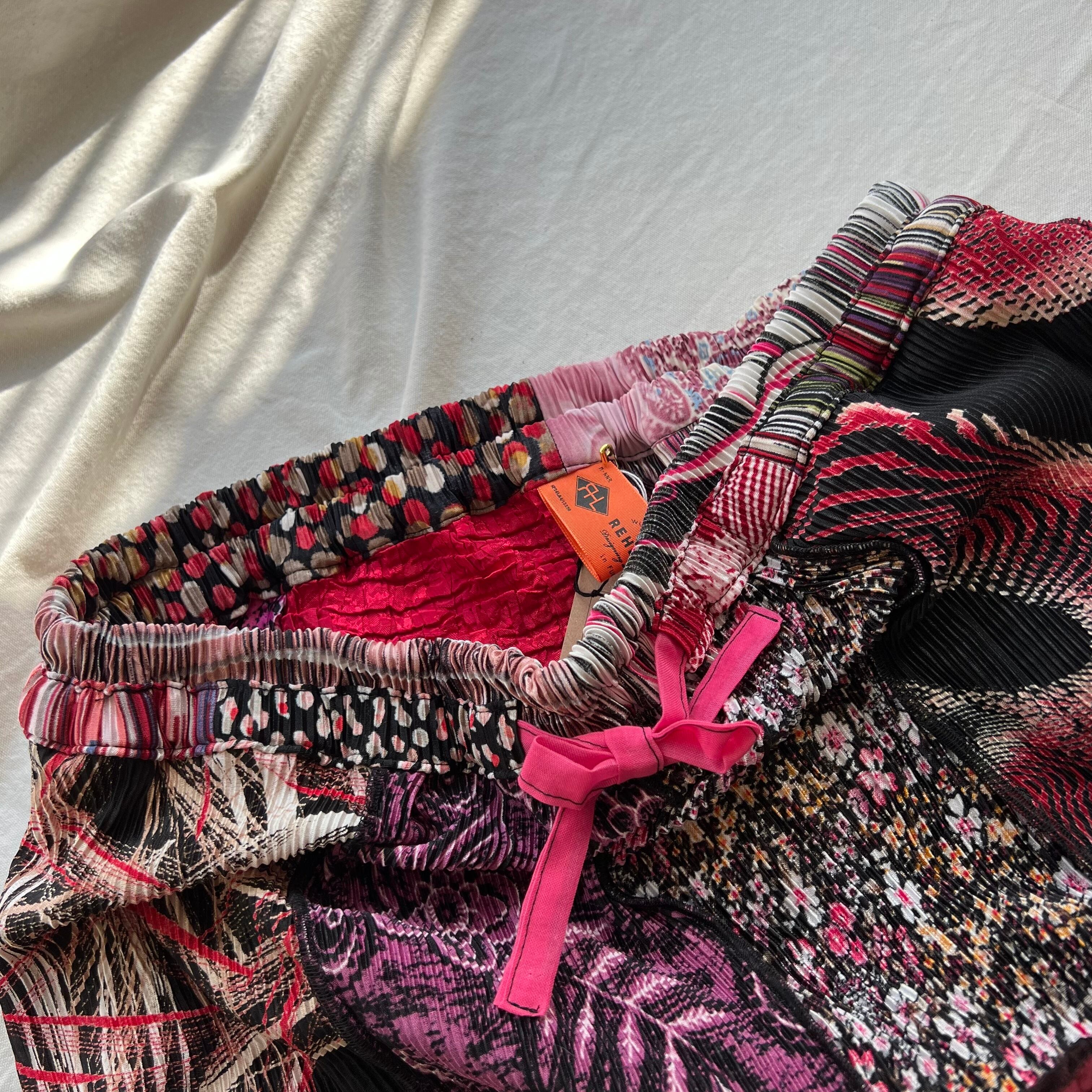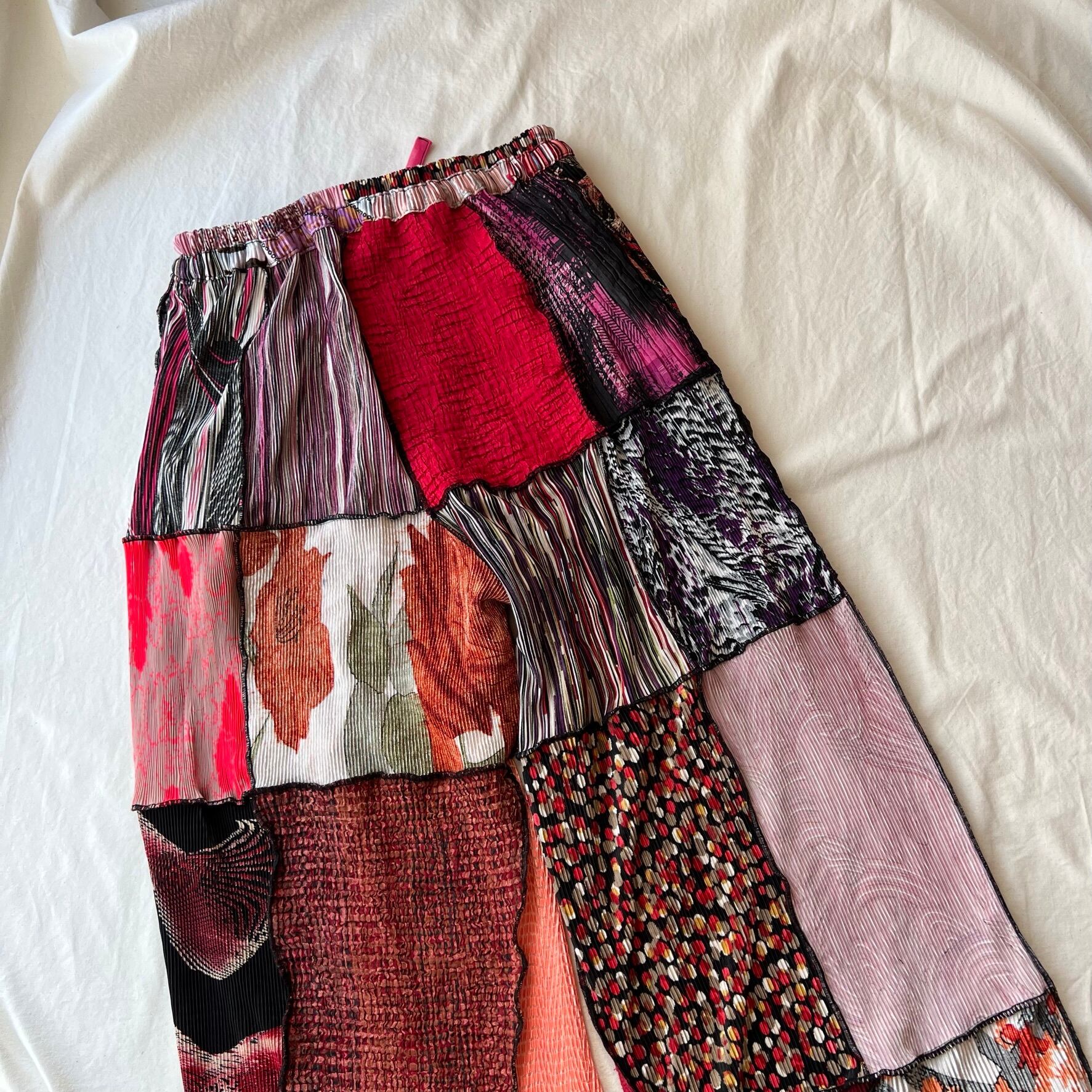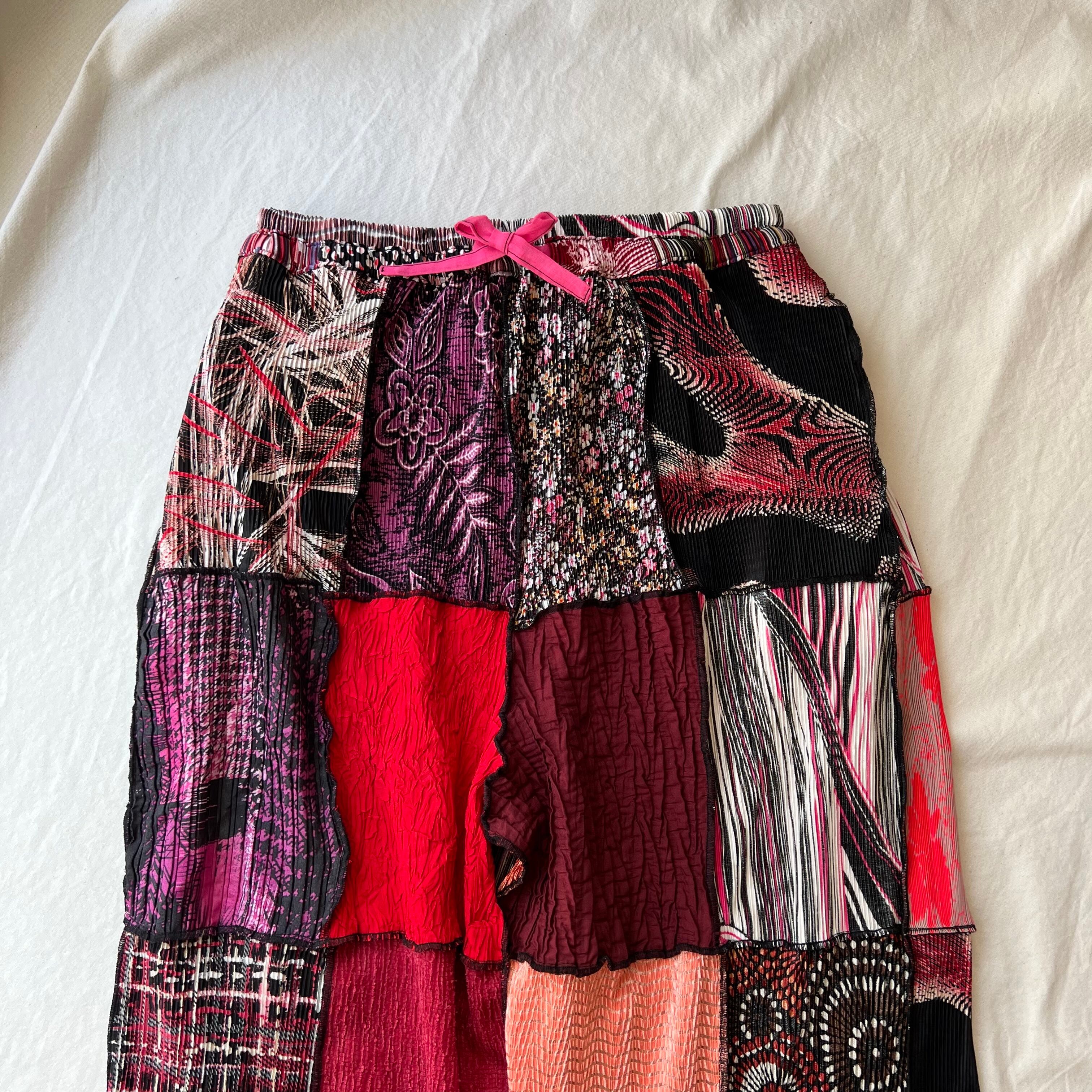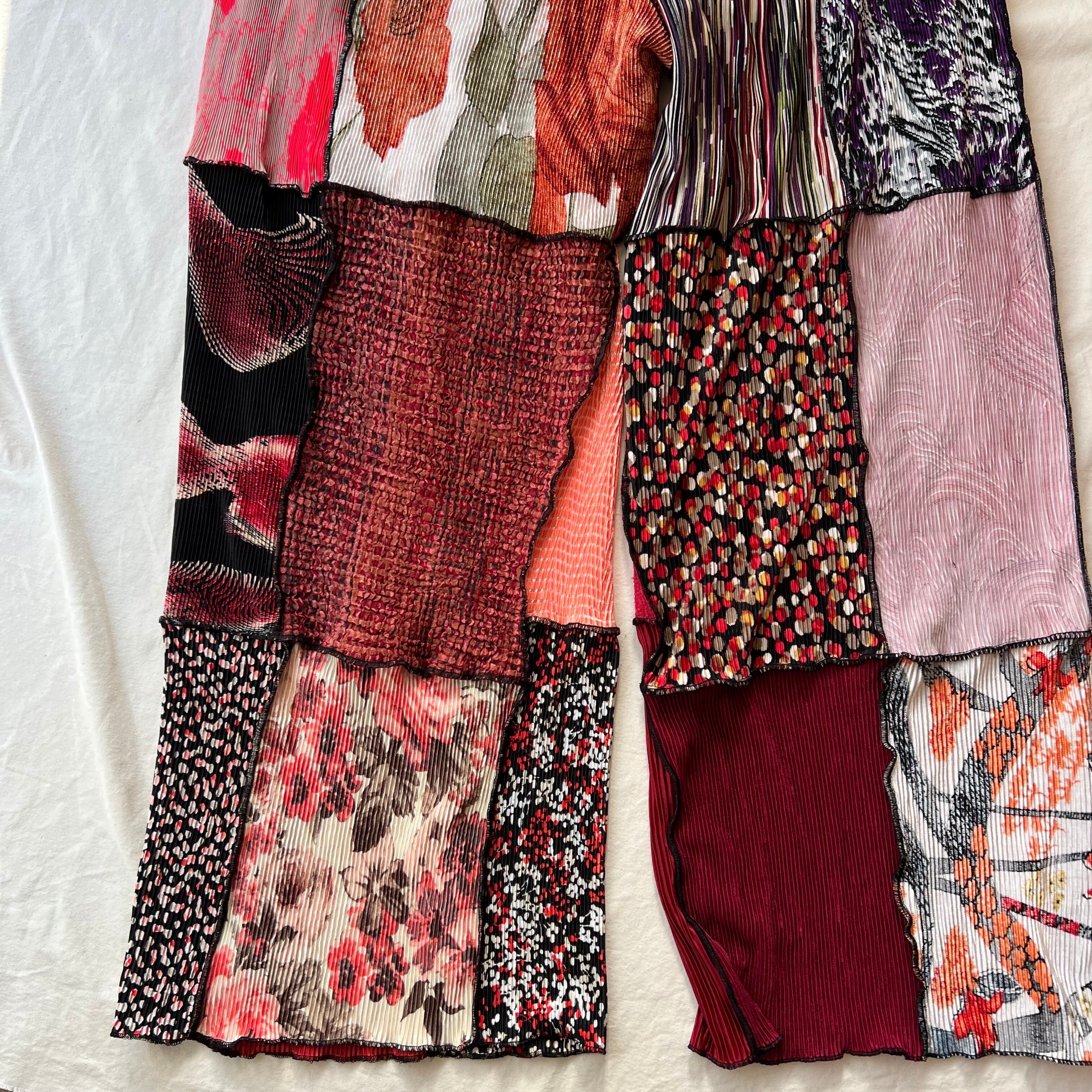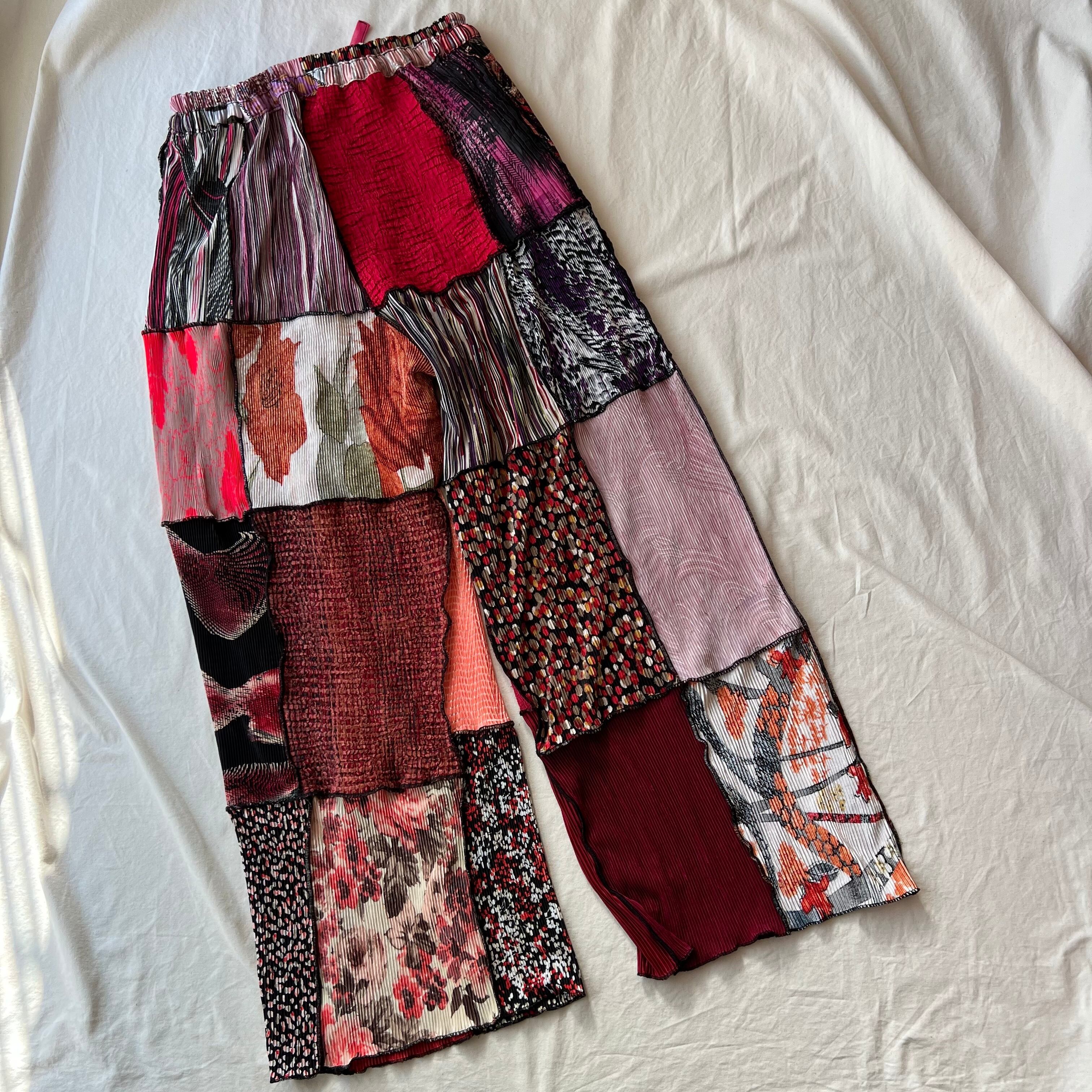 古着のプリーツトップスをたくさん集めてパッチワークして作られたパンツです。