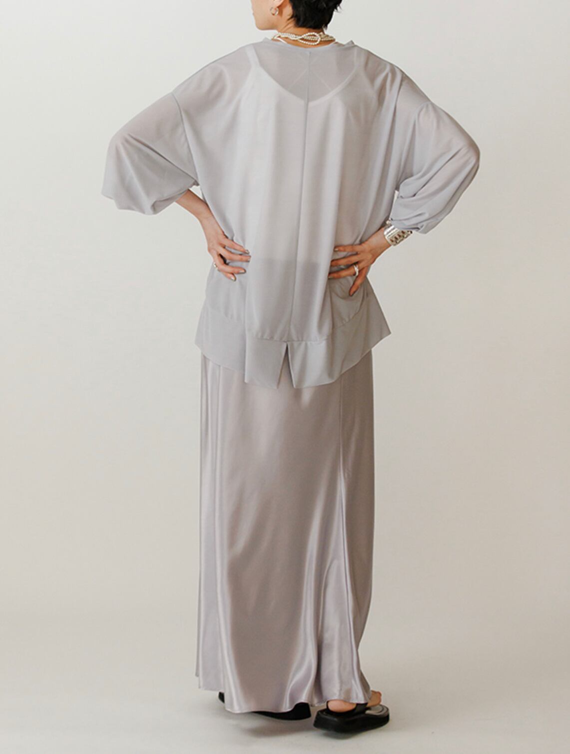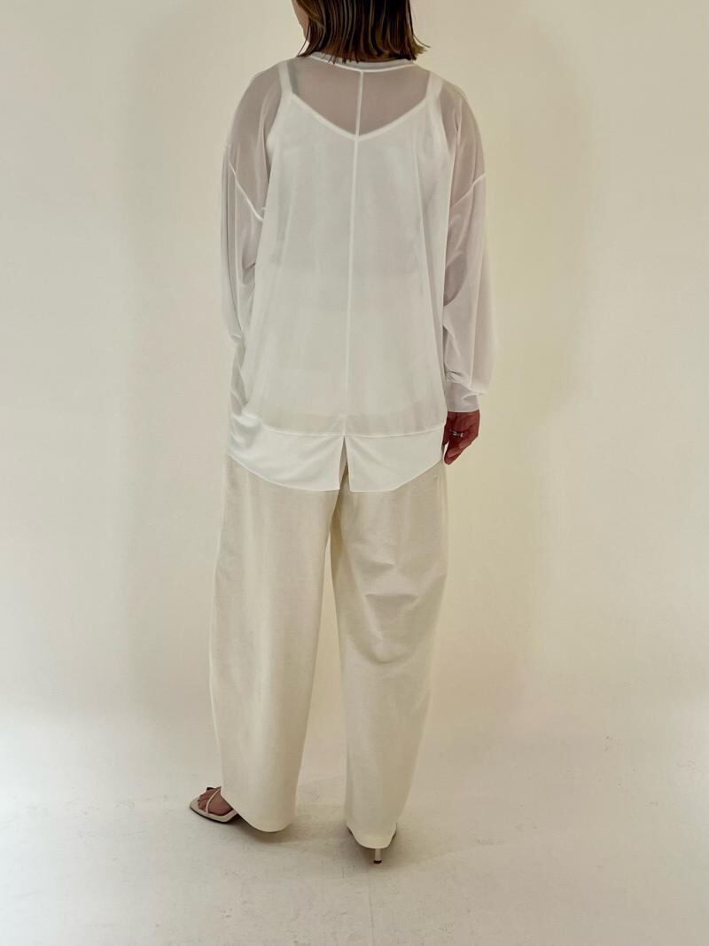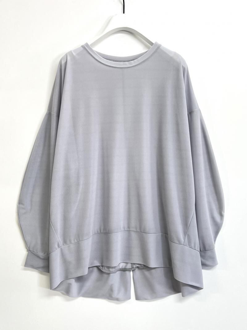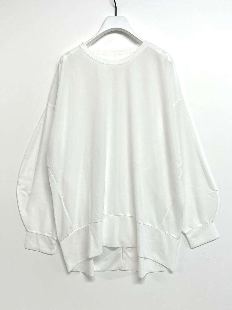程よく透け感のあるデザイントップスです。さらりとした肌触りと適度な落ち感のあるテレコ素材をセレクト。ルーズなサイズ感と袖口のボリュームで女性らしさを演出しました。バックスタイルにはスリットを施し、シンプルながらも単調にならないように設計しました。