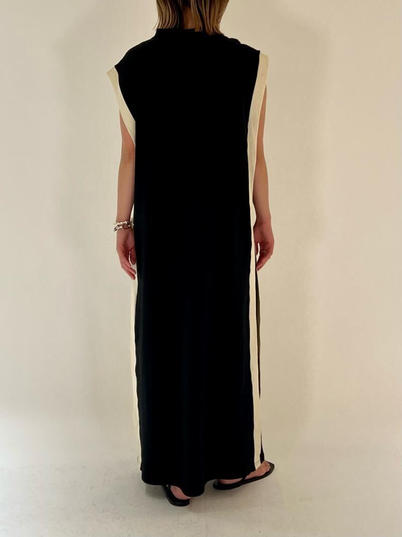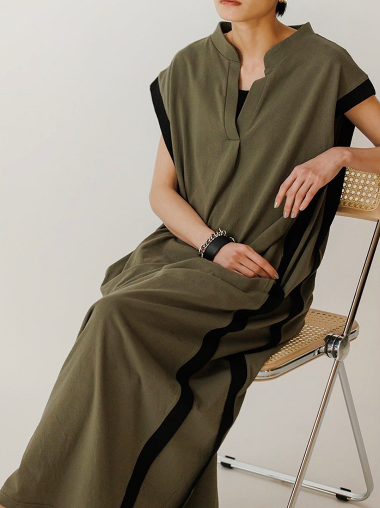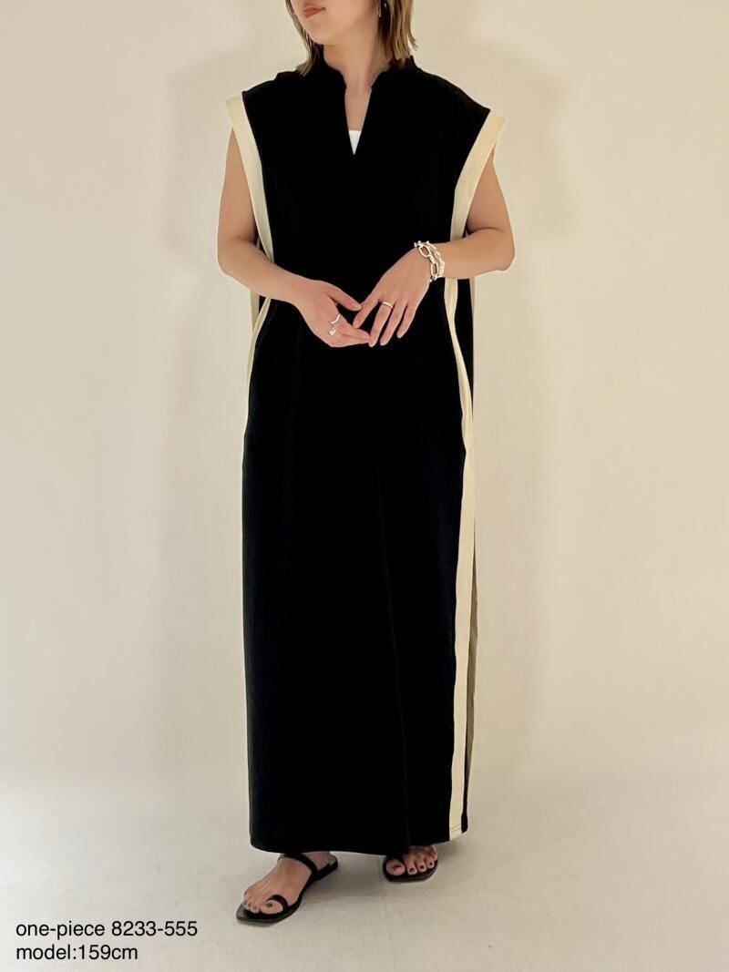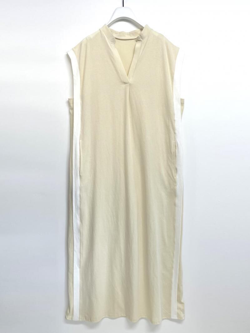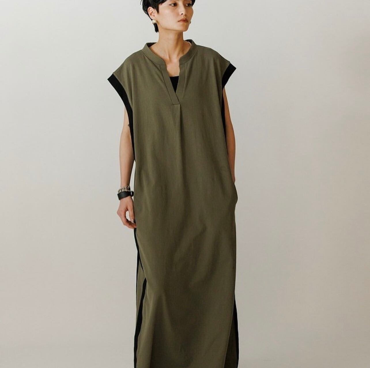 サイドのラインがアクセントのカットソーワンピース。ワイドな身幅やフロントのスキッパー開きでリラックスな印象に仕上げ、サイドのマチで立体感を設計しました。配色のラインでスポーティーな印象と、縦のラインを強調することでスタイルアップ効果を演出。1枚完結で着用できるラクチンスタイルに。