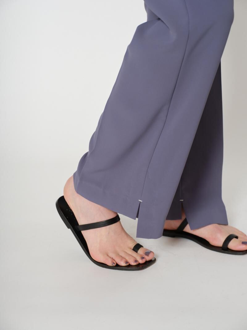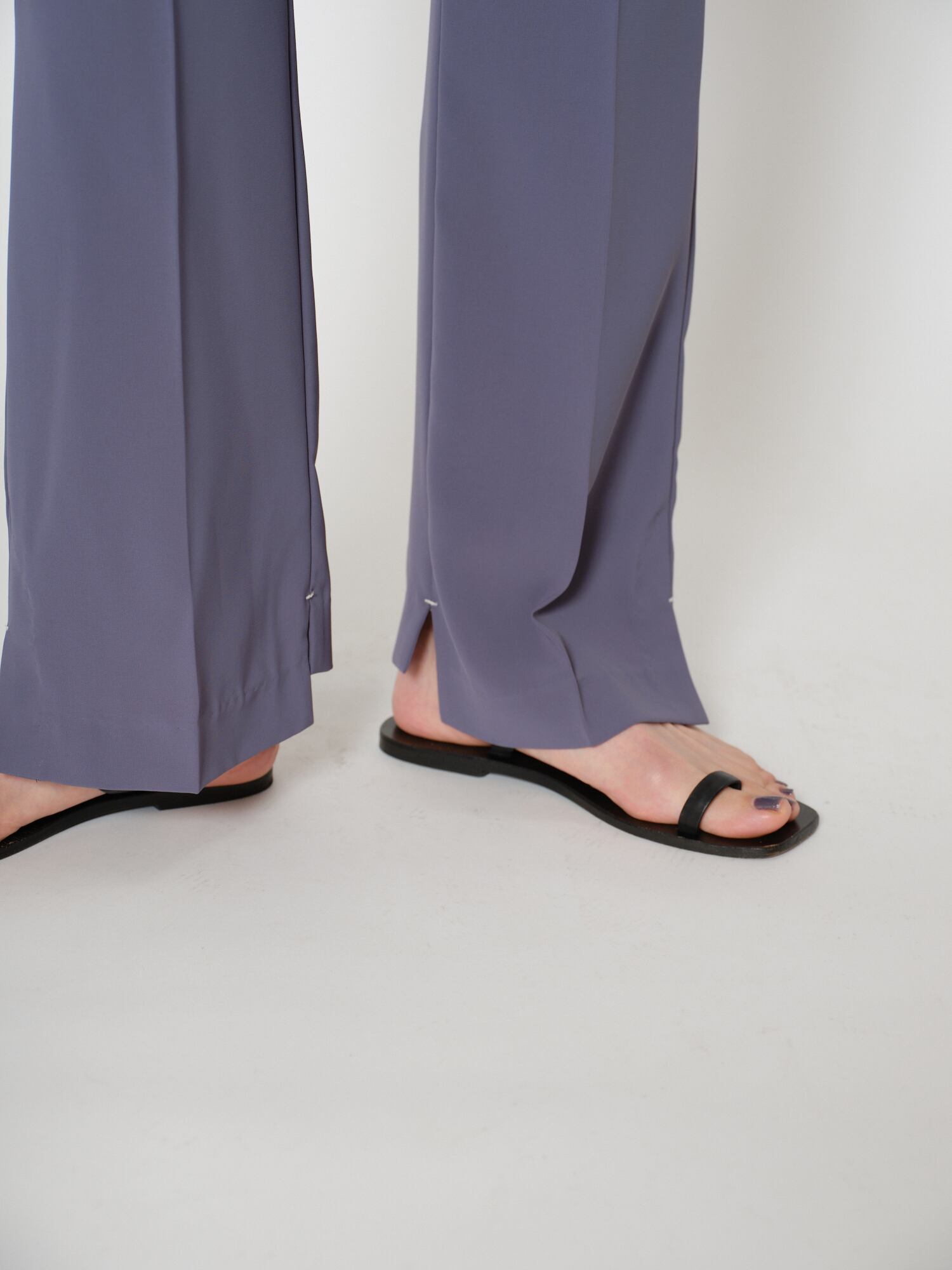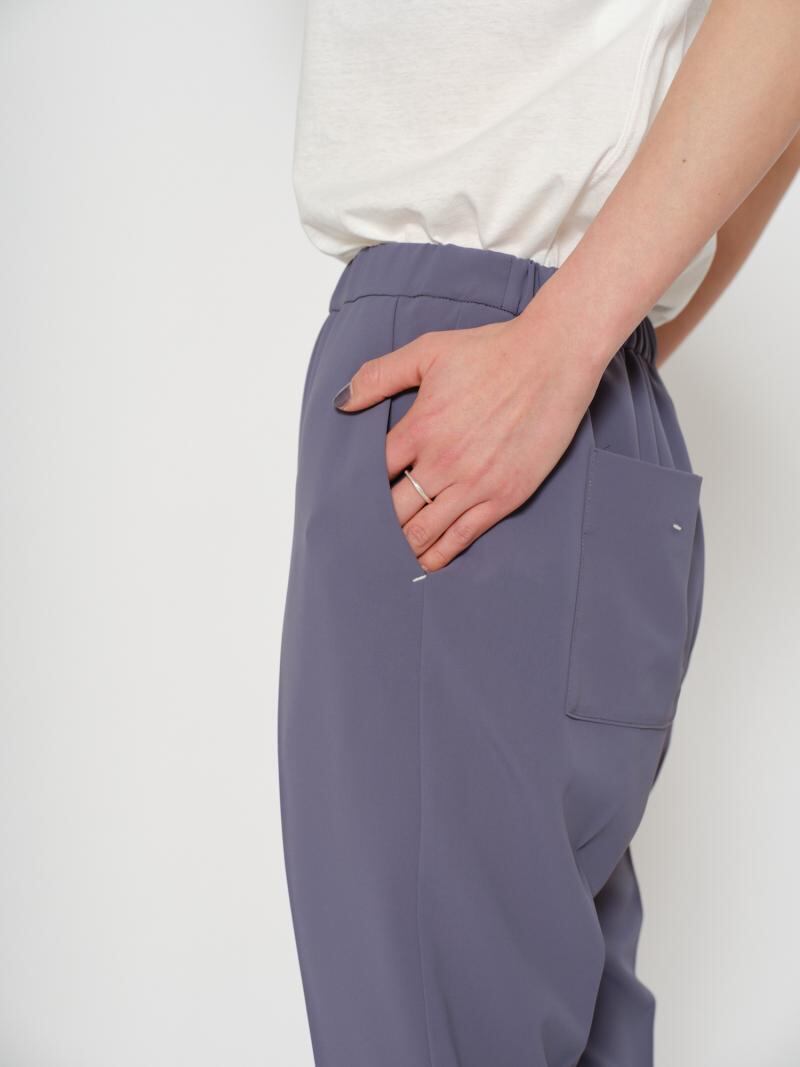 裾は前が長く後が短い段違いになっていて、パンツの裾を引きずりにくい、かつ足長効果を生むデザインです。