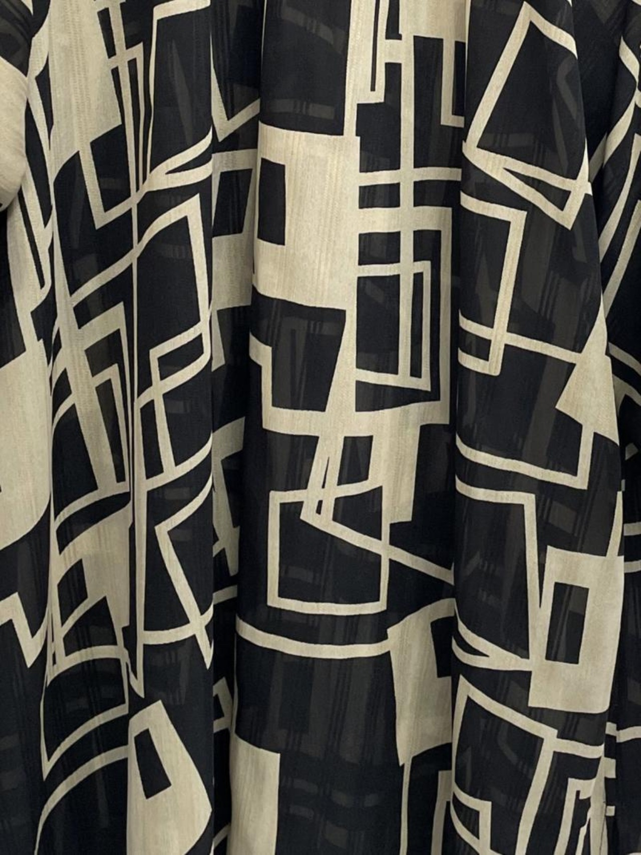 透け感のあるストライプドビーに、さらにジオメトリック柄がプリントされている素材を使用しています。