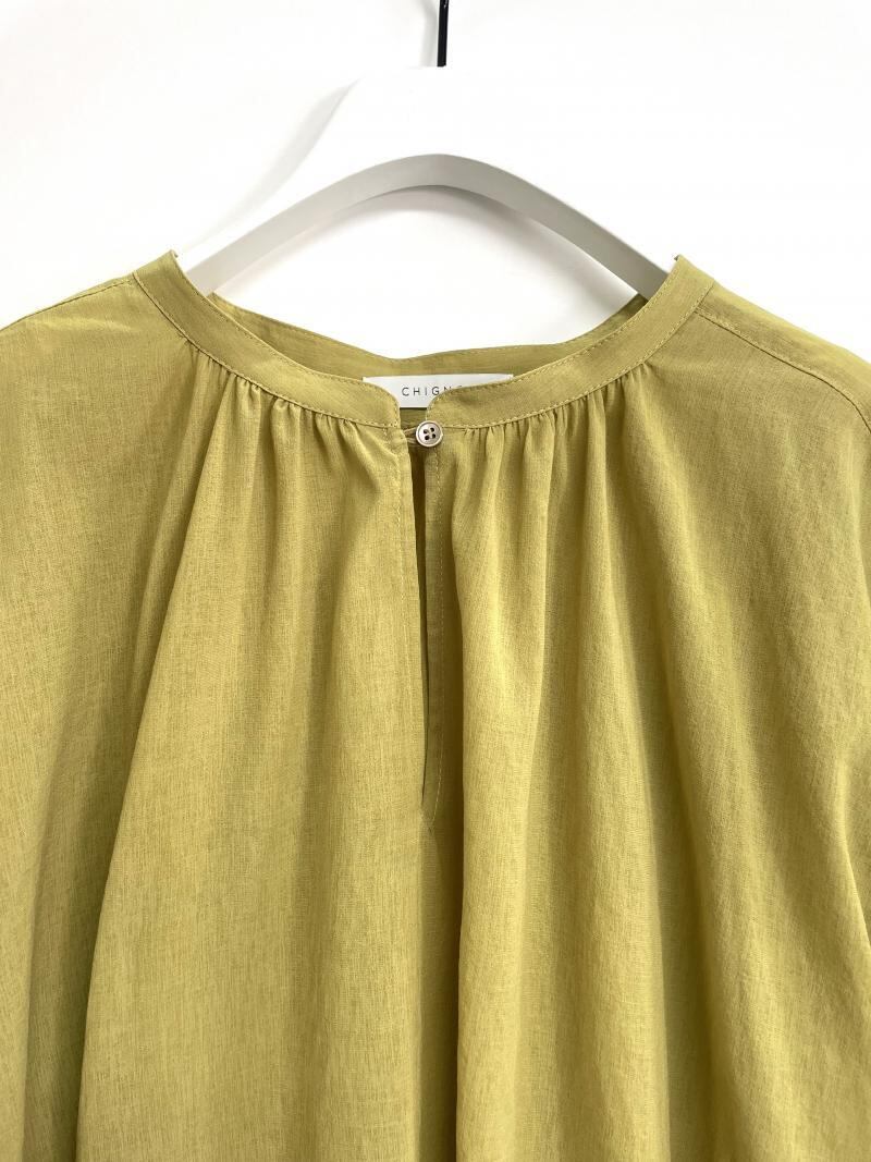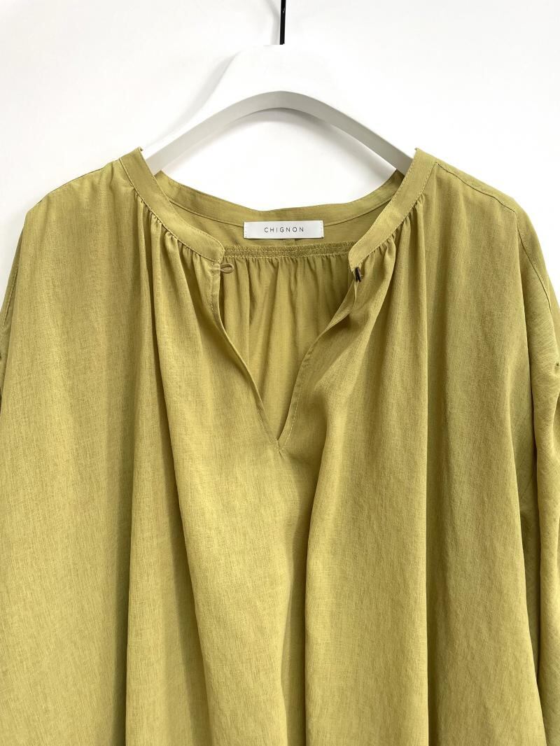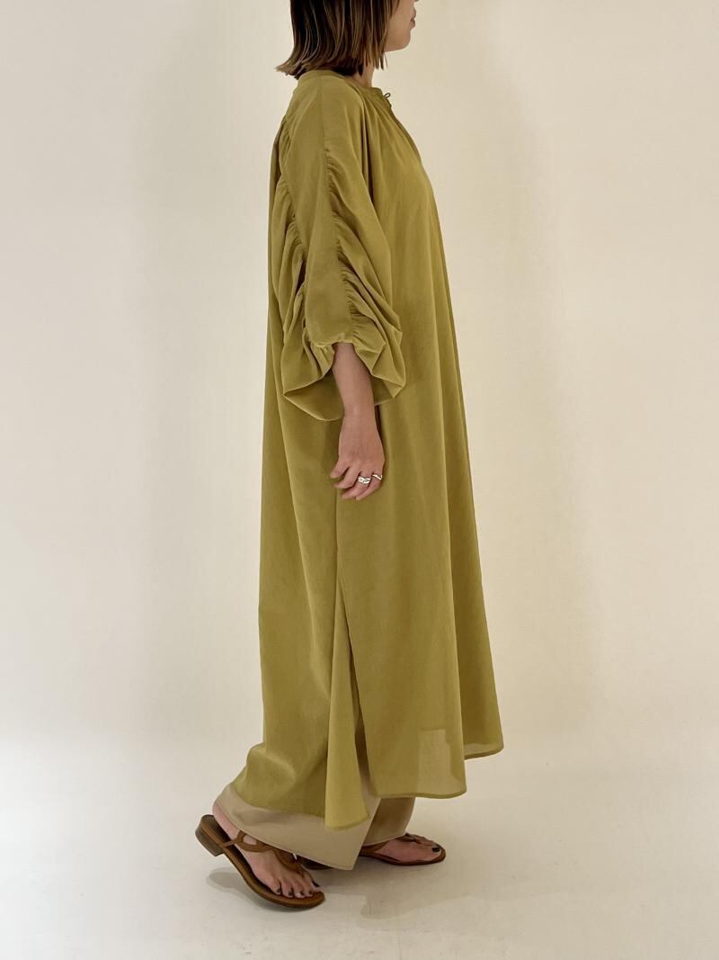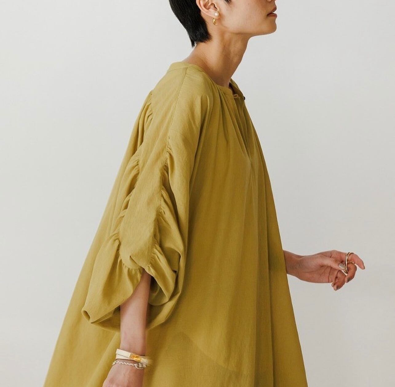 袖山~後ろ身頃にかけて贅沢にギャザーを寄せているので、とてもボリューム感ある1枚です。ギャザーのボリューム感も、シアー素材を使用する事で、重たくならずに軽いワンピースに仕上げています。