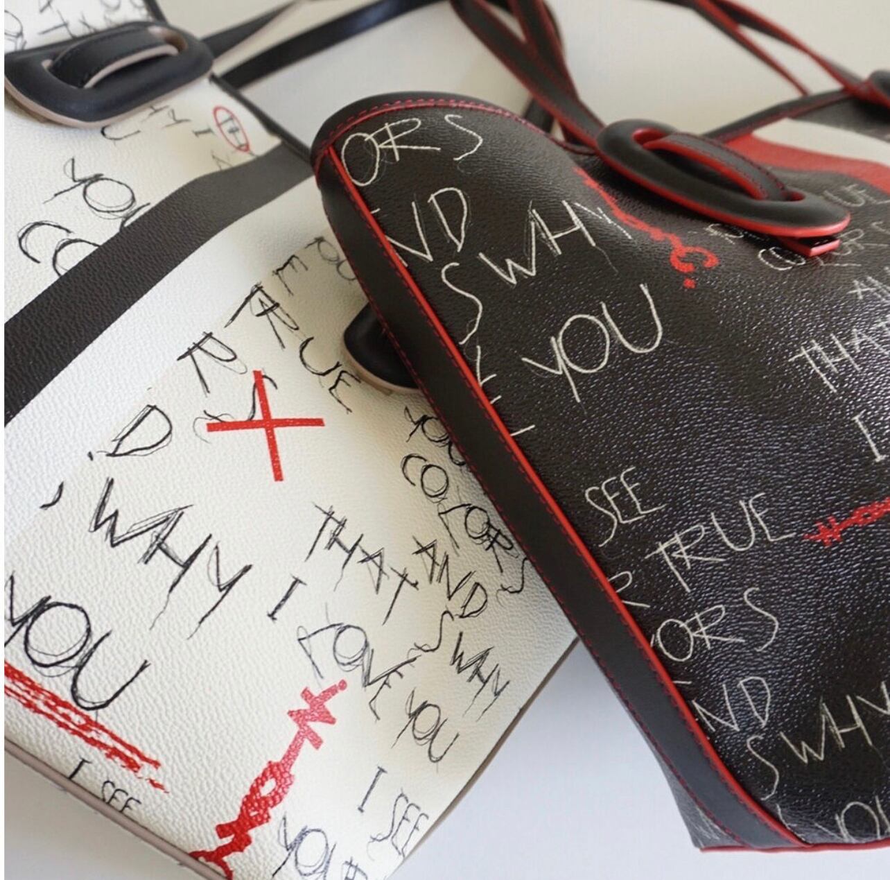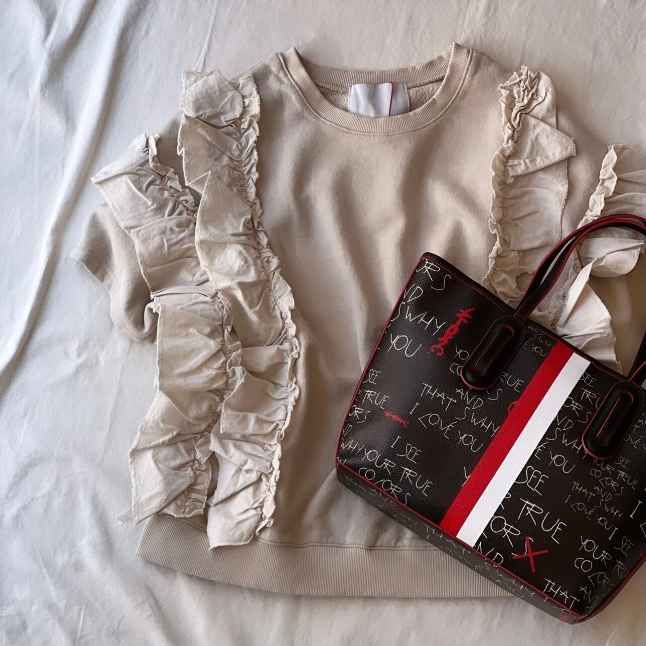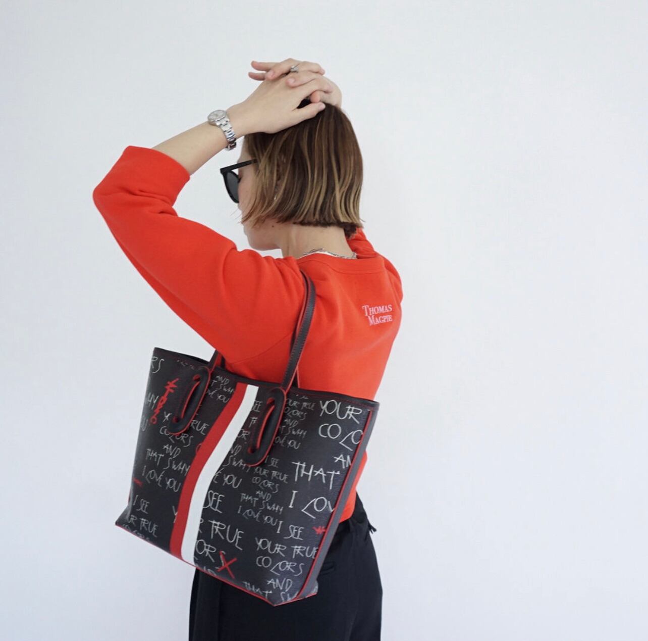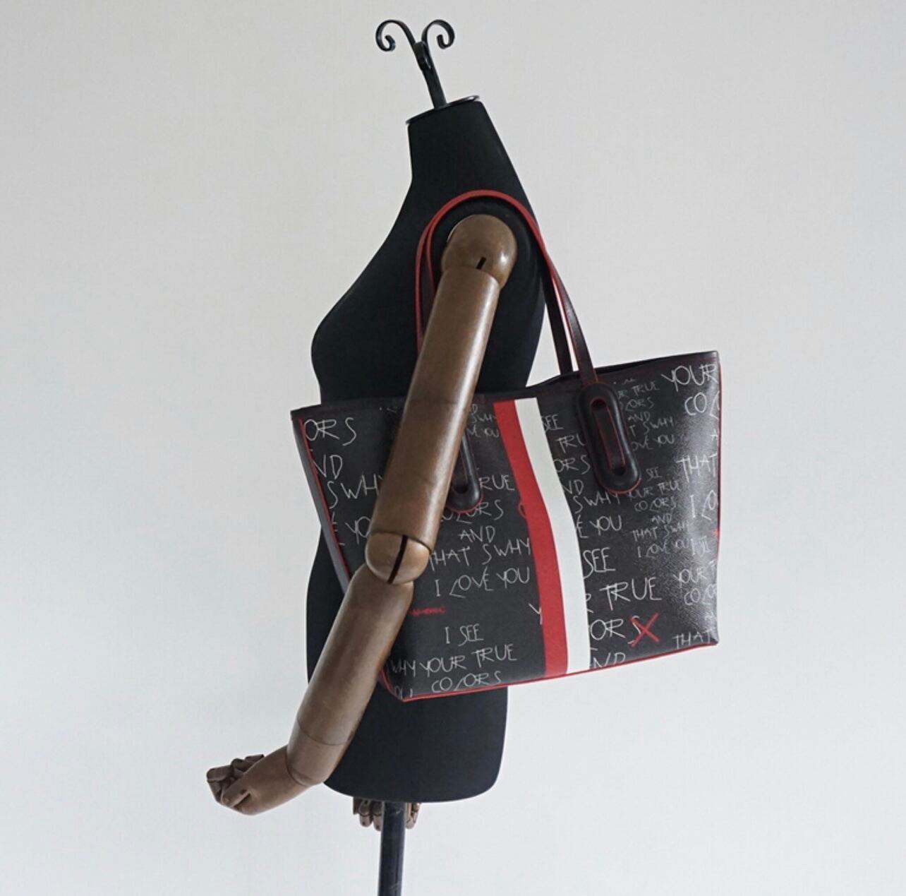 1986年にリリースされたシンディーローパー のTRUE COLORSの歌詞からロゴを作りました。以前もシンディーローパーの曲の歌詞でバッグのロゴを作ったことがあります。このカラーズという曲は説明が要らないほど有名な曲ですが、私も多くの方と同じくしてこの歌詞が大好きです。個人的に人として欠落していることが多いタイプだと大人になってから気づくことが多くなりました。いつも自分に自信がなく、神経質に物事を考えるのが通常運転でおおらかに考えることがあまりできないタイプです。歳を重ねてからも、いつも自分は少し変なのかな?と自信がなく心の中でいじけてしまいます。誰かに認めてもらおうと欲求不満で満たされていません。この曲はそのような心の穴を埋めてくれる、励ましの応援の歌のように響きます。またきっと自分に自信のない私のような人に勇気を与えてくれる歌ではないかなと思っています。悲しい時に大丈夫だよと言われたい時、誰も言ってくれないのとしたら、この曲で蓄電して元気になりましょうよ、という気持ちでこの歌詞の言葉を入れました。文字の細い線は悲しみ、儚い頼りない心情を表現しています。○×の赤文字は自分の欠点、長所にマルバツをつけてしまう心を表現しています。丸を自分で増やせて自分自身を認めてこの先も生きていけますように、などとなんとなく考えています。自分のことを堂々と怖がらずに表現しても良いんだよ、という歌詞とシンディーの歌声が心に沁みます。