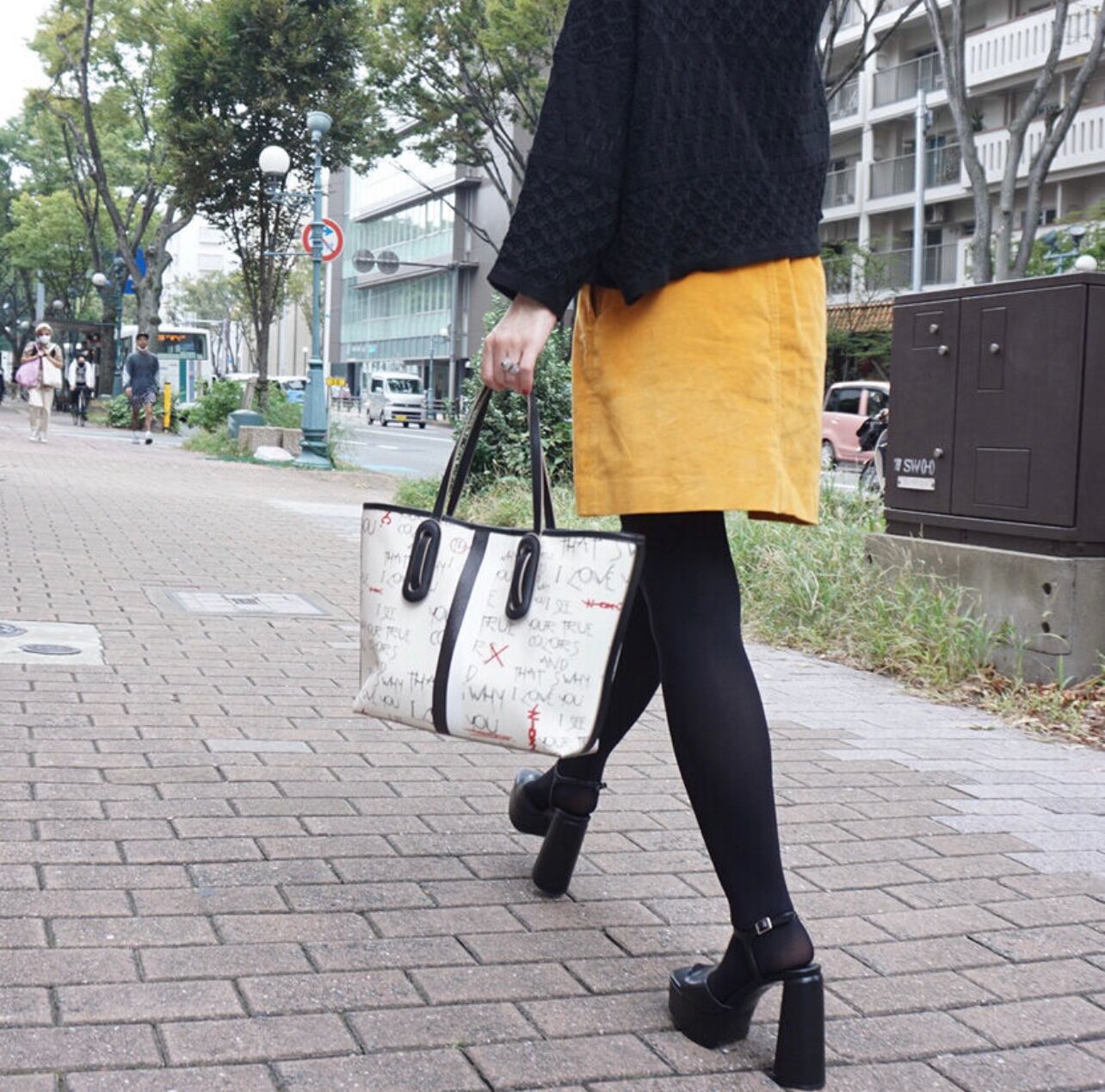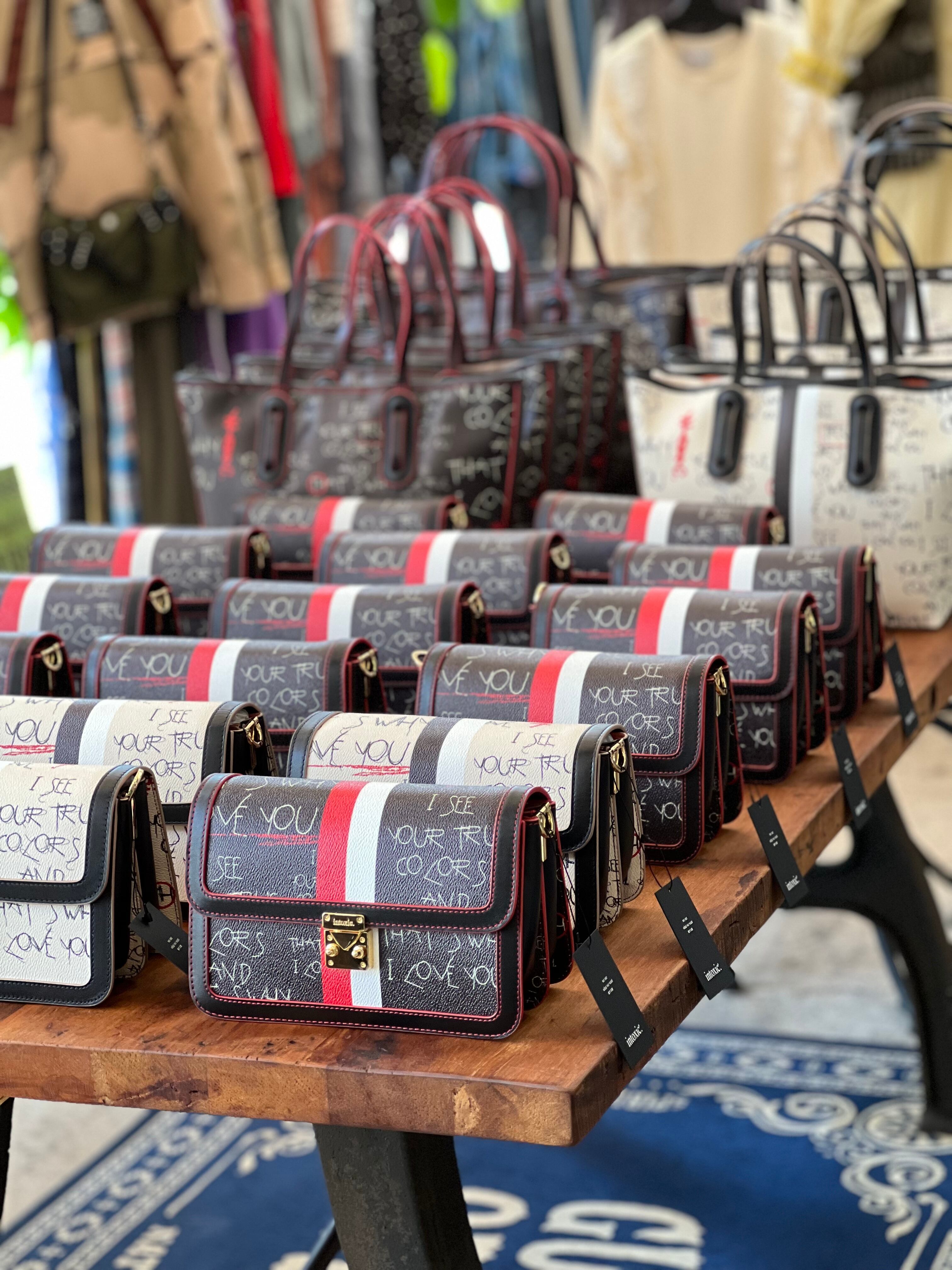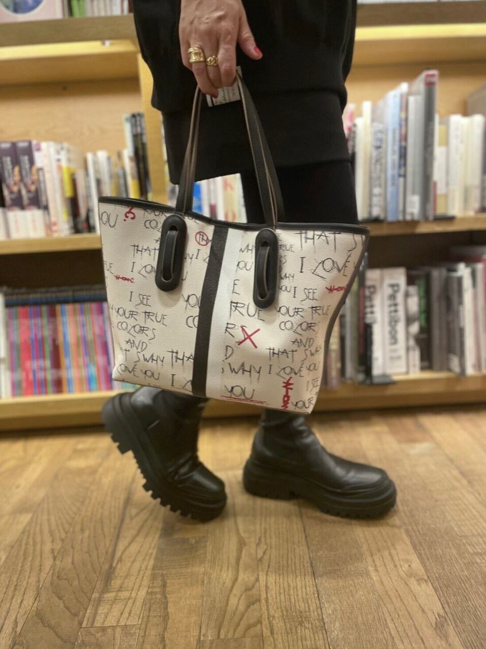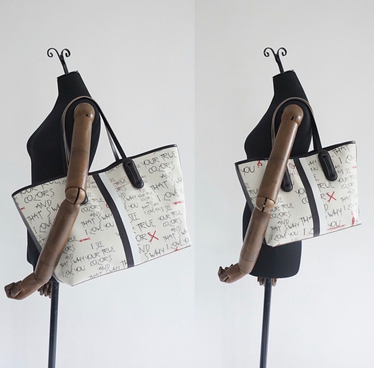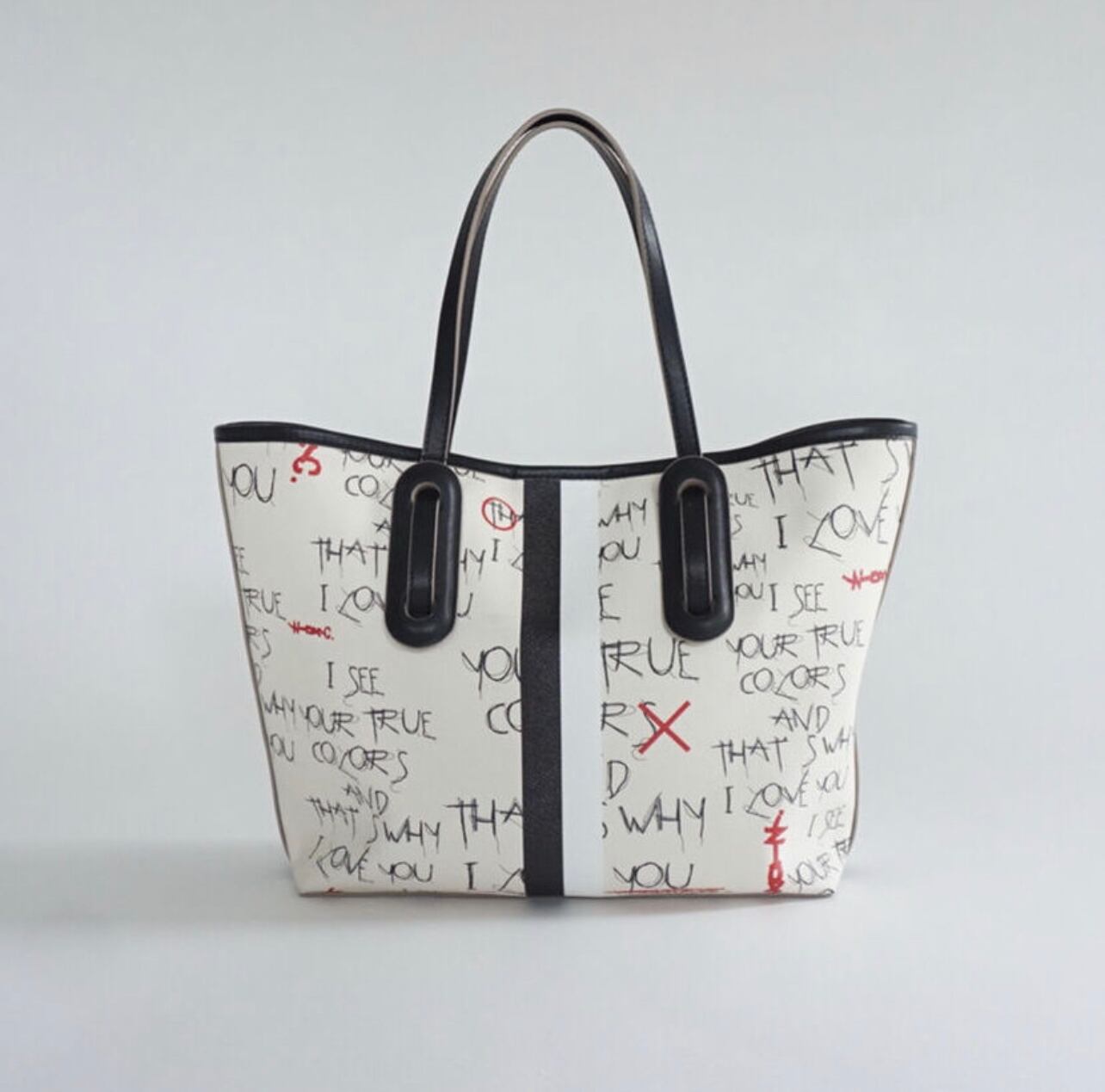 1986年にリリースされたシンディーローパー のTRUE COLORSの歌詞からロゴを作りました。以前もシンディーローパーの曲の歌詞でバッグのロゴを作ったことがあります。このカラーズという曲は説明が要らないほど有名な曲ですが、私も多くの方と同じくしてこの歌詞が大好きです。個人的に人として欠落していることが多いタイプだと大人になってから気づくことが多くなりました。いつも自分に自信がなく、神経質に物事を考えるのが通常運転でおおらかに考えることがあまりできないタイプです。歳を重ねてからも、いつも自分は少し変なのかな?と自信がなく心の中でいじけてしまいます。誰かに認めてもらおうと欲求不満で満たされていません。この曲はそのような心の穴を埋めてくれる、励ましの応援の歌のように響きます。またきっと自分に自信のない私のような人に勇気を与えてくれる歌ではないかなと思っています。悲しい時に大丈夫だよと言われたい時、誰も言ってくれないのとしたら、この曲で蓄電して元気になりましょうよ、という気持ちでこの歌詞の言葉を入れました。文字の細い線は悲しみ、儚い頼りない心情を表現しています。○×の赤文字は自分の欠点、長所にマルバツをつけてしまう心を表現しています。丸を自分で増やせて自分自身を認めてこの先も生きていけますように、などとなんとなく考えています。自分のことを堂々と怖がらずに表現しても良いんだよ、という歌詞とシンディーの歌声が心に沁みます。