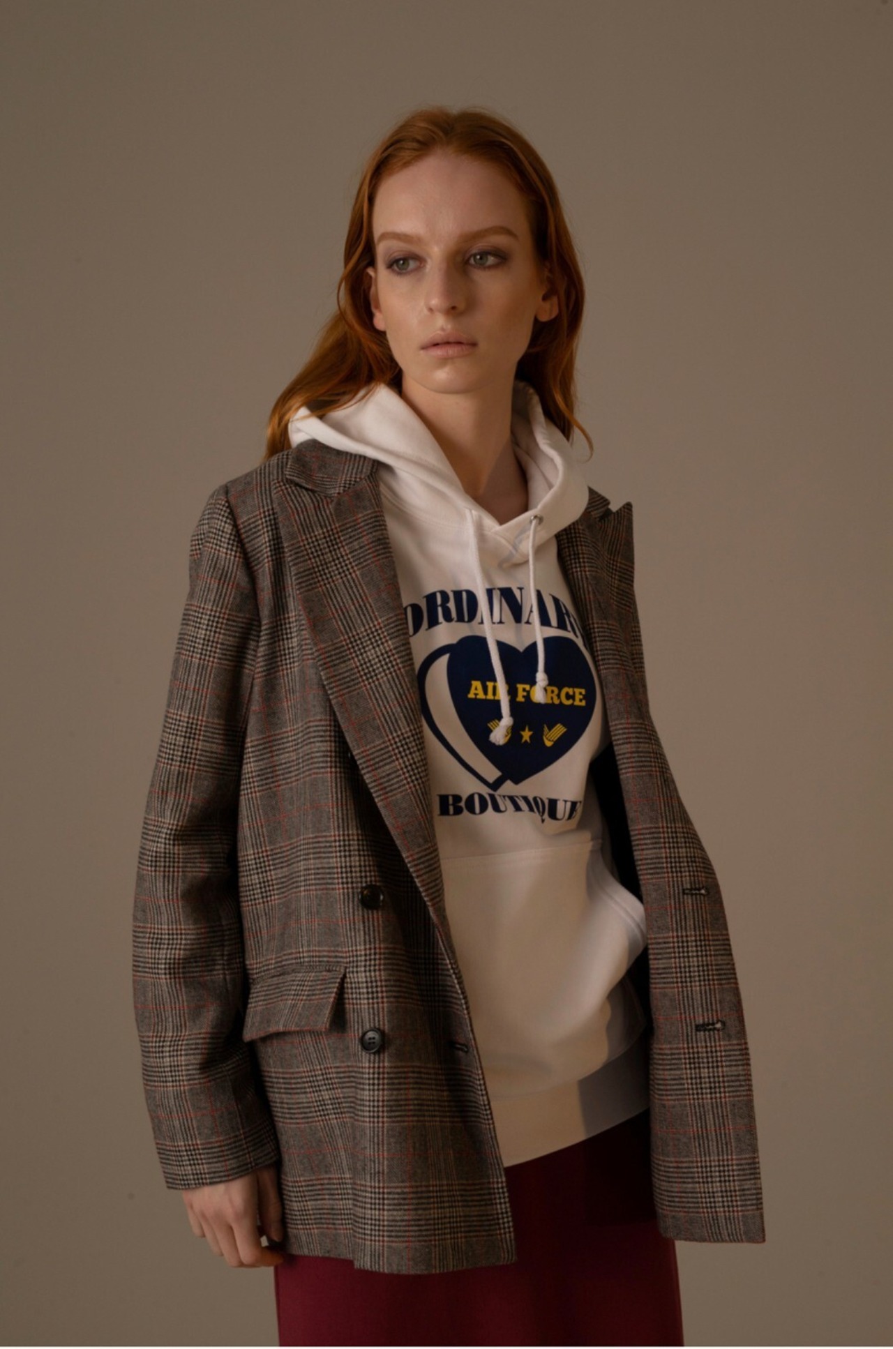 象徴的なミリタリーグラフィックにハートのモチーフを加えたチャーミングなデザインはアン チメッセージを潜ませています。フーディ本体のサイジングはグラフィックデザインとのバランスを図ってコンパクトに設定。