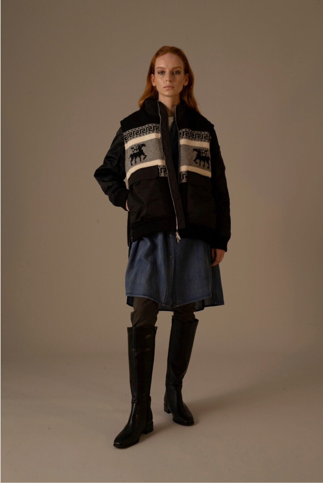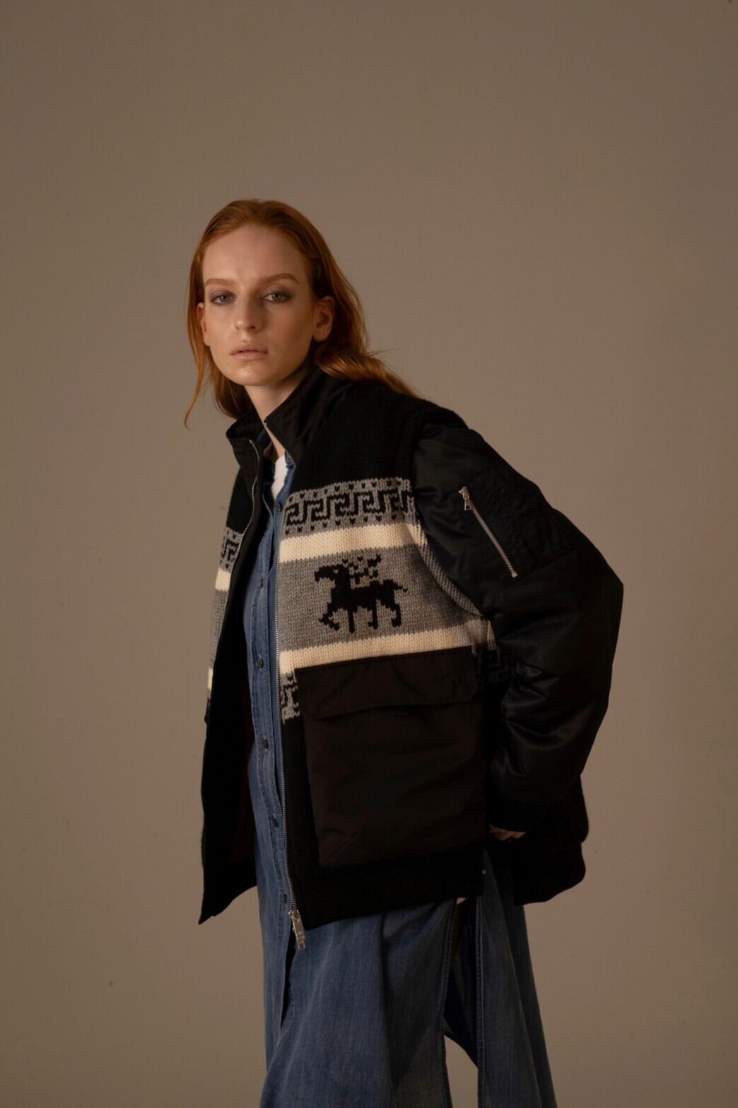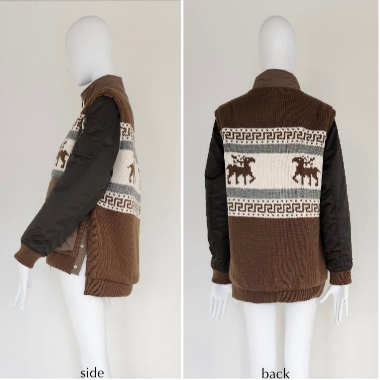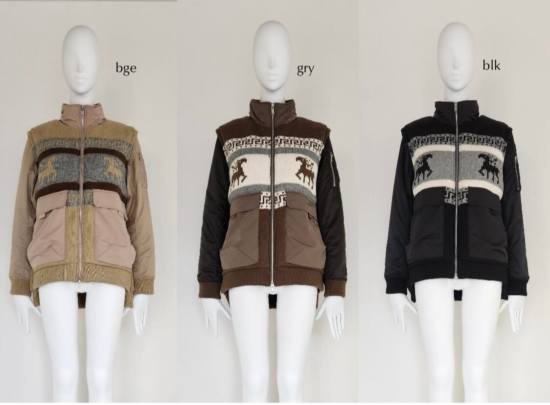 カウチンニットとMA-1をドッキングした様なデザインの中綿ブルゾンです。袖はファスナーで 脱着可能でニットベストとしても着用できるので秋~真冬と長い期間着まわせます。ゆるっと