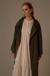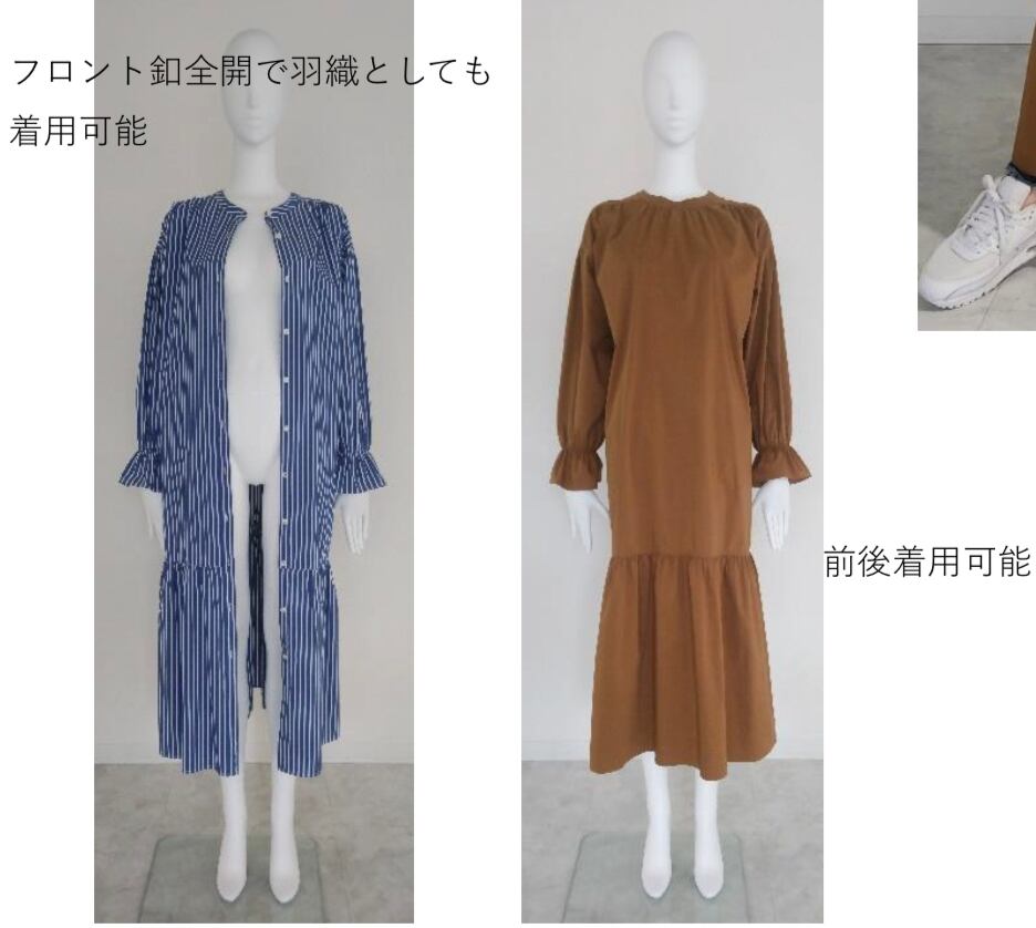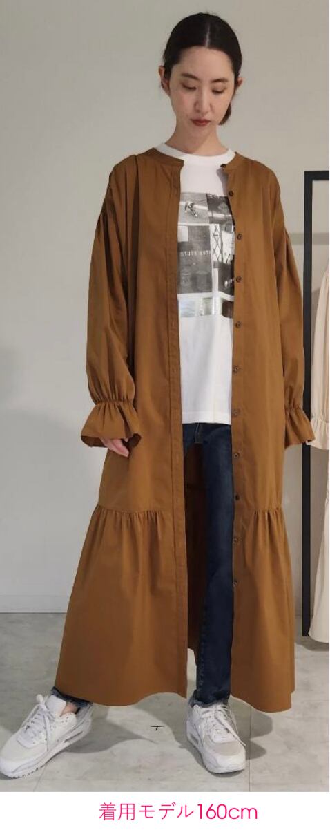 【DESIGN】 前後着用可能で、フロント釦を全開にして羽織としても着用できる3wayバンドカラーのシャツ ワンピースです。ティアード切り替えとふんわりとしたフリルの様な袖口でフェミニンさをプ ラス。袖口はゴム仕様でたくし上げも簡単です。ウォッシュ加工による程よいシワ感がヴィン テージ感をプラスし、表情のある雰囲気に仕上がっています。昨年よりシルエットをややスッ
