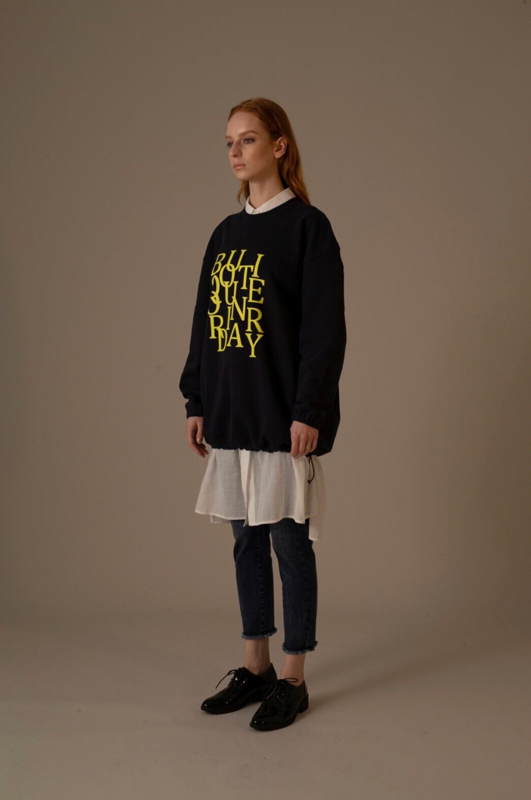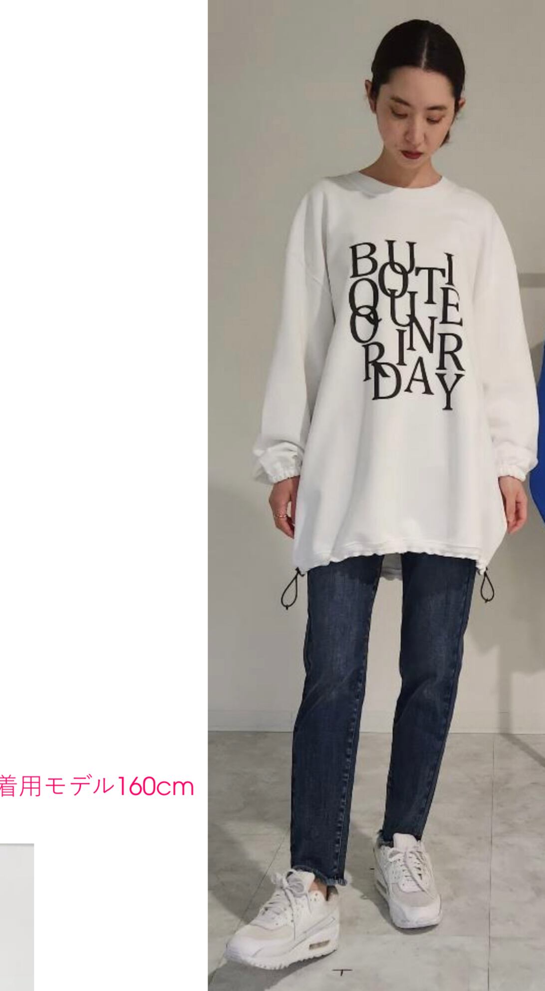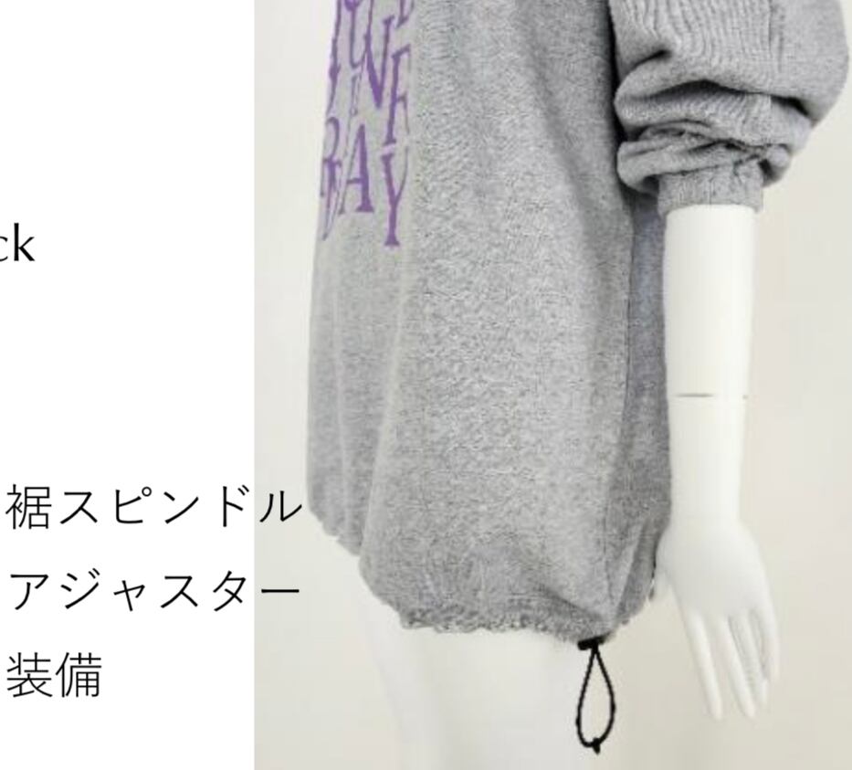 【DESIGN】 XXLのオーバーサイズ裏毛トレーナーの裾にスピンドルを通したリメイク風アイテム。裾のス ピンドルを調整し、着丈やフォルムに変化を持たせる事ができるので、様々な着こなしをお楽