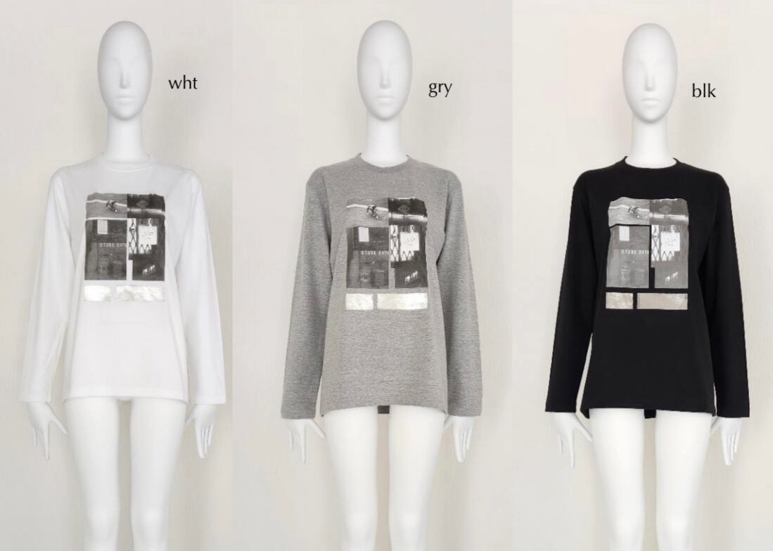 トしたクルーネックロングスリーブTシャツ。フォトグラフィックの下段に配置した箔プリン トもさりげないポイントになっています。