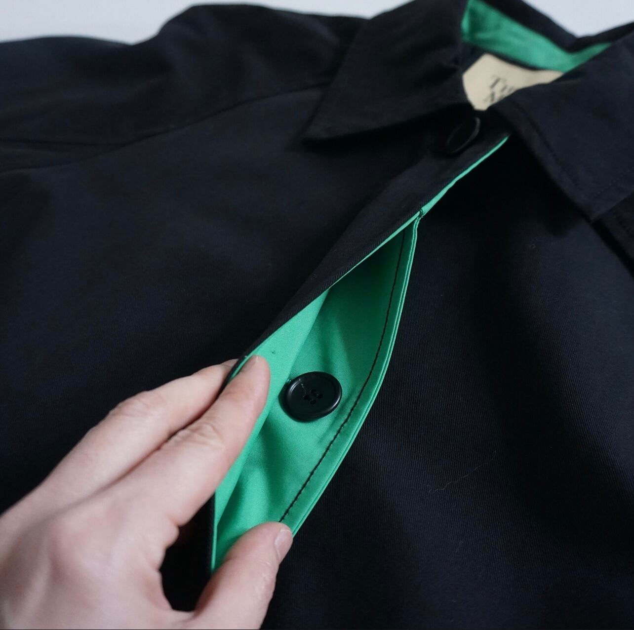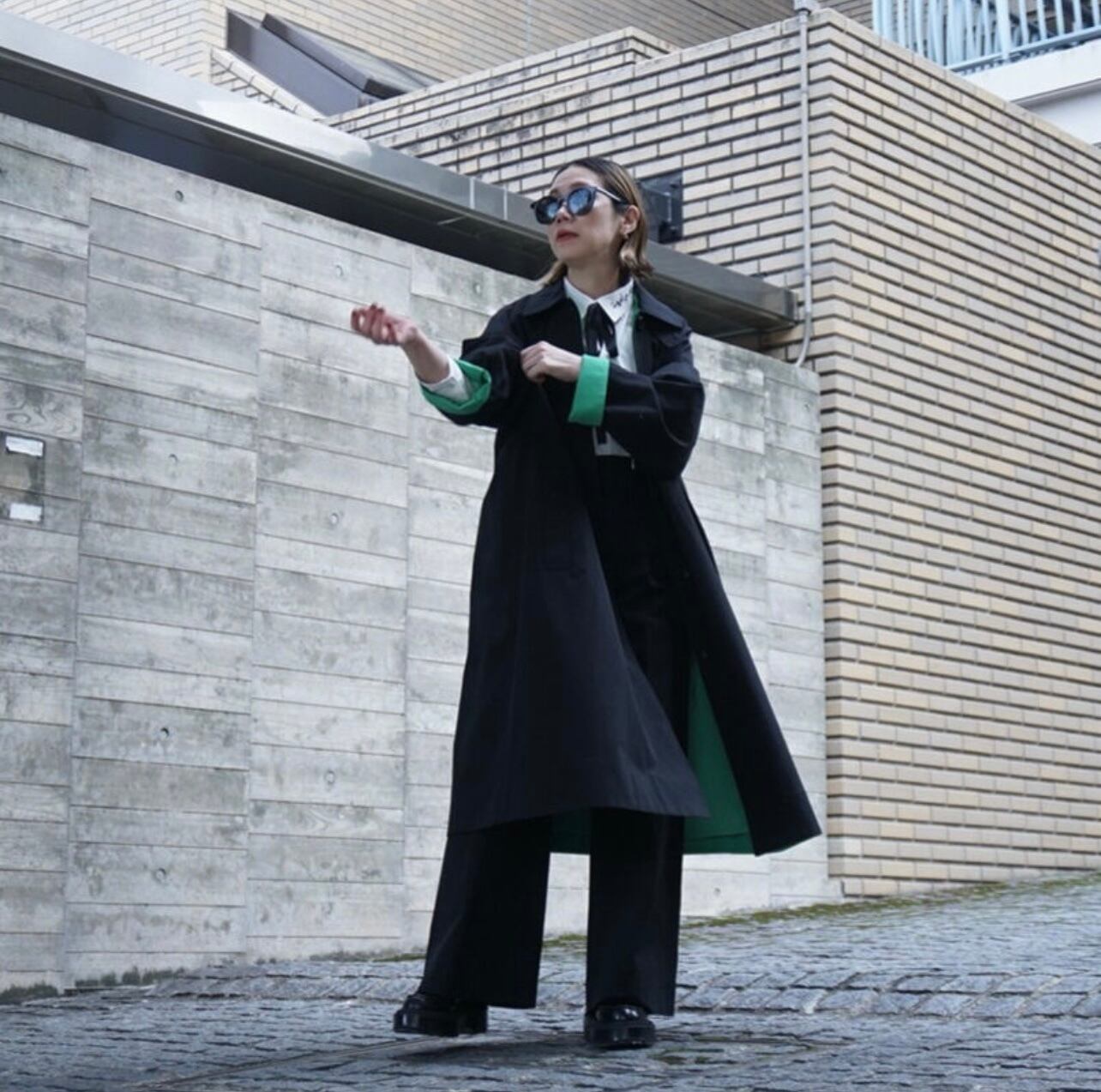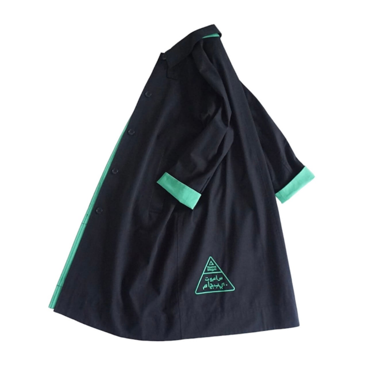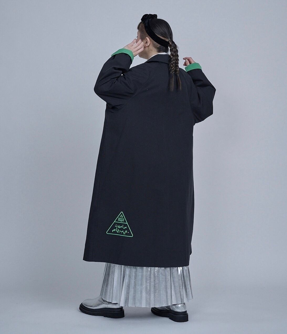 デザインする時に、いつも心掛けている事は、なるべくなら身長を限定しないようにと思っています。着丈は気になりませんが、小柄な方は袖丈だけは、合わないと違和感を感じで美しく着ることができないような気がする方が多いと思います。最近はシャツもコートも袖丈が長い方がファッション性があると思いますが、小柄な方はやはり袖が長いものは抵抗感があると言われます。今回もこのコートは袖を曲げる事で、配色見せができる作りにしています。違和感なく小柄さんにフィットさせることができます。春は短めに曲げて袖裏のグリーンを見せて配色を楽しめます。真冬は袖の折り返しはせずに長めに着用できます。チラリと見える裏地のグリーン配色もとても可愛いと思います。また同じくグリーンの刺繍を今回は背面の裾に入れました。トライアングルの刺繍は、今回の制作テーマでもあるマズローの5段階欲求のヒエラルキーを表現しています。アラビア文字でTHOMAS MAGPIEのブランドネームを刺繍で入れてみました。主張の少ないシンプルなデザインの中に、グリーンの挿し色が映えて、普段に合わせやすいコートに仕上がったのではないかと思います。トレンチほど着ているゴワツキがないので人気なのだそう。製作チームスタッフにもとても人気で、購入を決めている人も多いので、幅広く受け入れやすく使えるコートなのだと実感しました。またコットンなので、扱いがしやすくホームクリーニング可能。(コットンなので縮む可能性があります。クリーニング推奨)大きめの刺繍が入る割には、プライスも魅力の3万円代です。